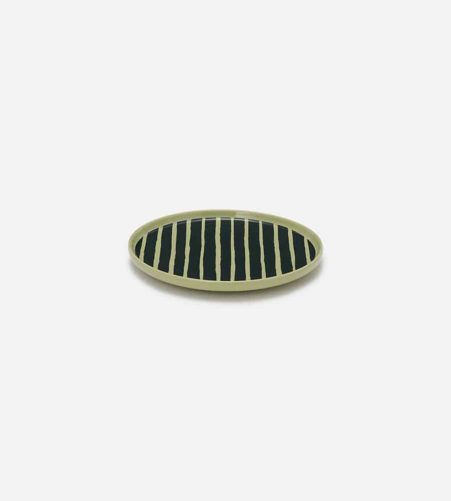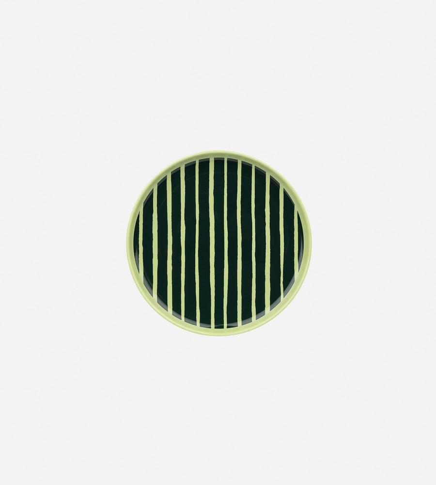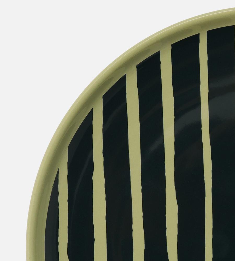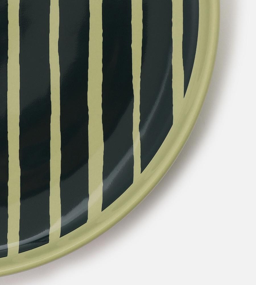 朝の食卓ではトーストなどに、ランチタイムやディナーではちょっと大きめの取り分け皿にと、多彩な活躍が期待できる20cmサイズのプレート。温もりを感じさせる手描きタッチのストライプ柄で、食卓に安らぎと華やかさをもたらします。スタッキングしやすいデザインのため、複数枚揃えておくのもおすすめです。