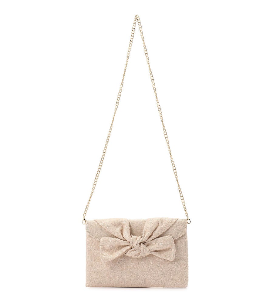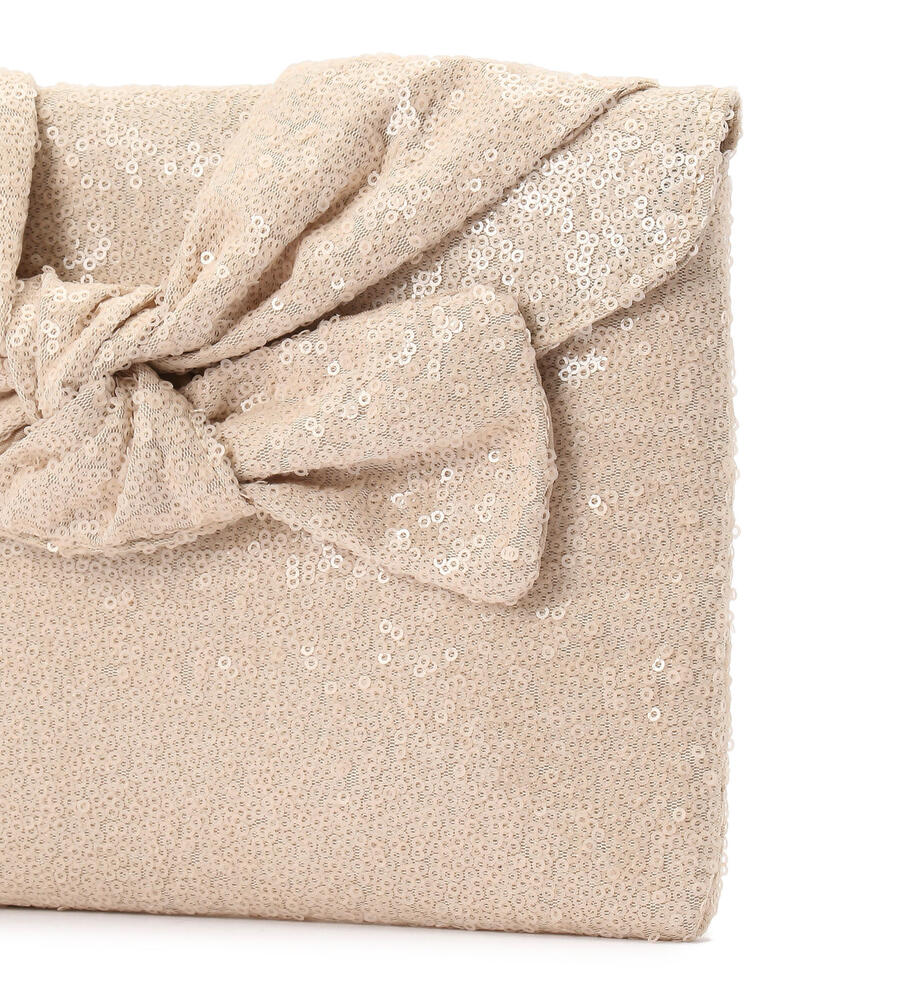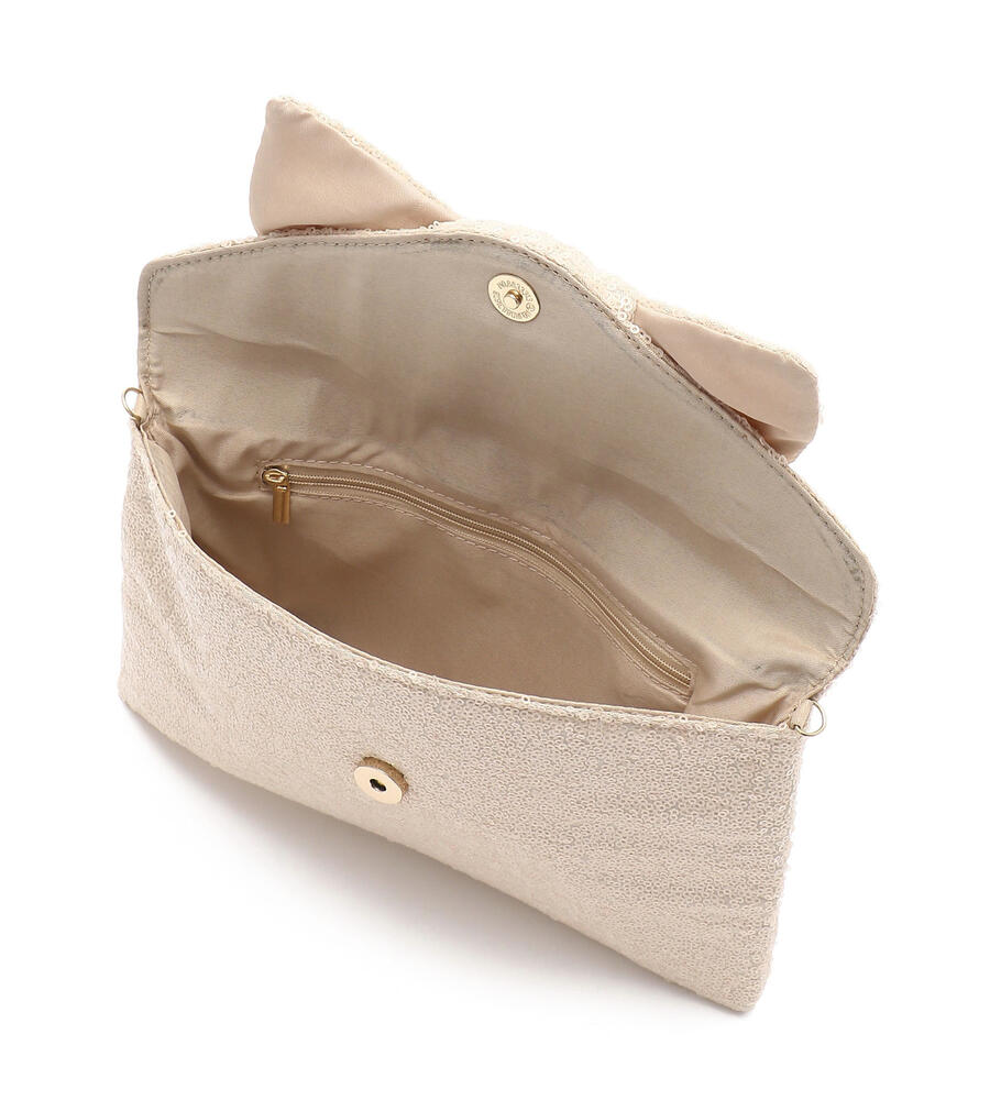 キュッと結んだリボンディテールがアクセントになった、愛らしさ満点のショルダーバッグ。上品なスパンコールを全面にあしらったルックスは、パーティーなどの華やかなシーンにもぴったり。フラップはマグネット開閉、内側には小物収納に便利なファスナーポケットを備えています。
