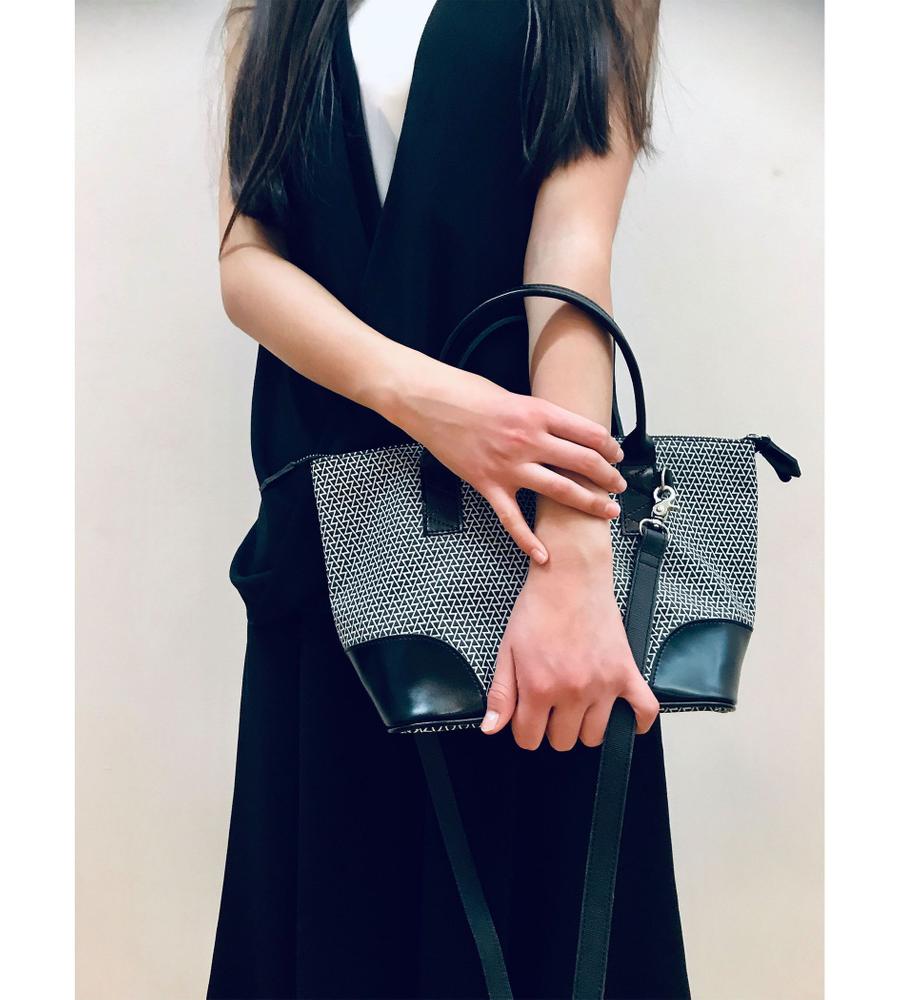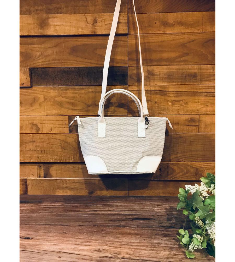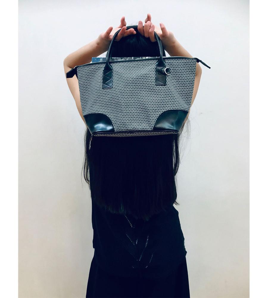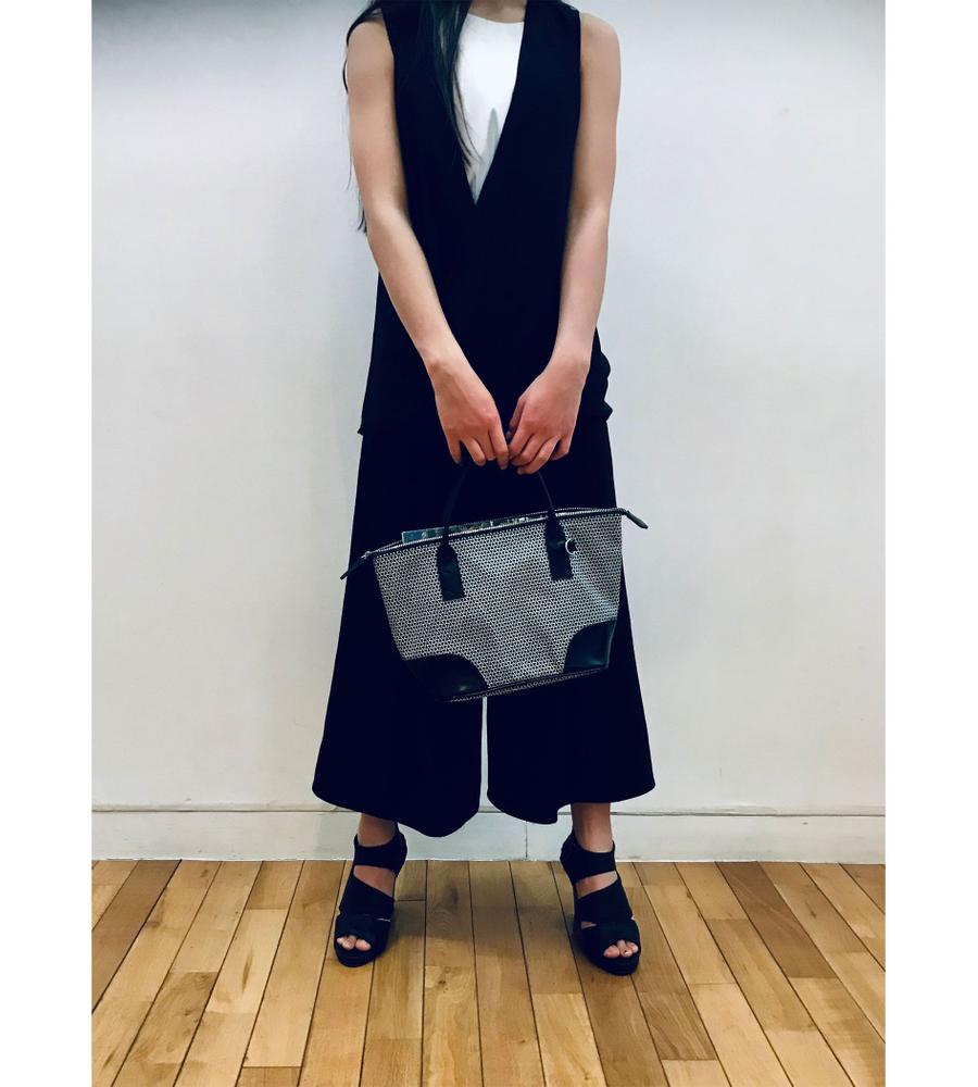 表生地にはPVCコーティングを施しているので、水に強く手入れしやすい素材。開口部はファスナーで収納も安心。B5サイズが収納できるコンパクトなサイズで気軽に持ち運び頂けます。持ち手・パイピング・ハカマ部分には牛革(シブ革)が施され、カジュアルの中にも大人のラグジュアリー感が漂うデザインになっています。
