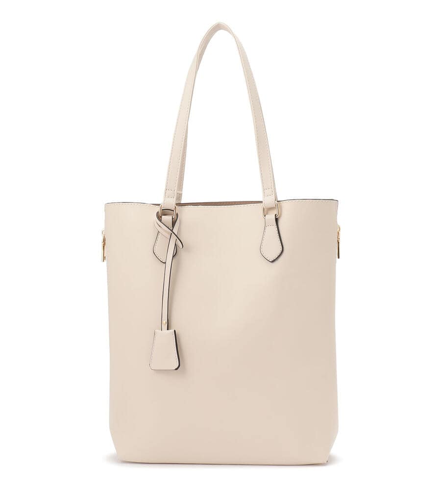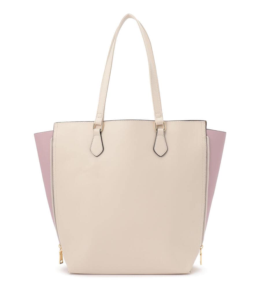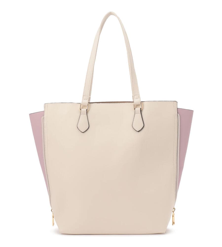 サイドのファスナーを開ければマチありフォルムにアレンジすることができるチャーム付きトートバッグ。マチの部分は配色で切り替え、カジュアルな雰囲気も楽しめるよう遊び心をプラスしています。手持ちも、肩掛けもできるスリムな持ち手がスタイリッシュな印象。内部にはポケット付き。