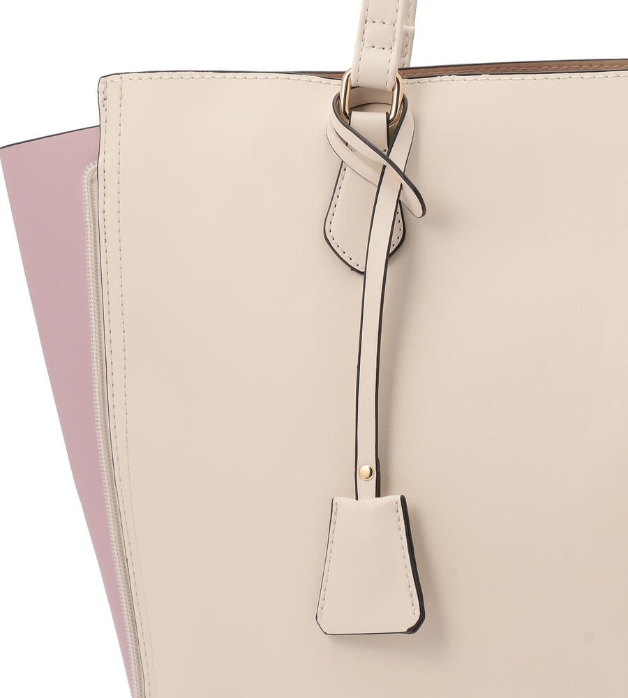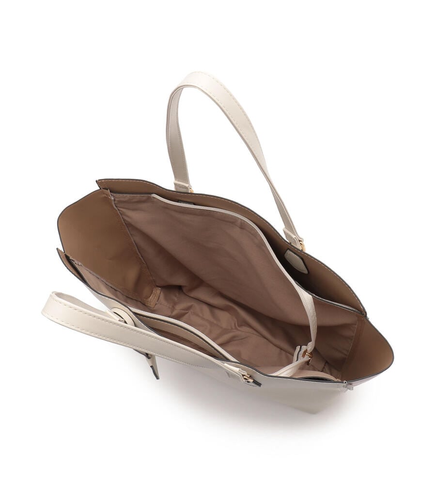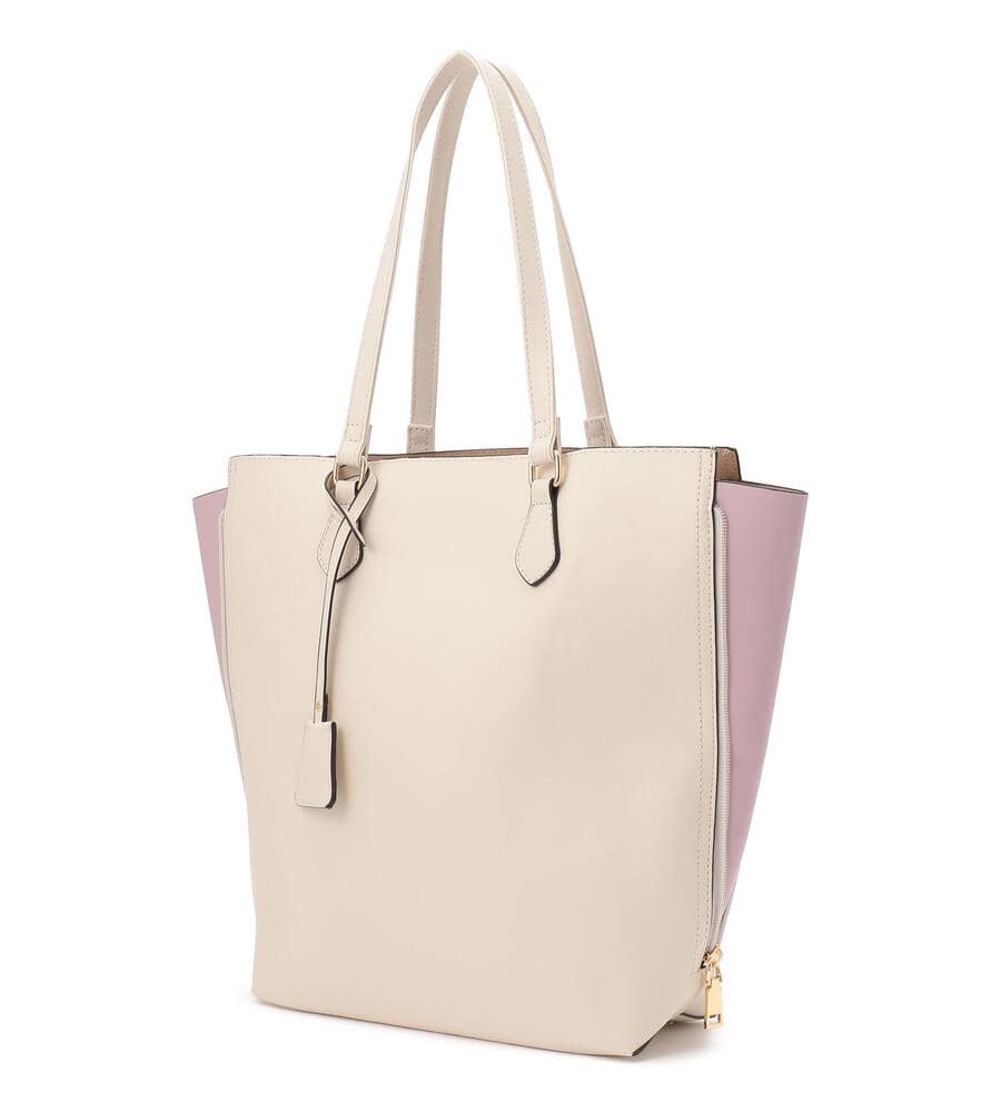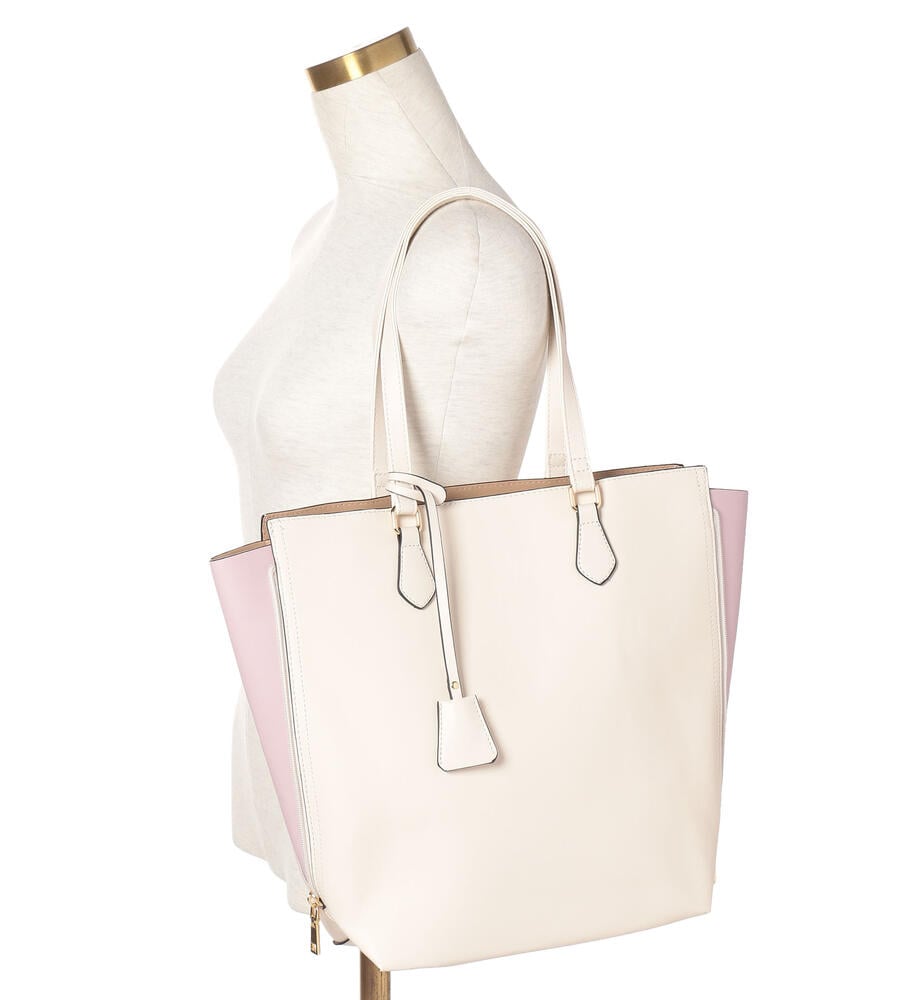 サイドのファスナーを開ければマチありフォルムにアレンジすることができるチャーム付きトートバッグ。マチの部分は配色で切り替え、カジュアルな雰囲気も楽しめるよう遊び心をプラスしています。手持ちも、肩掛けもできるスリムな持ち手がスタイリッシュな印象。内部にはポケット付き。