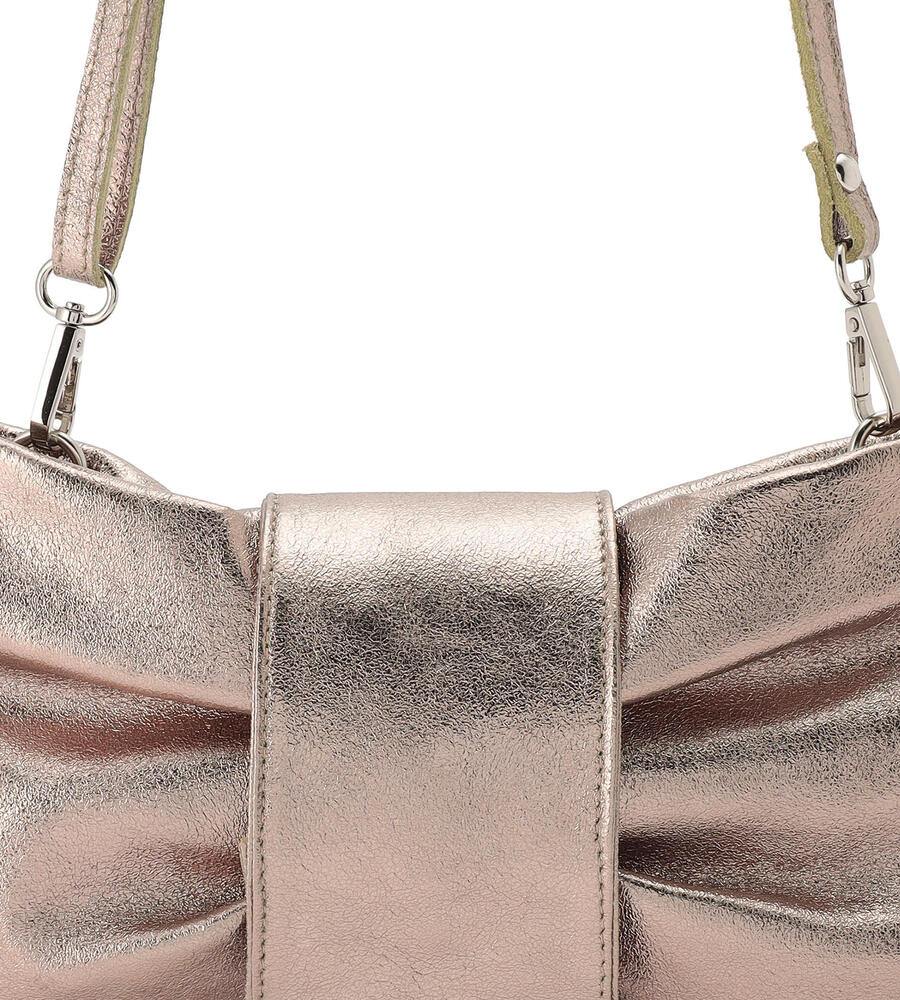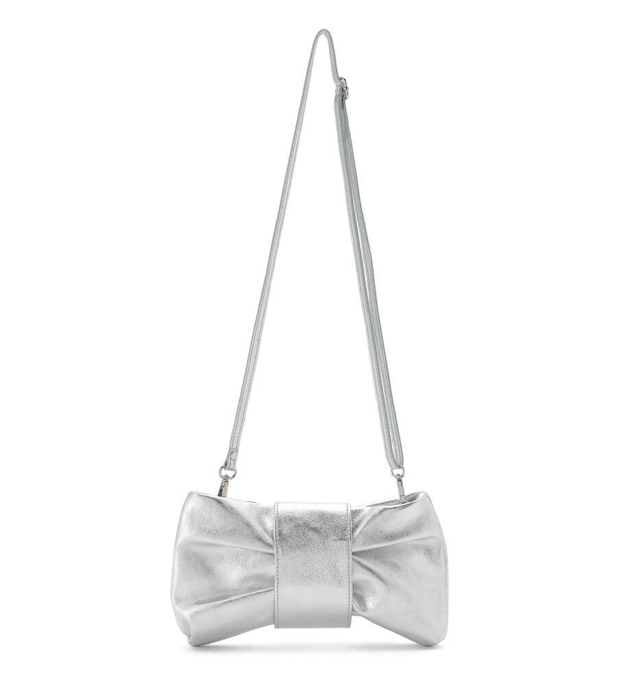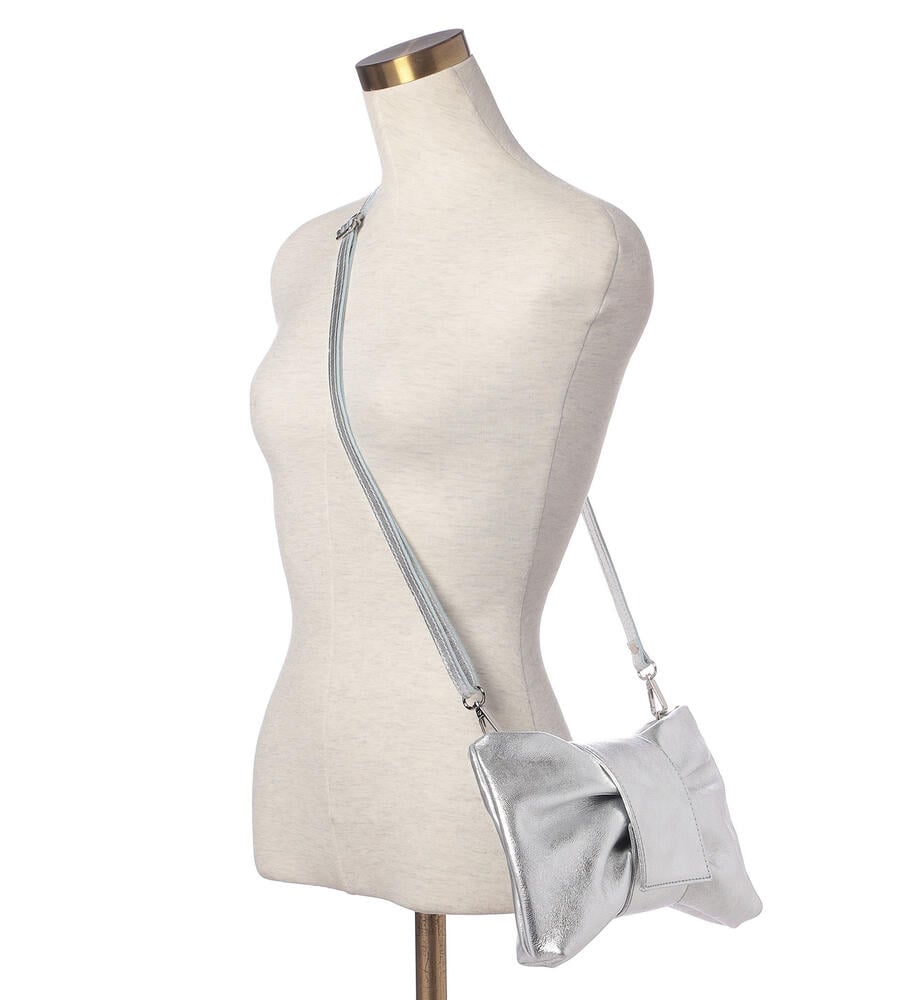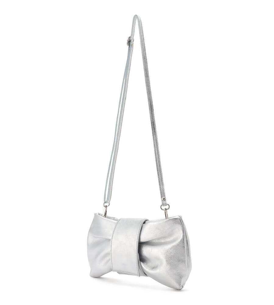 リボンをモチーフにした愛らしいルックスが魅力のレザーバッグ。スリムなショルダーベルトは長さ調整が可能になっており、取り外せばクラッチバッグとしてもお使いいただけます。内部にはファスナーポケット付き。着こなしのアクセントになるメタリックカラーと定番ブラックで展開したアイテム。