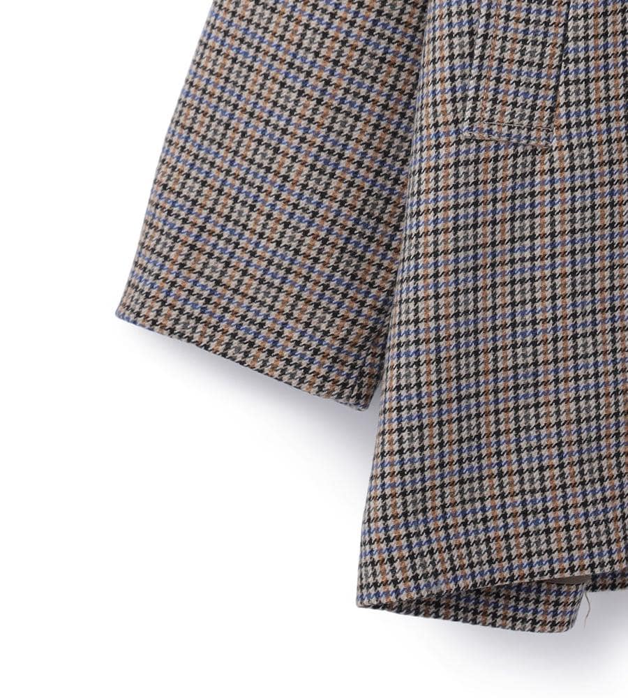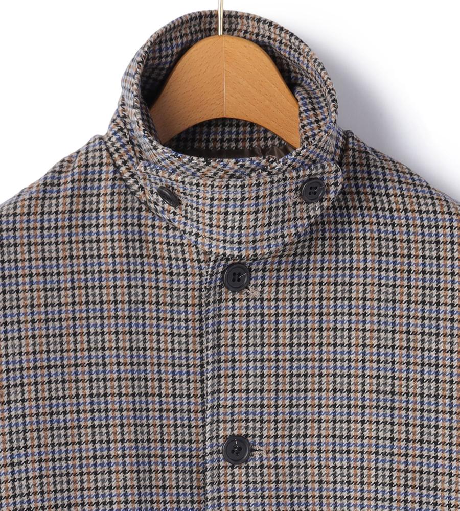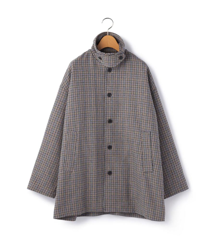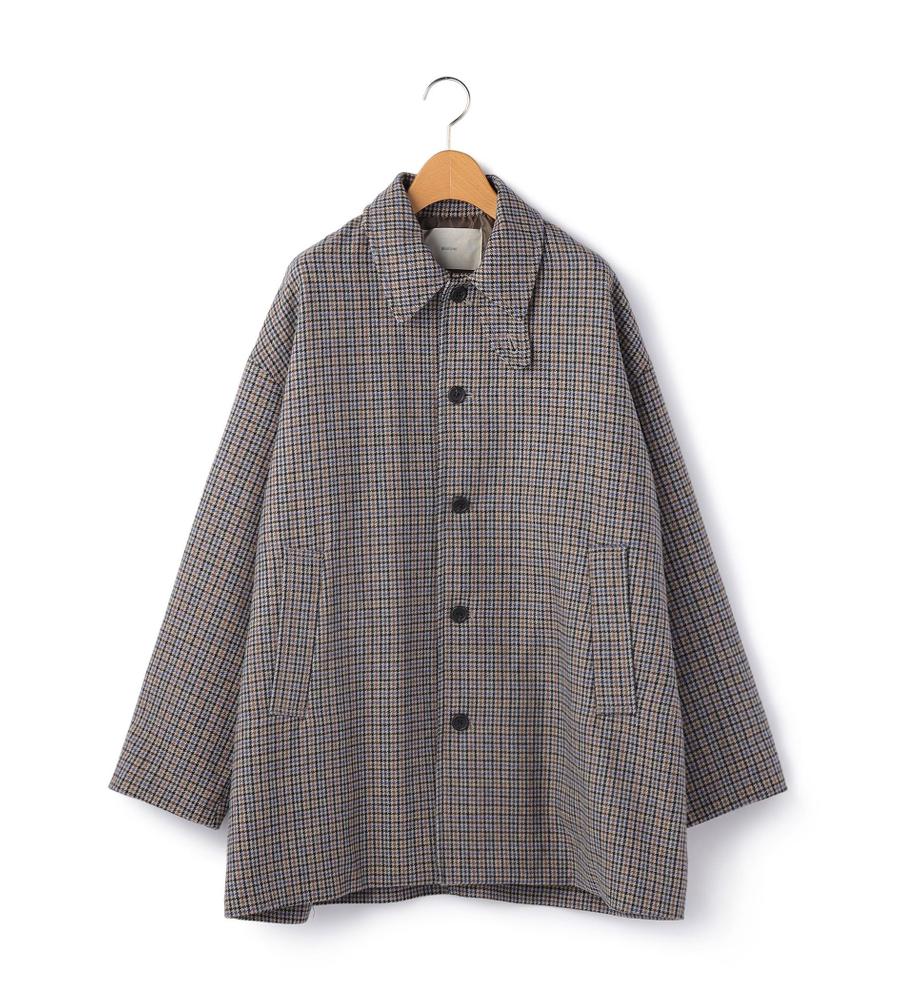 クラシカルなムードのガンクラブチェック柄がおしゃれなステンカラーミドル丈コート。フロントはシンプルなシングルボタンに首元のチンストラップがおしゃれなデザインアクセント。モダンなムードのゆとりのあるシルエットは重ね着しやすいのもポイント。スタイリッシュなお出かけコーディネートが完成するアイテムです。
