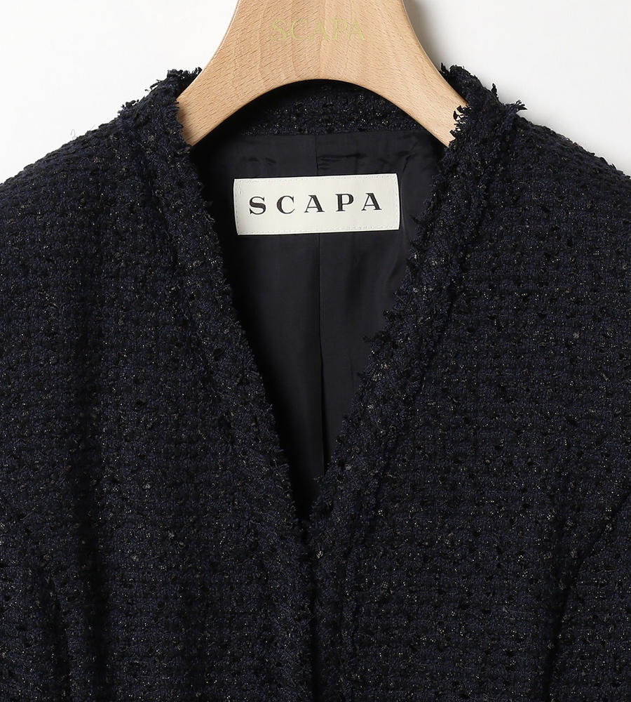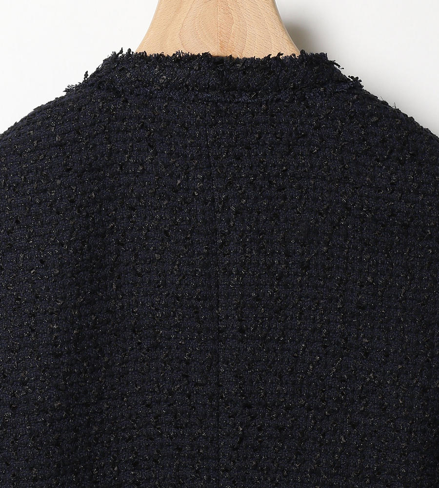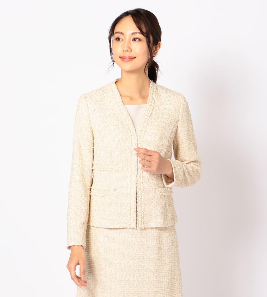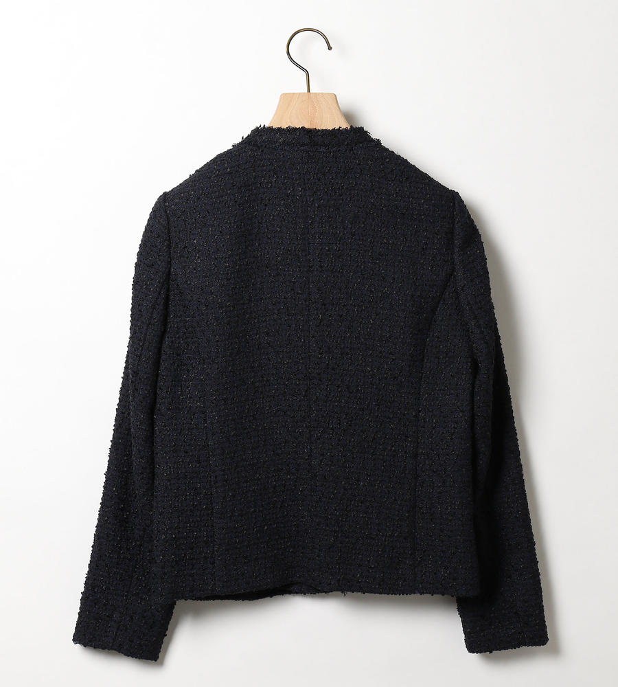 味わい深い独特の表情を見せる、肉厚なツイード生地を使用したノーカラージャケット。シャープなVゾーンが顔周りをスマートに演出。フロントをノーボタン仕様とすることですっきりとした印象に。上品かつシックなカラーでデザインしているので、さまざまなコーディネートに取り入れやすくなっています。