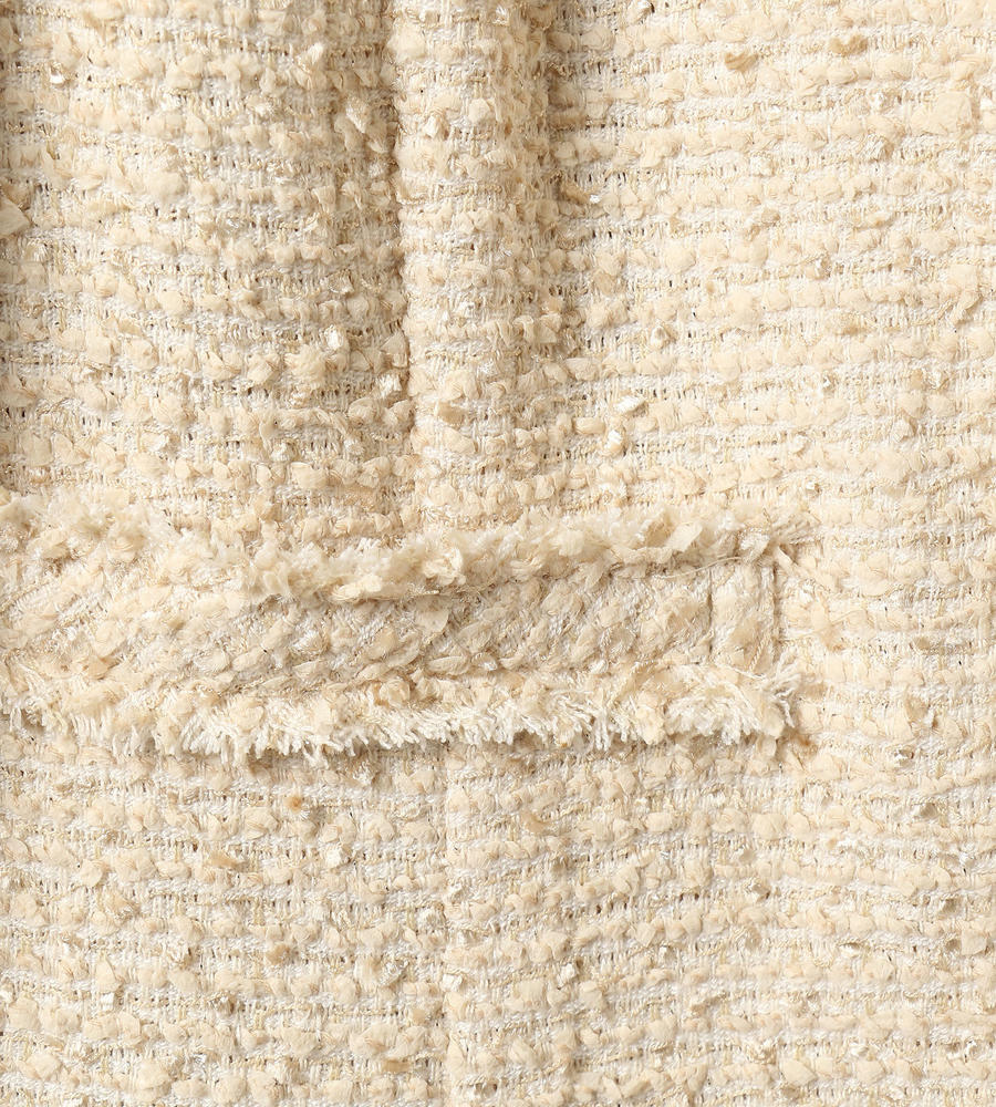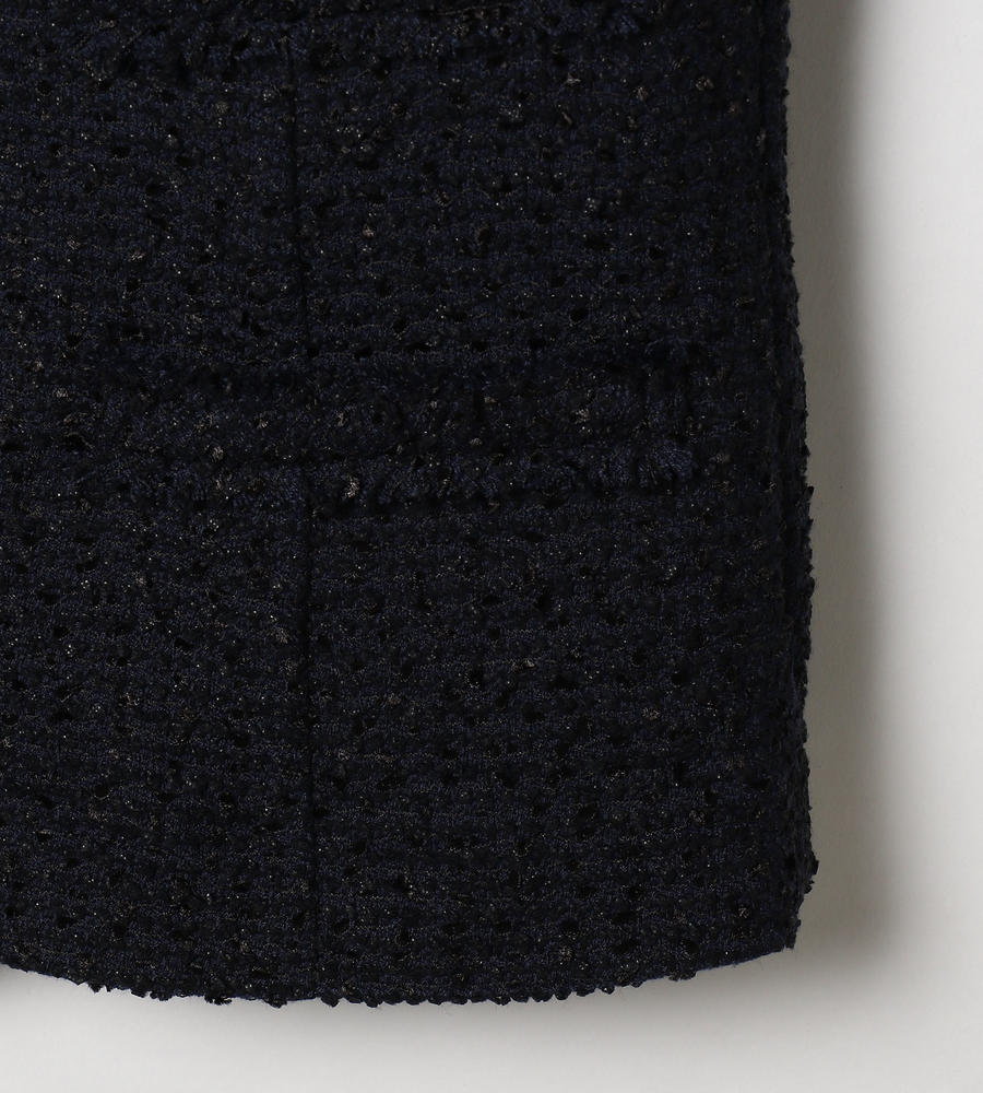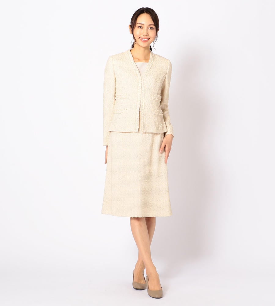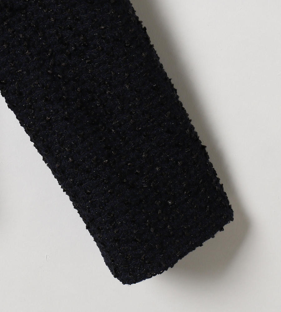 味わい深い独特の表情を見せる、肉厚なツイード生地を使用したノーカラージャケット。シャープなVゾーンが顔周りをスマートに演出。フロントをノーボタン仕様とすることですっきりとした印象に。上品かつシックなカラーでデザインしているので、さまざまなコーディネートに取り入れやすくなっています。