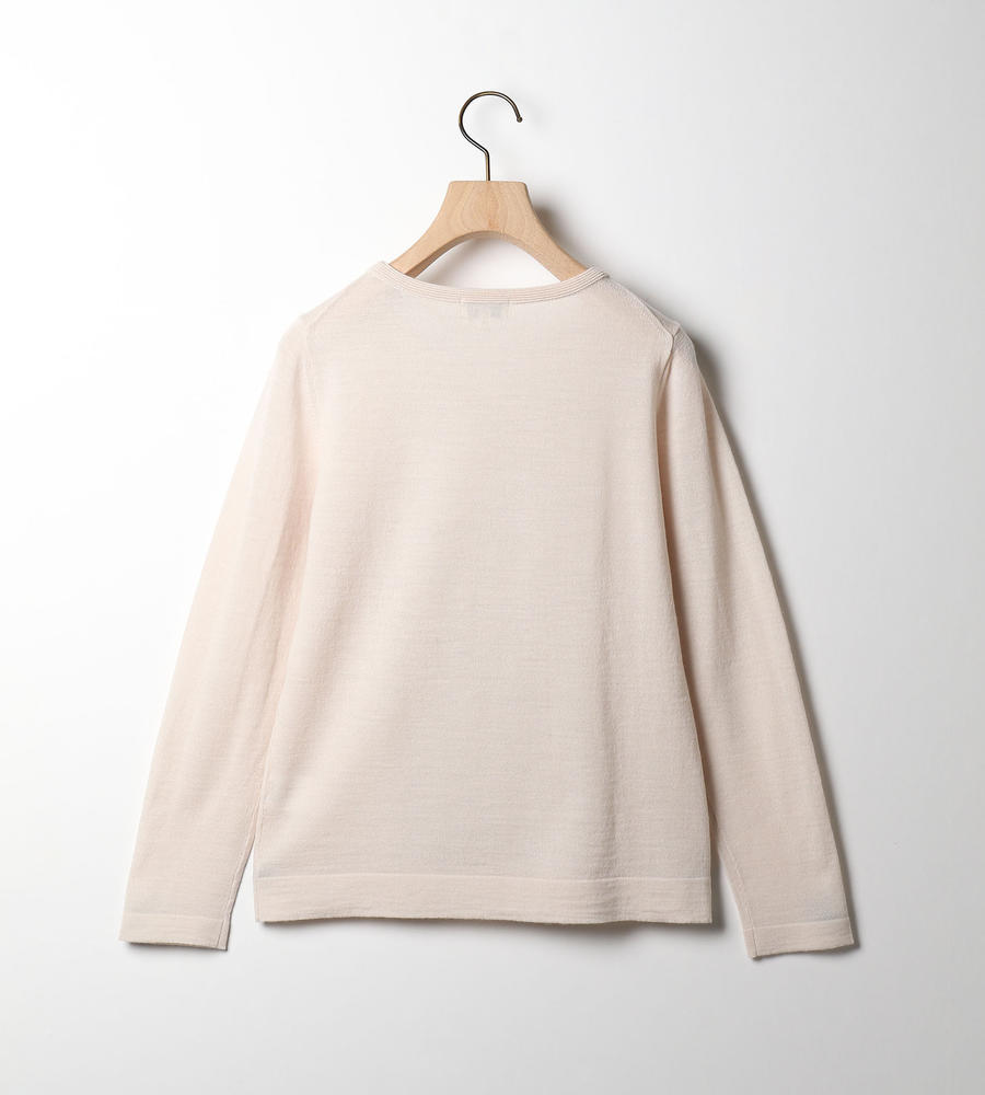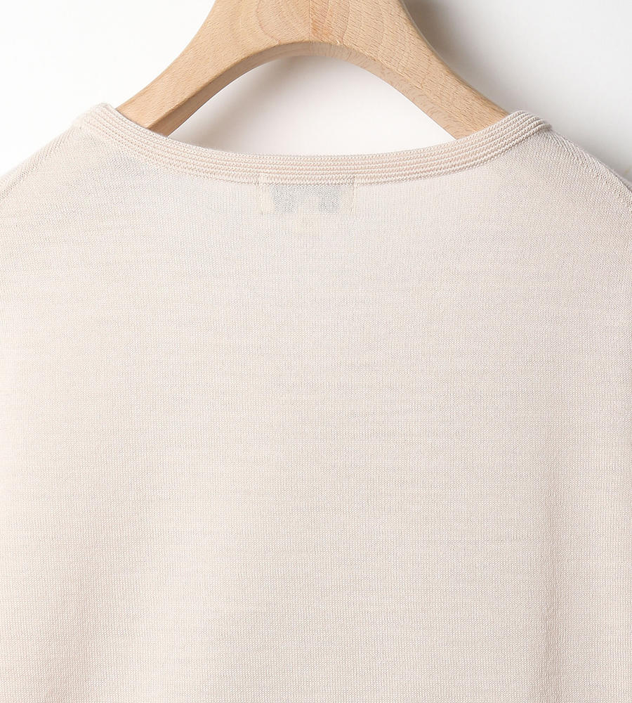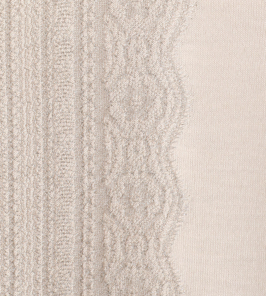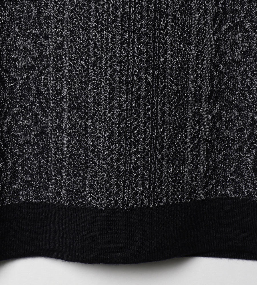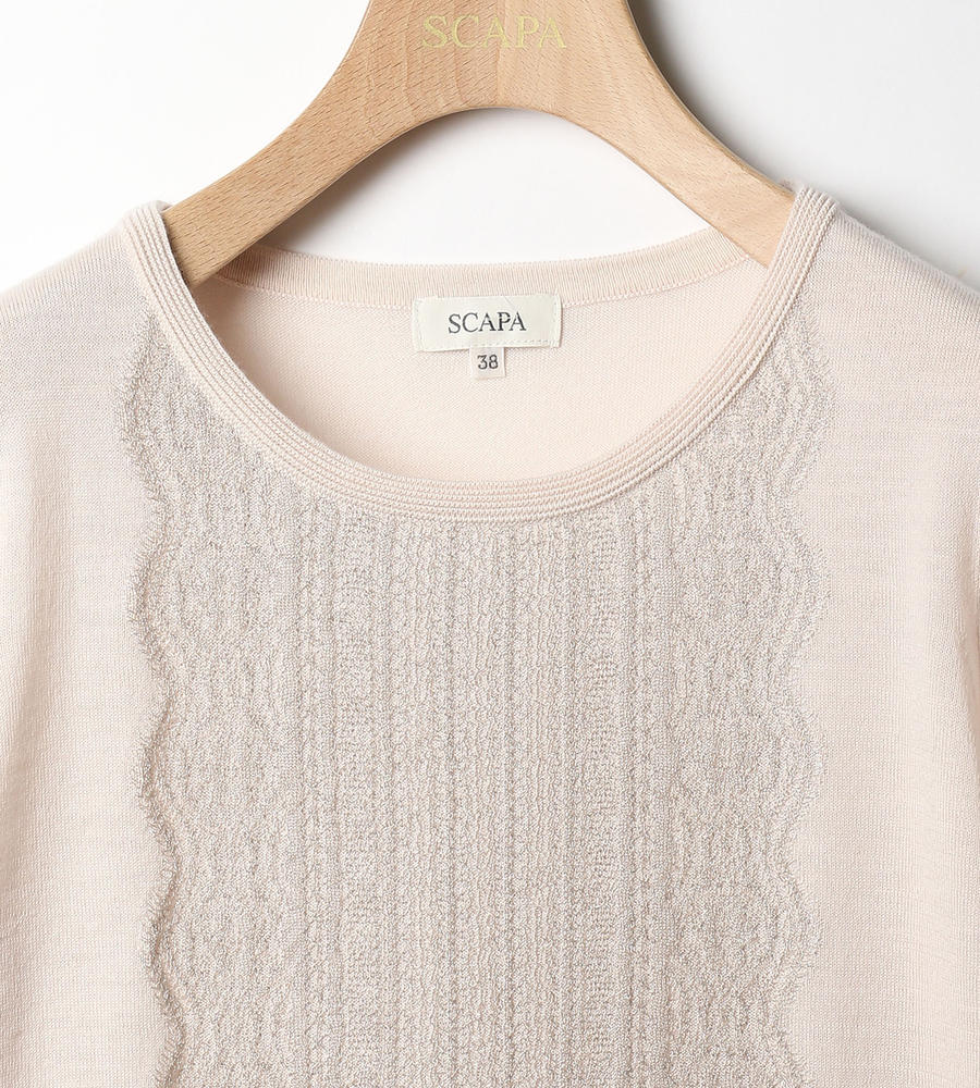 クリーンなハイゲージ仕立ての長袖クルーネックニットです。前身頃には、ラメのきらめくレースを重ねて華やかに仕上げました。シルエットはすっきりとしていてもたつかず、幅広いボトムにマッチ。オンオフ兼用で着まわせる万能さも注目です。