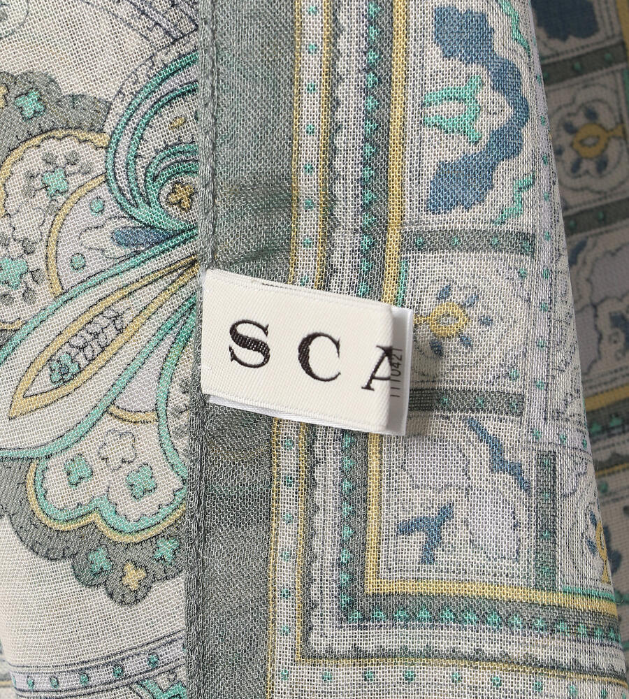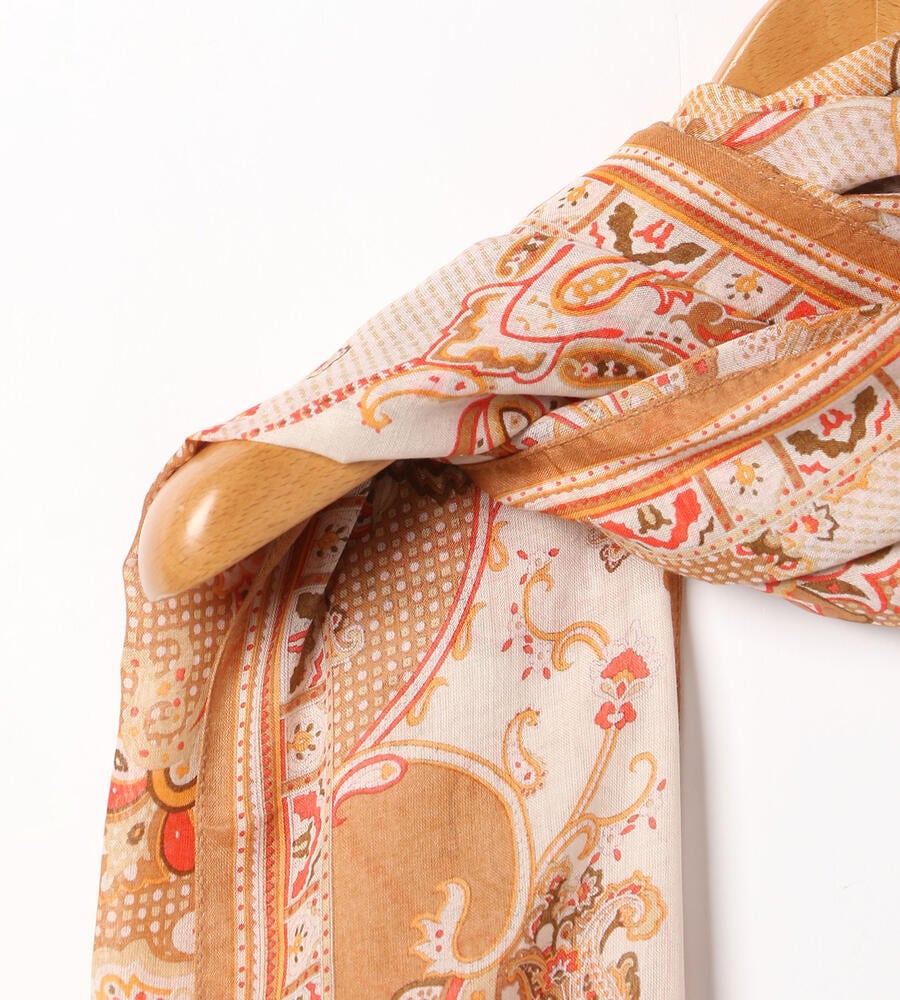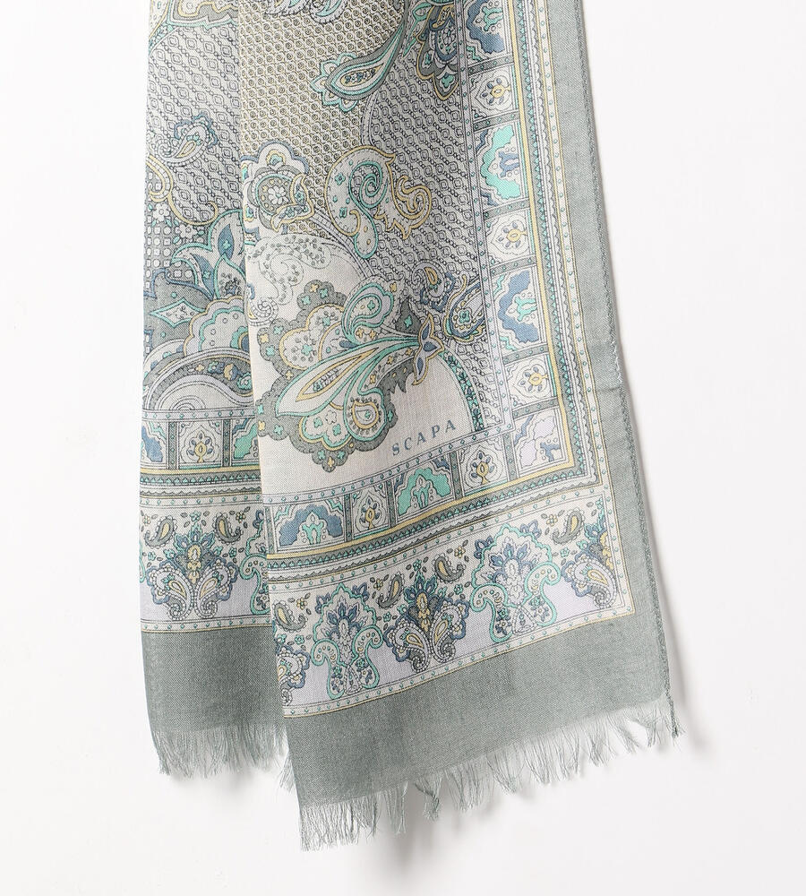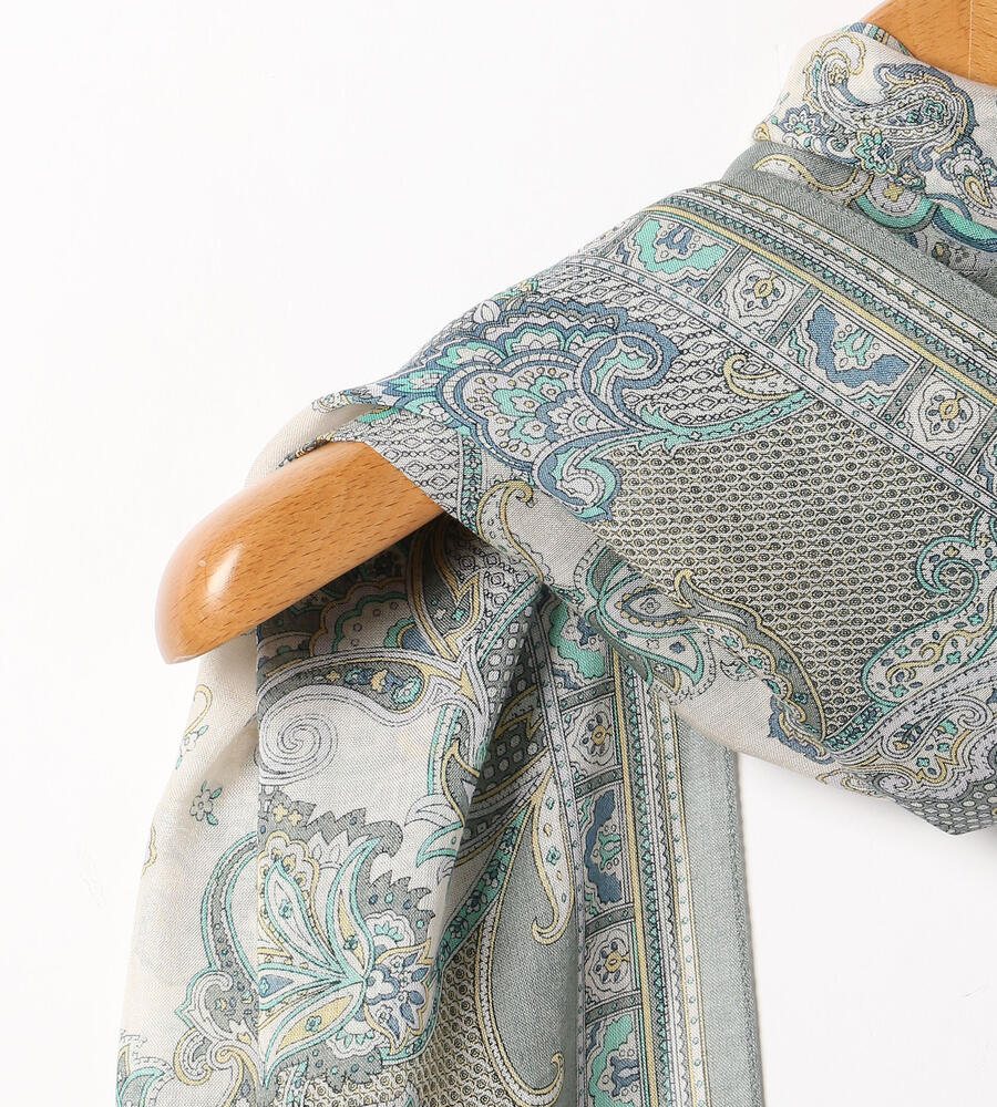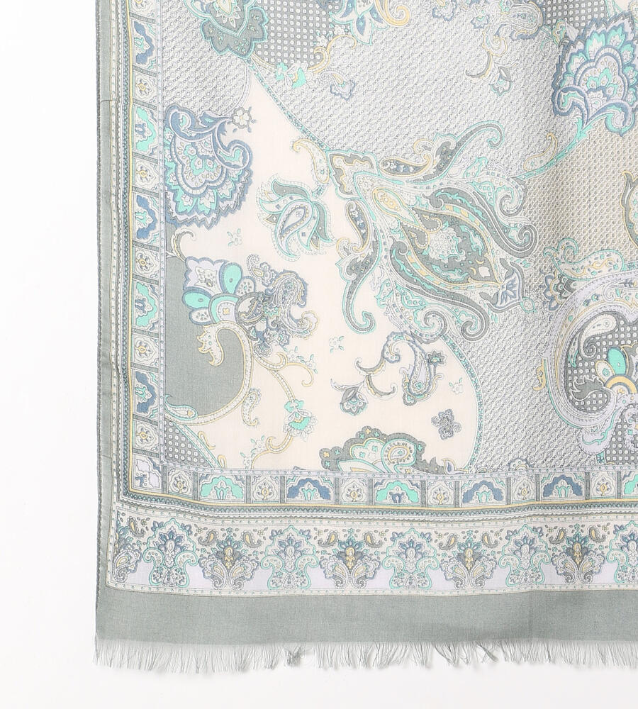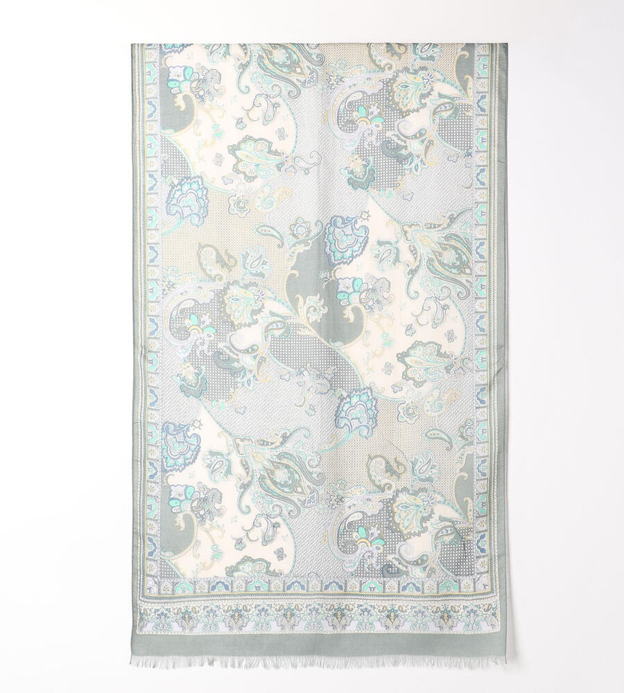 繊細なペイズリープリントを、淡く女性らしい色味で表現したストール。首元にふんわり巻いたり肩から羽織るだけで、コーディネートを華やかに印象付けてくれます。裾のフリンジやロゴプリントもさりげなく目をひくポイントに。エアリーな風合いで幅広い季節に取り入れやすく、持ち運びにも便利な一枚です。