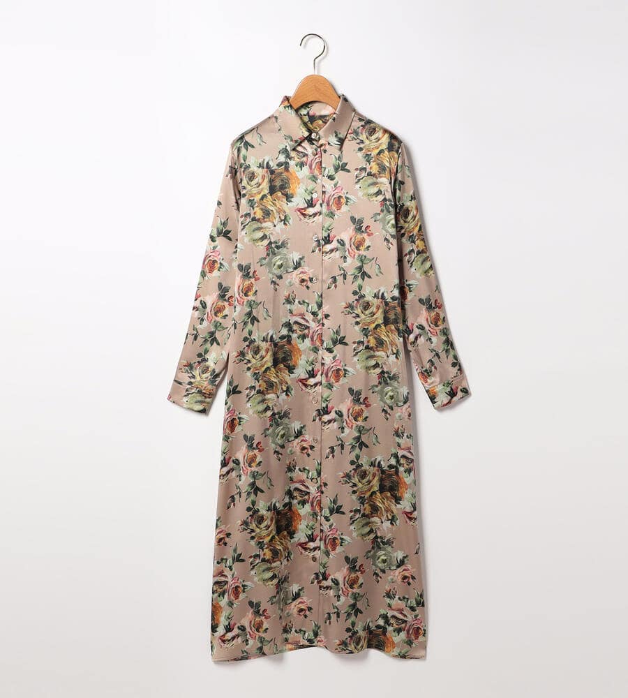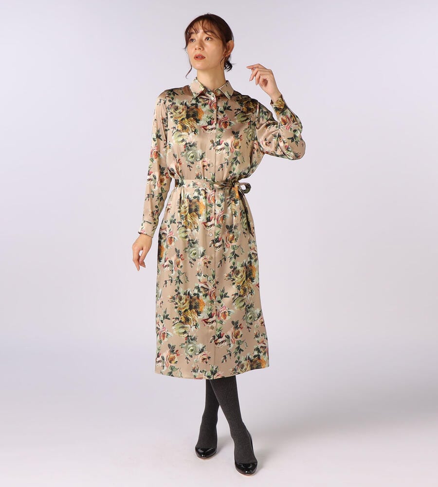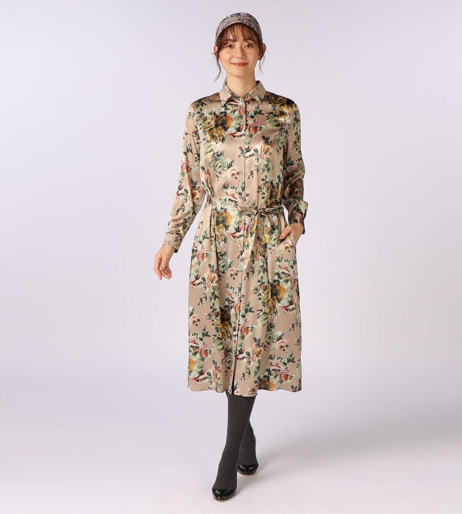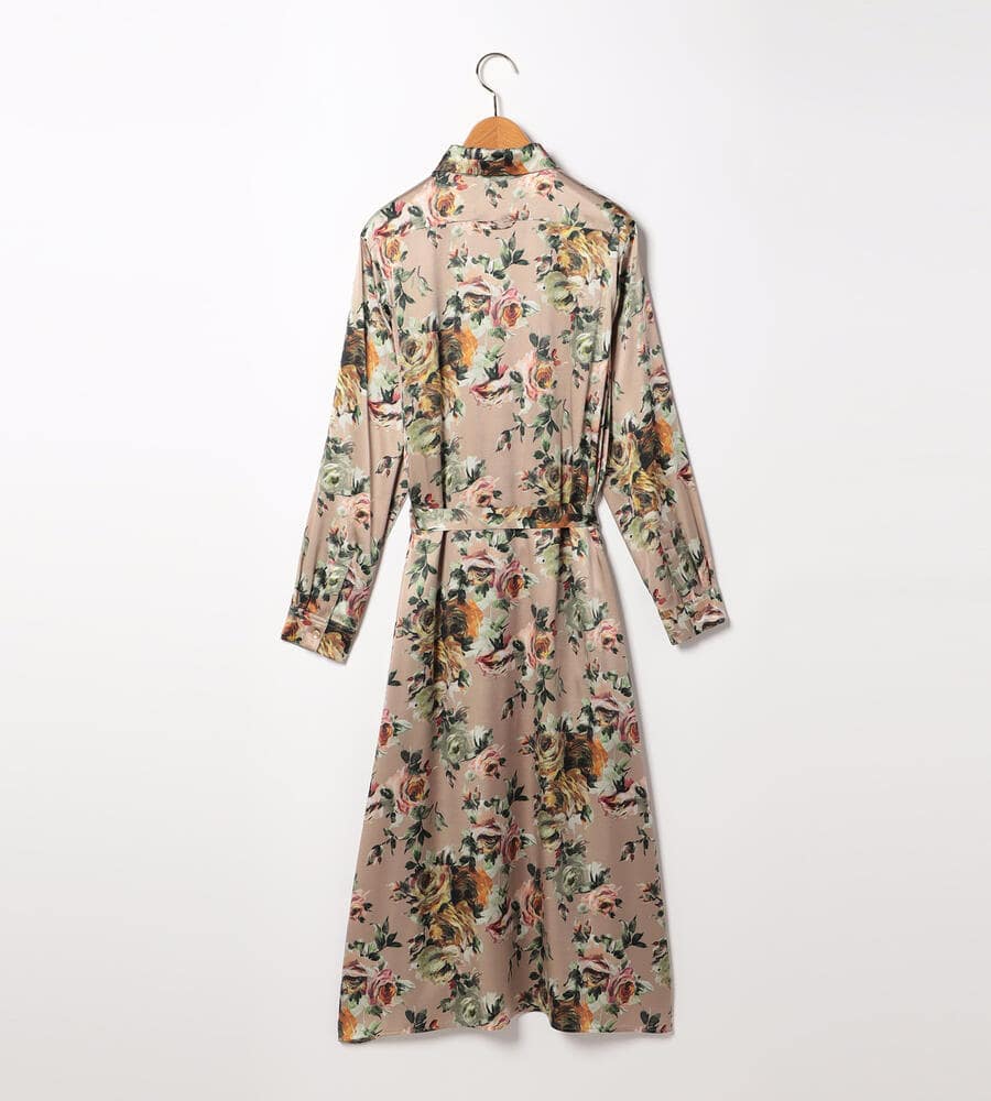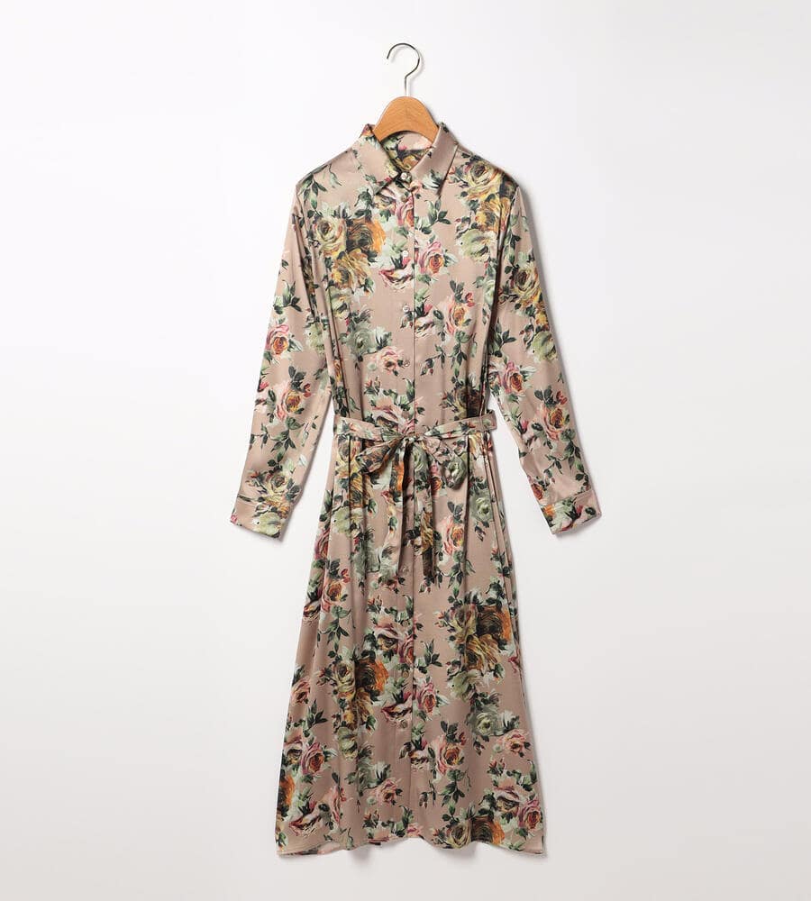 絵画のように美しく表現されたビンダフラワープリントのシャツワンピース。フロントはボタン仕様。上品な艶感としなやかさを持つ、シルクとポリウレタンをブレンドしたサテン素材を採用しています。ウエストベルトのオンオフで雰囲気のアレンジを楽しむことができるアイテムです。