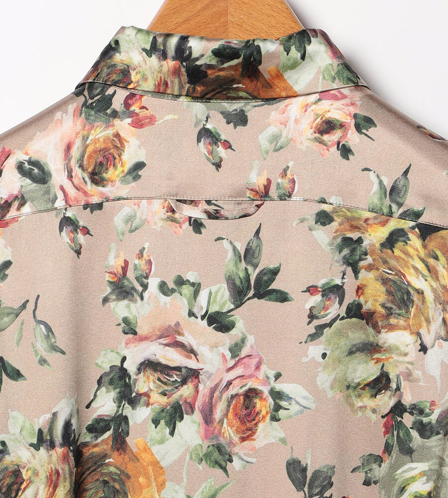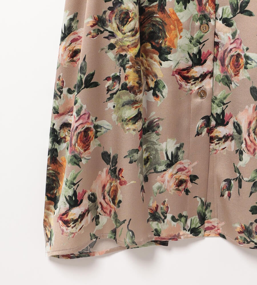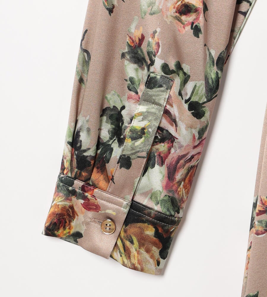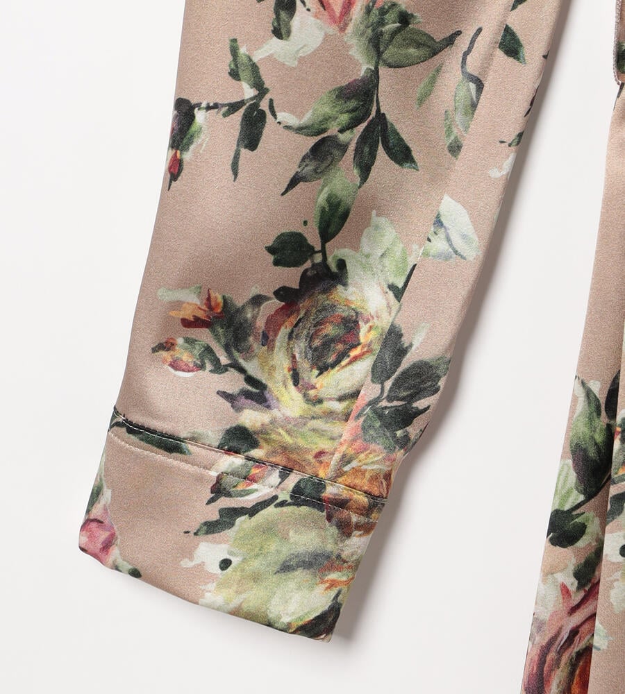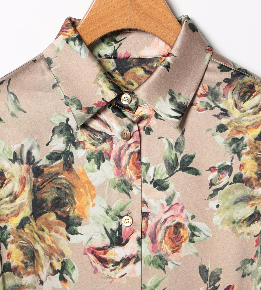 絵画のように美しく表現されたビンダフラワープリントのシャツワンピース。フロントはボタン仕様。上品な艶感としなやかさを持つ、シルクとポリウレタンをブレンドしたサテン素材を採用しています。ウエストベルトのオンオフで雰囲気のアレンジを楽しむことができるアイテムです。