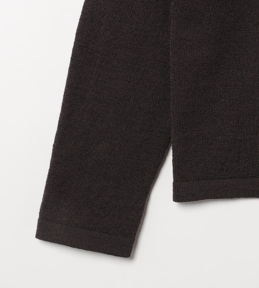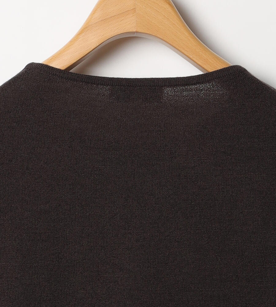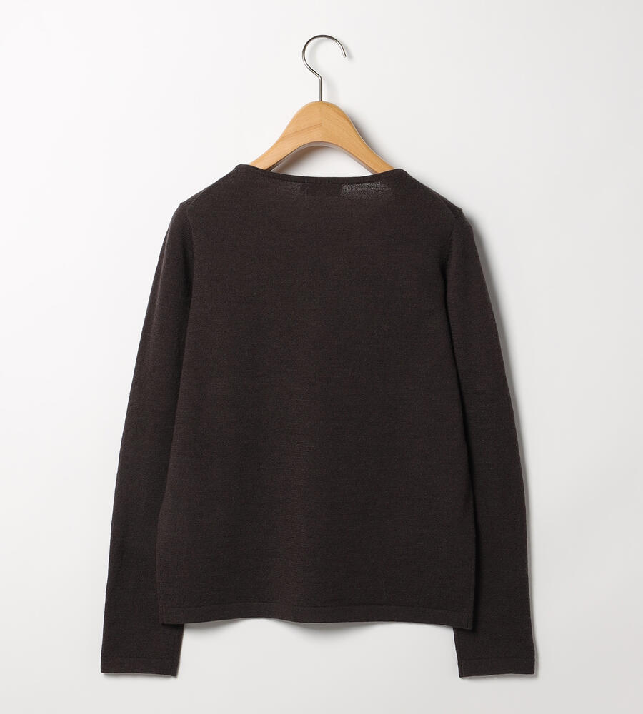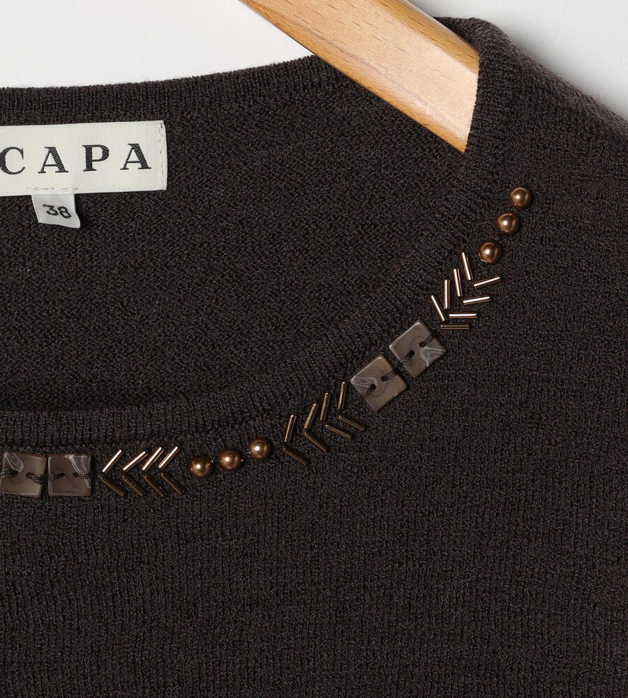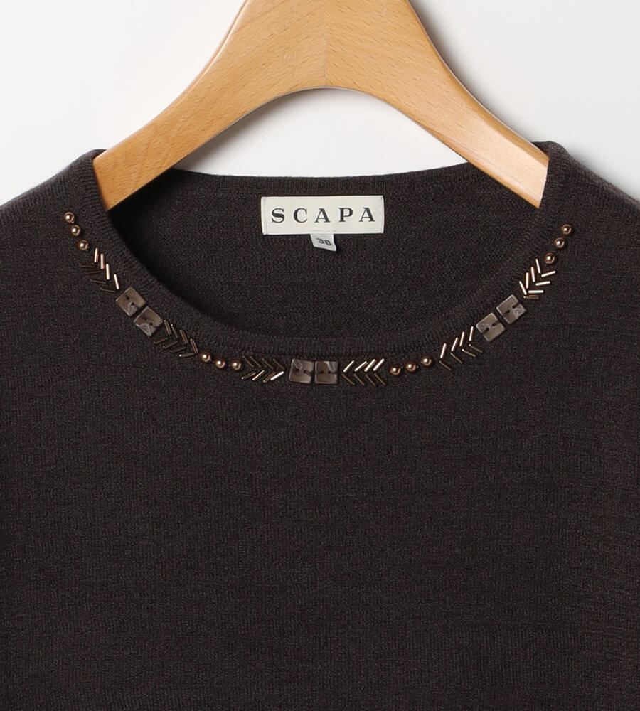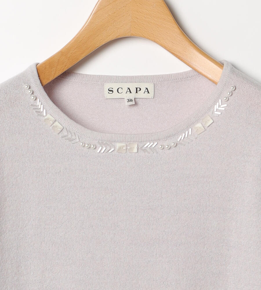 首まわりに配したビーズやパールが顔まわりに華やぎを添えてくれるニットトップス。すべて同系色で揃えているため、上品な印象に仕上がっています。同デザインのカーディガンもご用意しており、アンサンブルとしても着こなしていただけるアイテムです。