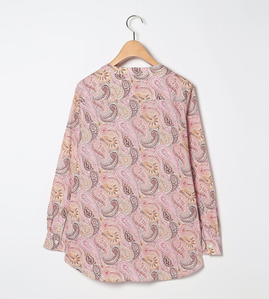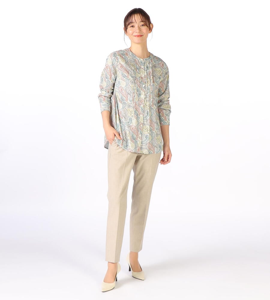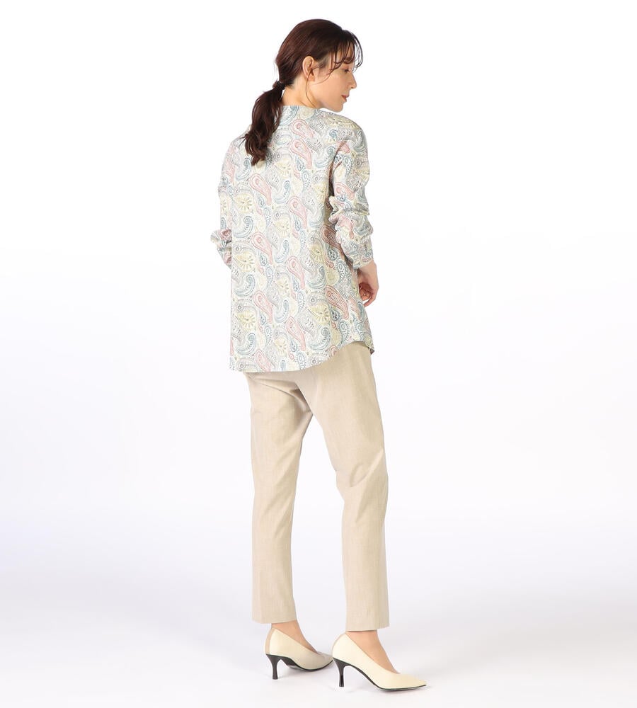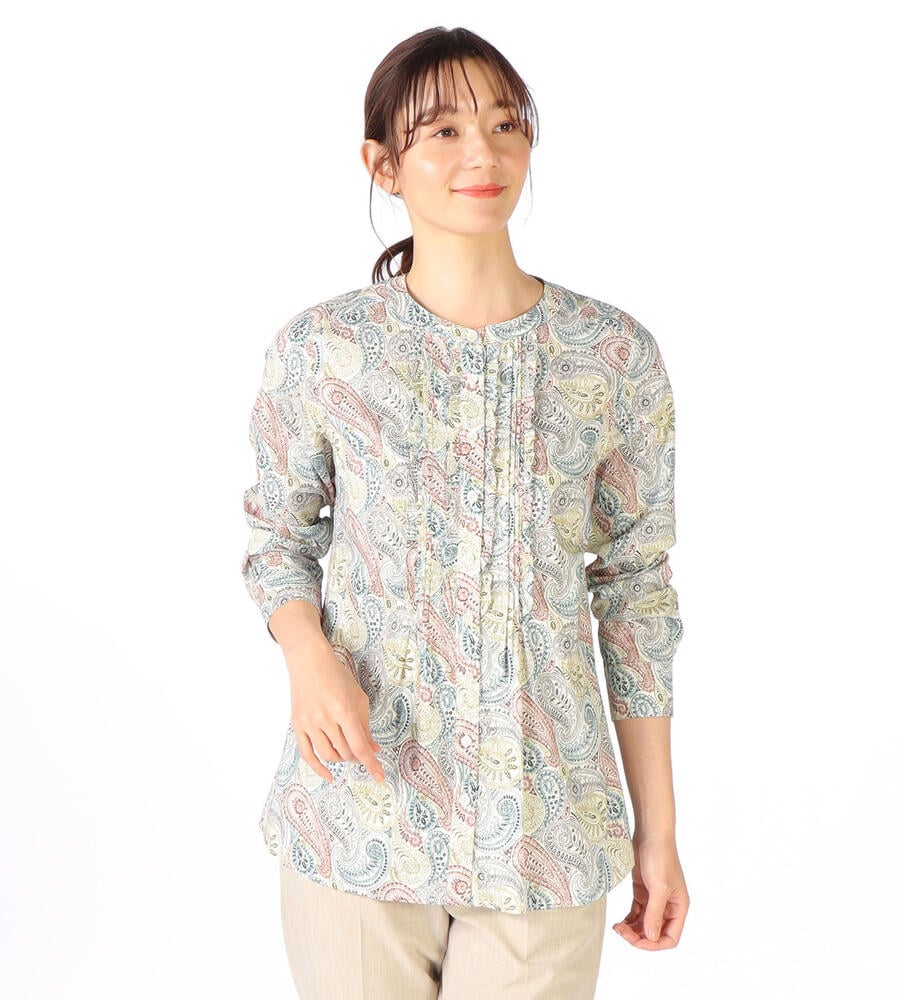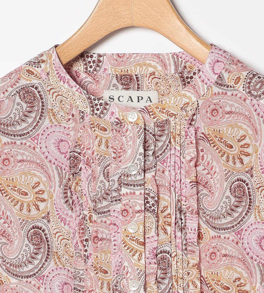 ロンドンの老舗、リバティ社が手掛けるテキスタイルブランドの華やかなブラウス。サラサのペイズリー柄がおしゃれなデザイン。フロントにあしらわれたフリルがフェミニンなデザインポイント。ノーカラーのすっきりとした首回り。お手持ちのボトムと合わせてスタイリッシュなコーディネートが実現するアイテムです。