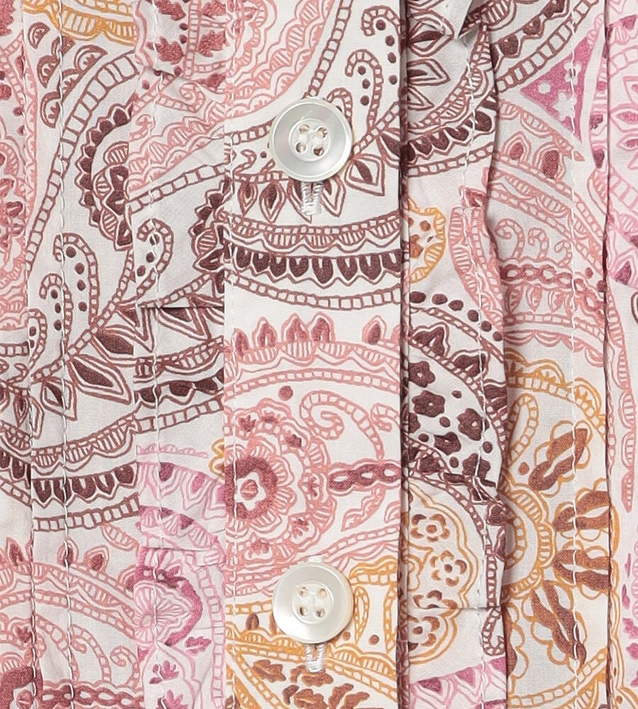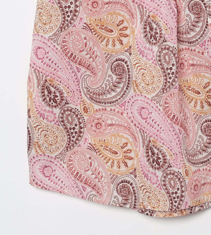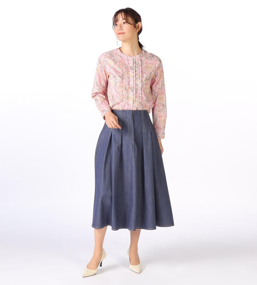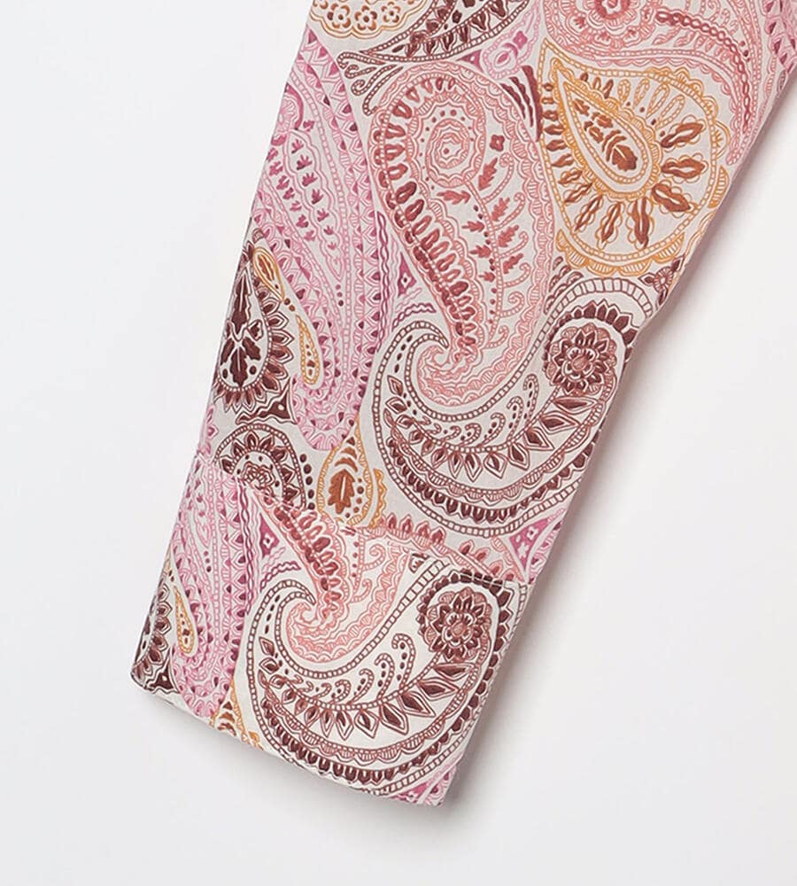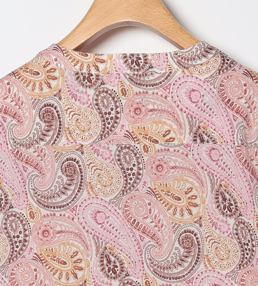 ロンドンの老舗、リバティ社が手掛けるテキスタイルブランドの華やかなブラウス。サラサのペイズリー柄がおしゃれなデザイン。フロントにあしらわれたフリルがフェミニンなデザインポイント。ノーカラーのすっきりとした首回り。お手持ちのボトムと合わせてスタイリッシュなコーディネートが実現するアイテムです。