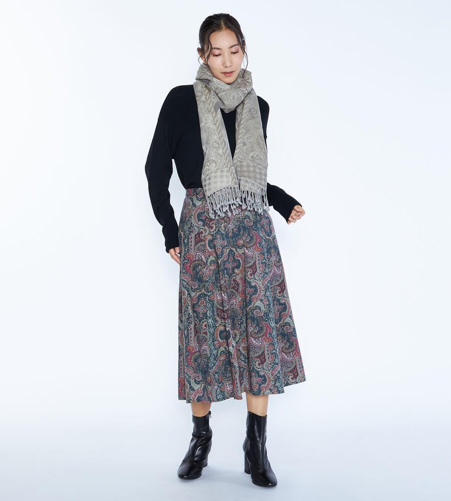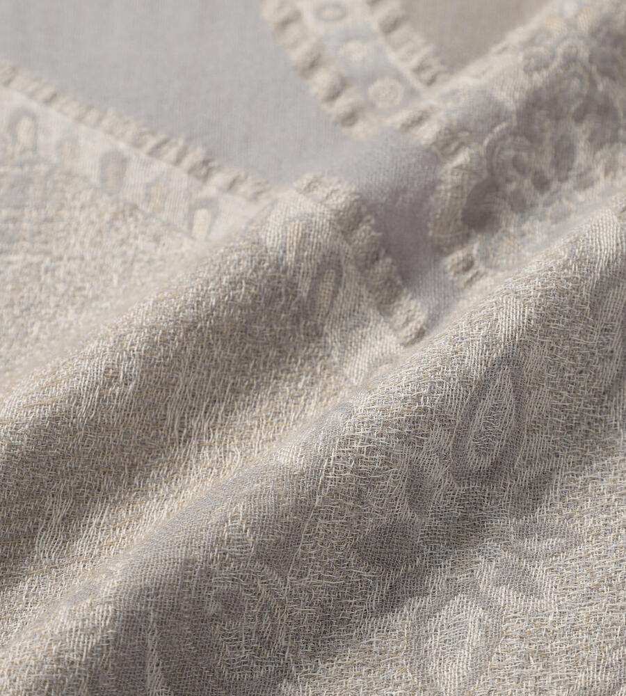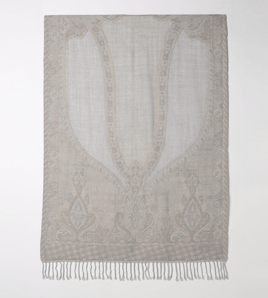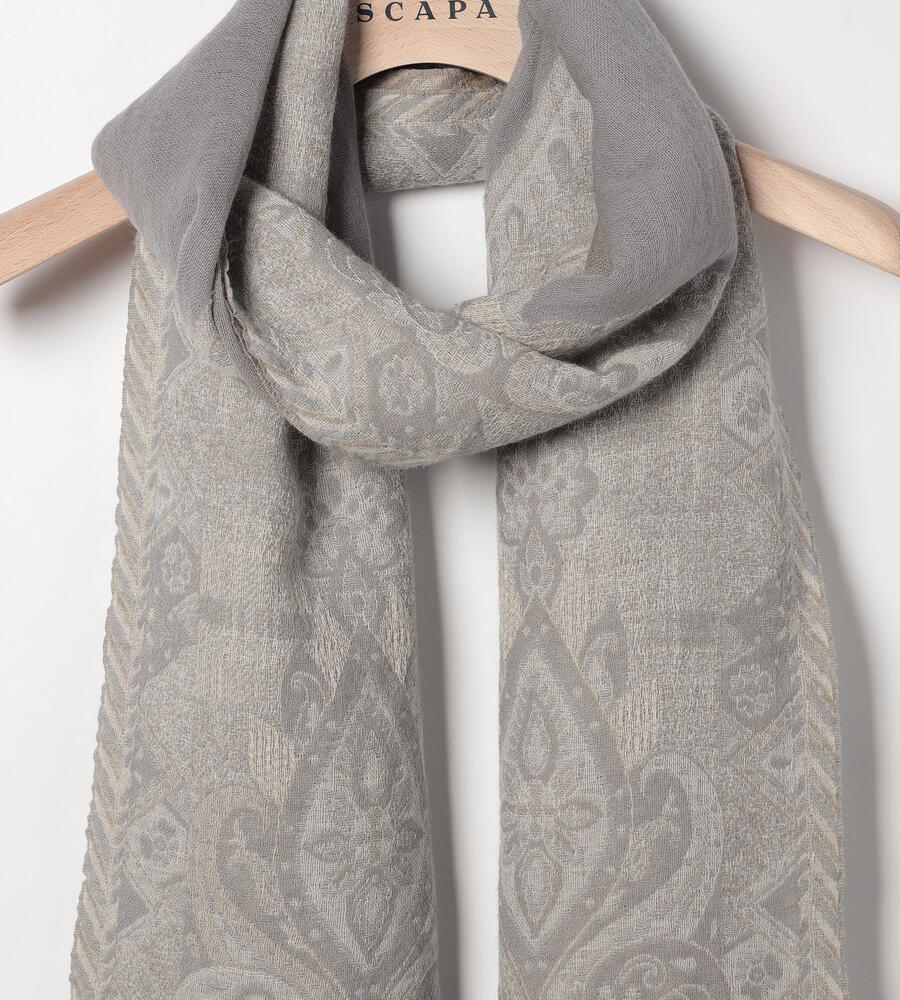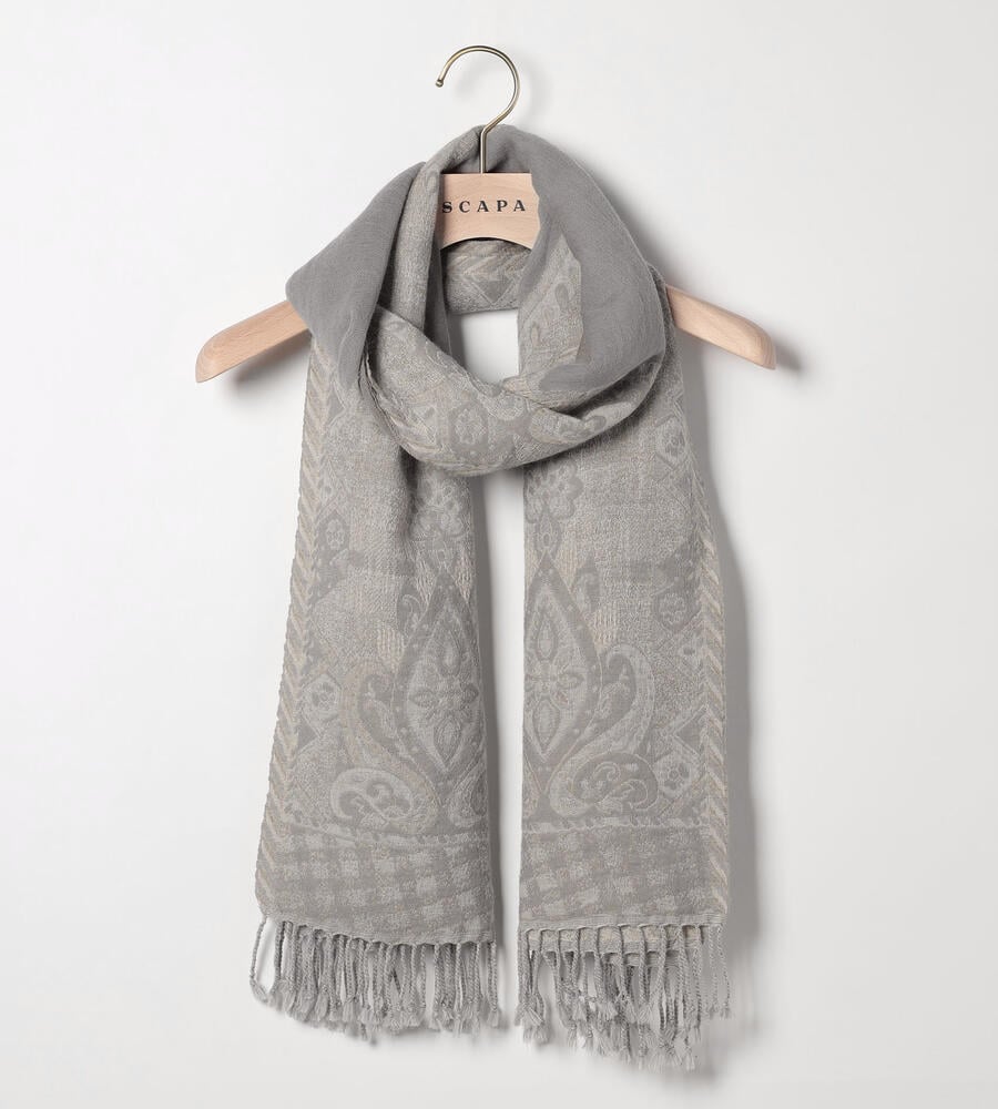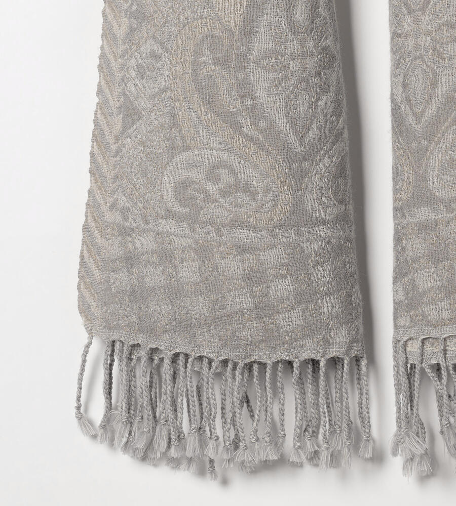 インドの伝統的なデザイン柄を取り入れデザインされた、オージャソンのストール。フラワーモチーフやペーズリー柄が組み込まれた美しい柄が魅力。ウール100%のジャカード織りの生地は、秋冬シーズンにぴったりなあたたかな肌触り。いつもの着こなしにプラスしてエレガントなスタイリングが実現します。
