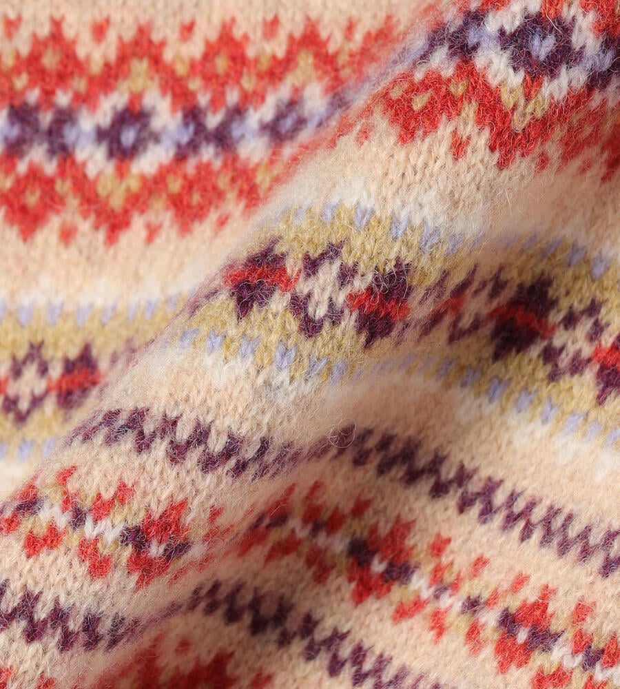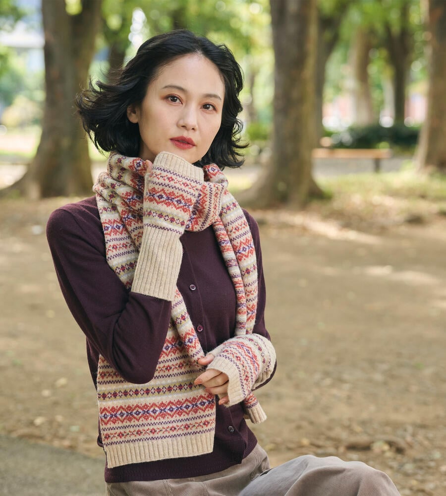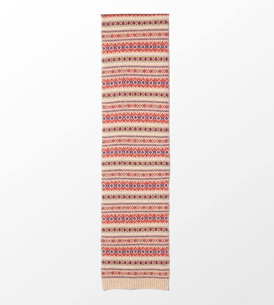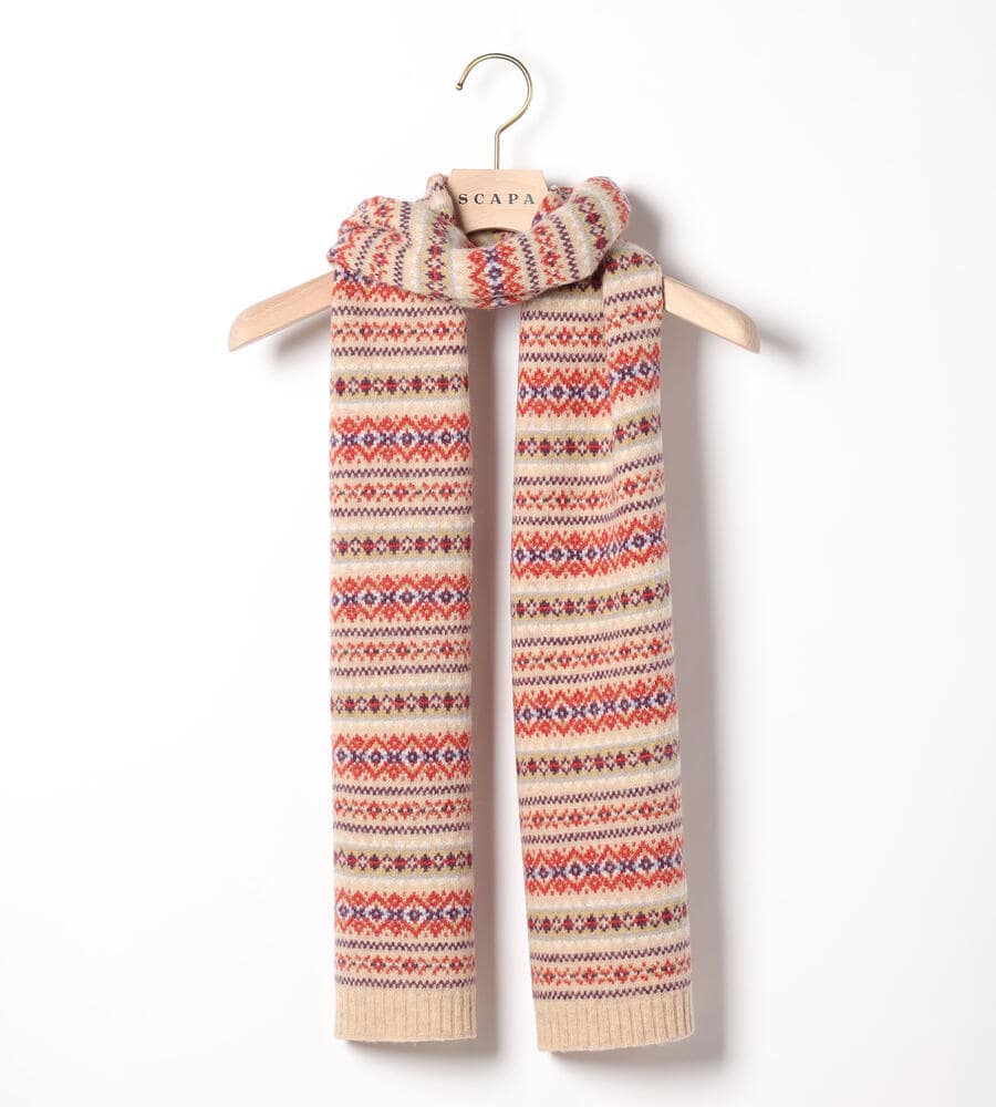マフラーとハンドウォーマーの2点セット。マフラーは総柄で華やかさのあるデザイン。ハンドウォーマーは、指先が使いやすいフィンガーレス仕様。長めのリブ編みがアクセント。幾何学模様の組み合わせが印象的なフェアアイル柄は、秋冬シーズンらしいデザイン。ギフトにぴったりなニットアイテムです。