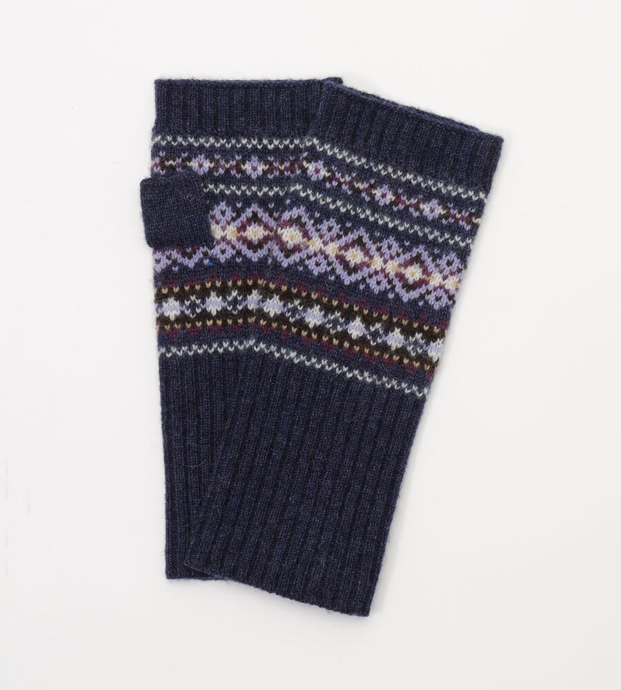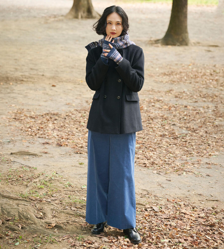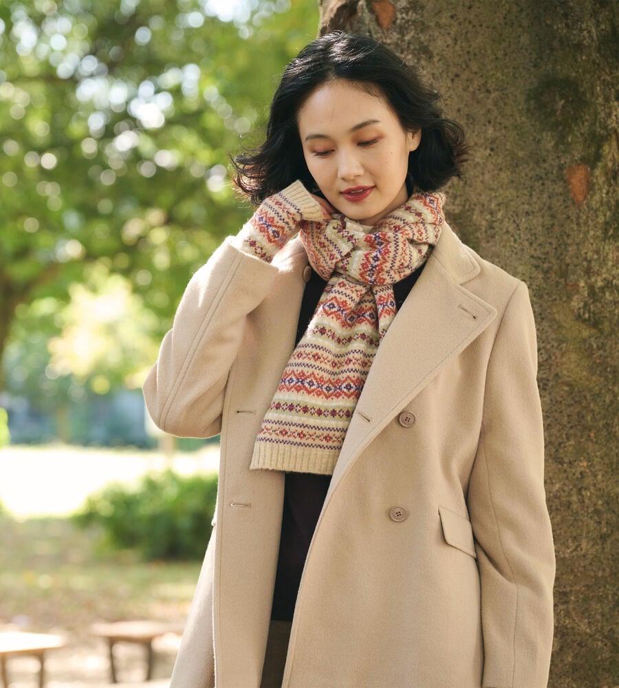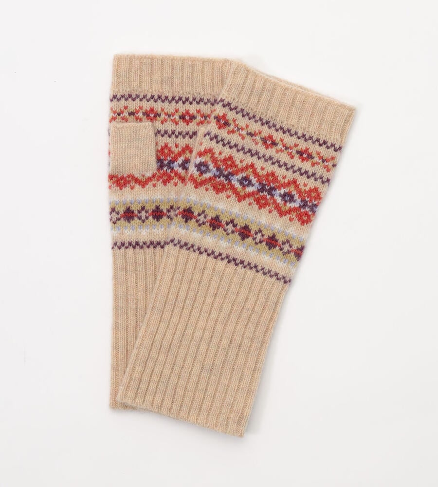 マフラーとハンドウォーマーの2点セット。マフラーは総柄で華やかさのあるデザイン。ハンドウォーマーは、指先が使いやすいフィンガーレス仕様。長めのリブ編みがアクセント。幾何学模様の組み合わせが印象的なフェアアイル柄は、秋冬シーズンらしいデザイン。ギフトにぴったりなニットアイテムです。
