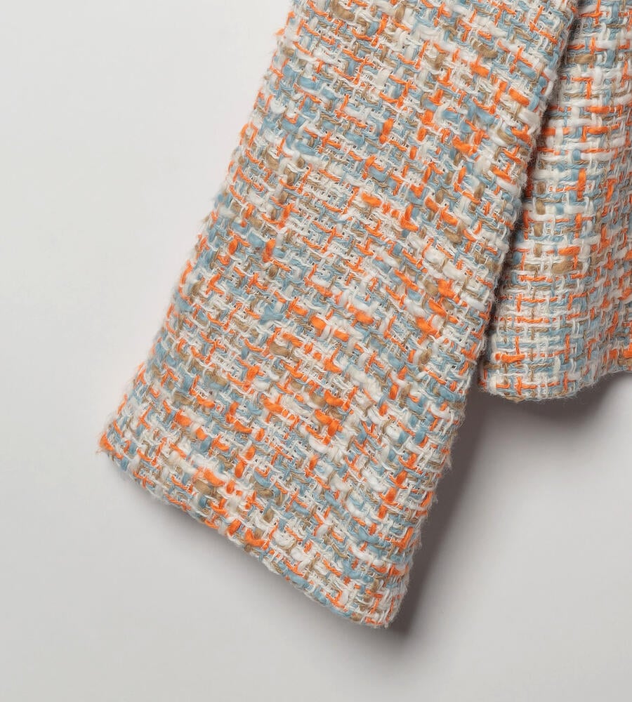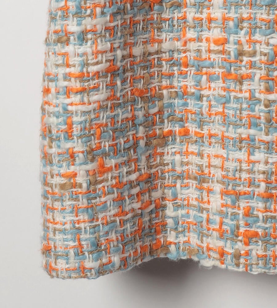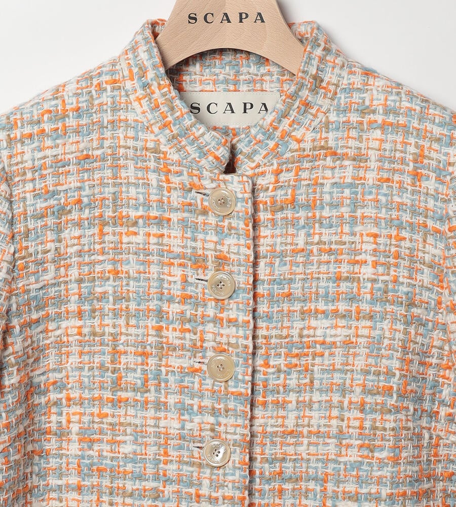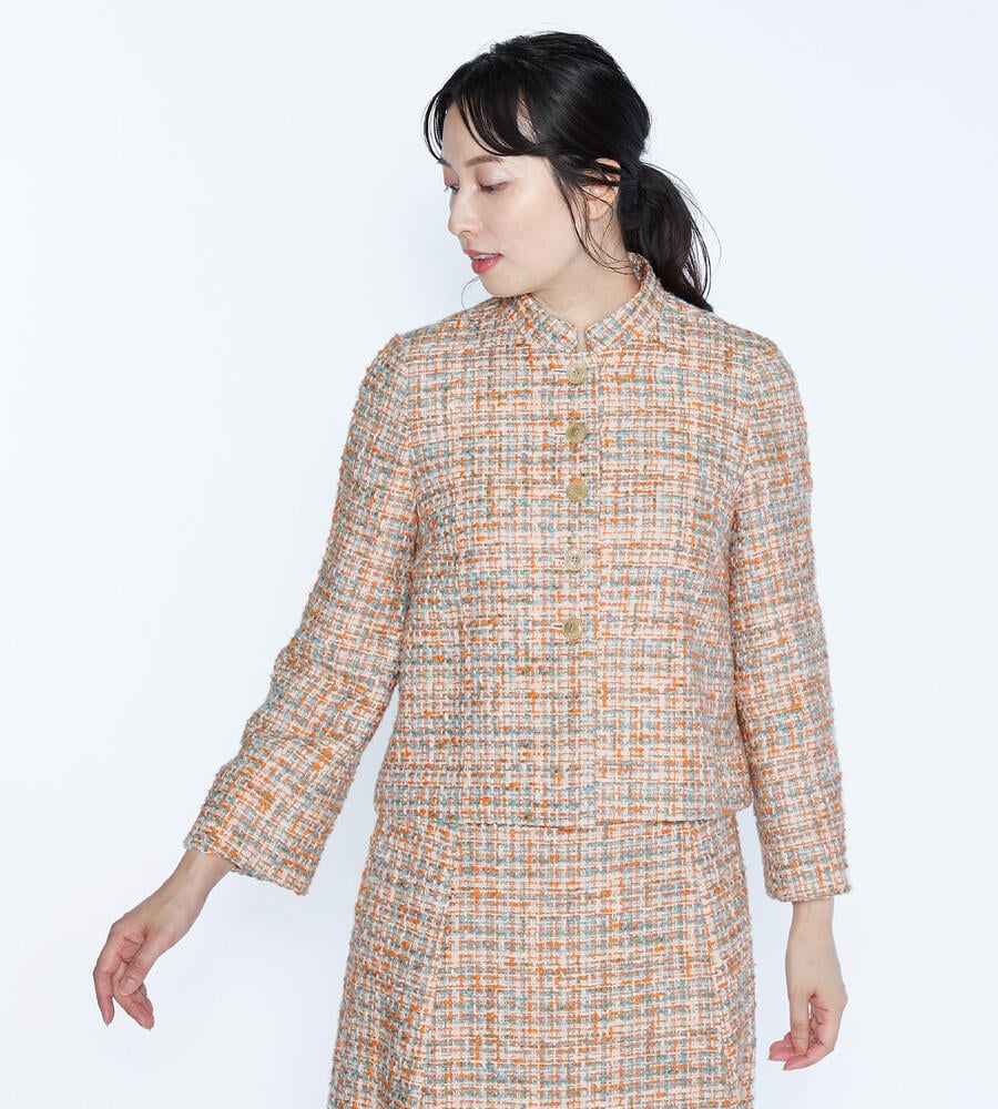 ポップな色彩でありながら、ツイード素材で淑女の気品を備えたジャケット。スタンドカラーを採用し、きちんとした印象に仕上げています。着丈は短めのため、量感のあるボトムスなどとも好相性。ざっくりとしたツイードの質感で、秋冬らしい温もりのある着こなしを楽しめます。同素材のスカートとのセットアップもお楽しみいただけます。