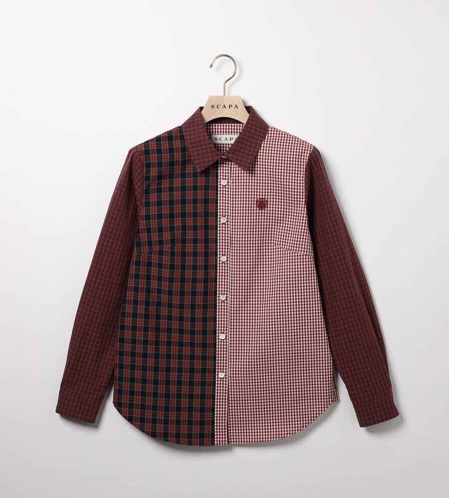 軽やかなコットン素材で、ロングシーズン着回しのきく長袖シャツ。さまざまな種類のチェック柄を組み合わせた、クレイジーパターンのパッチワークデザインです。前身頃のダーツで女性らしい自然なシルエットをメイクし、プラケットフロントで立体感をプラス。左胸には、トラッドなクレスト刺繍が施されています。爽やかなホワイトパンツや、紺ブレザーとのコンビがおすすめです。