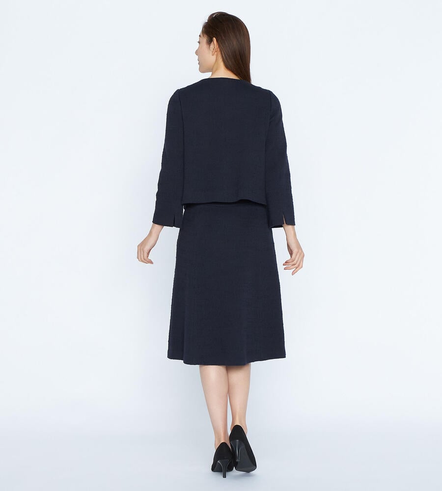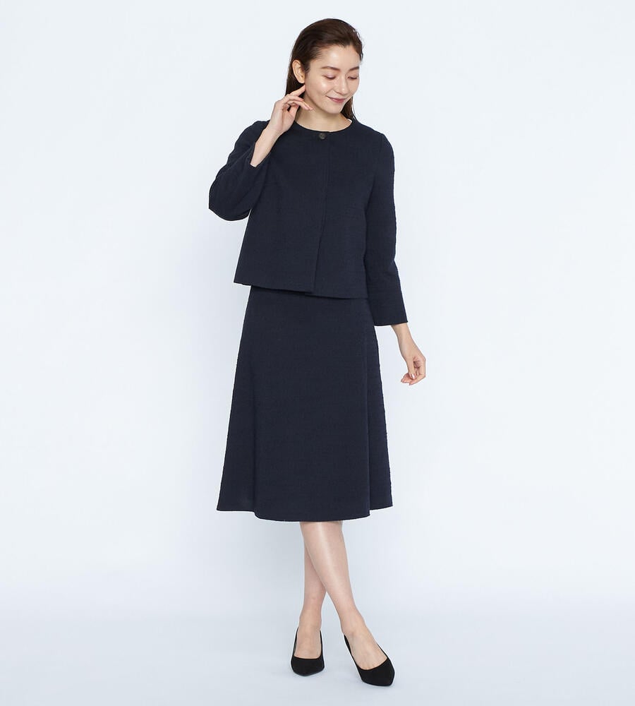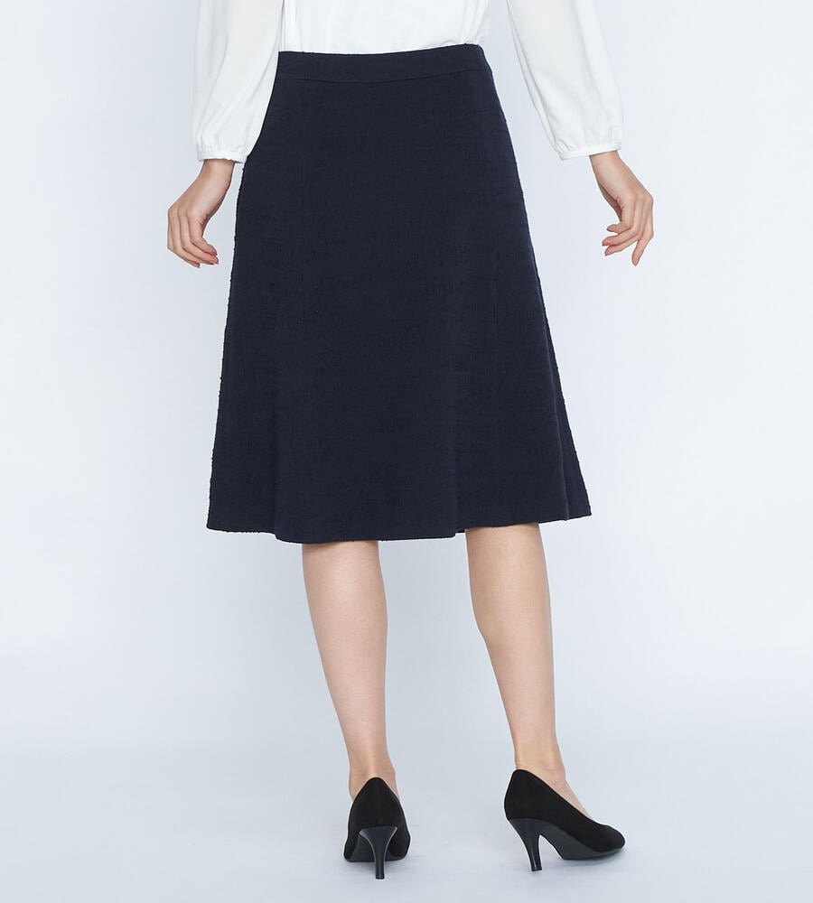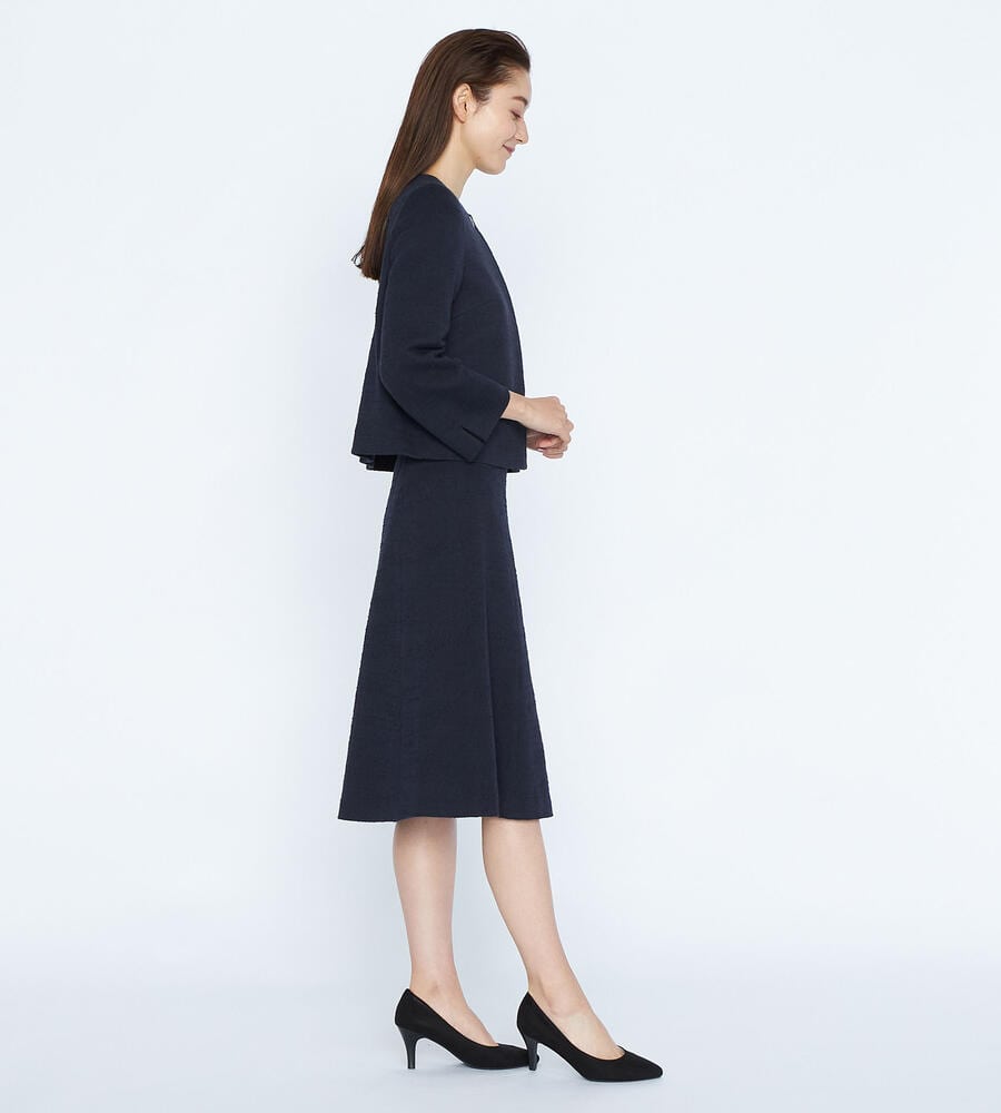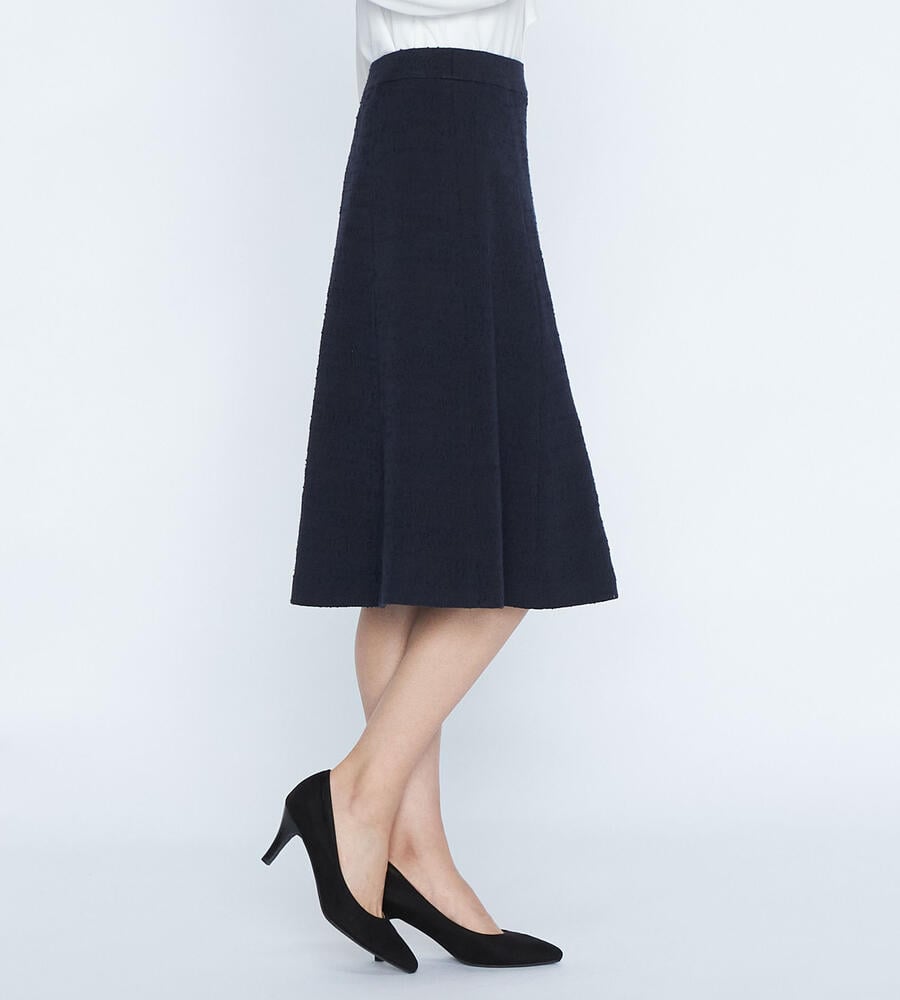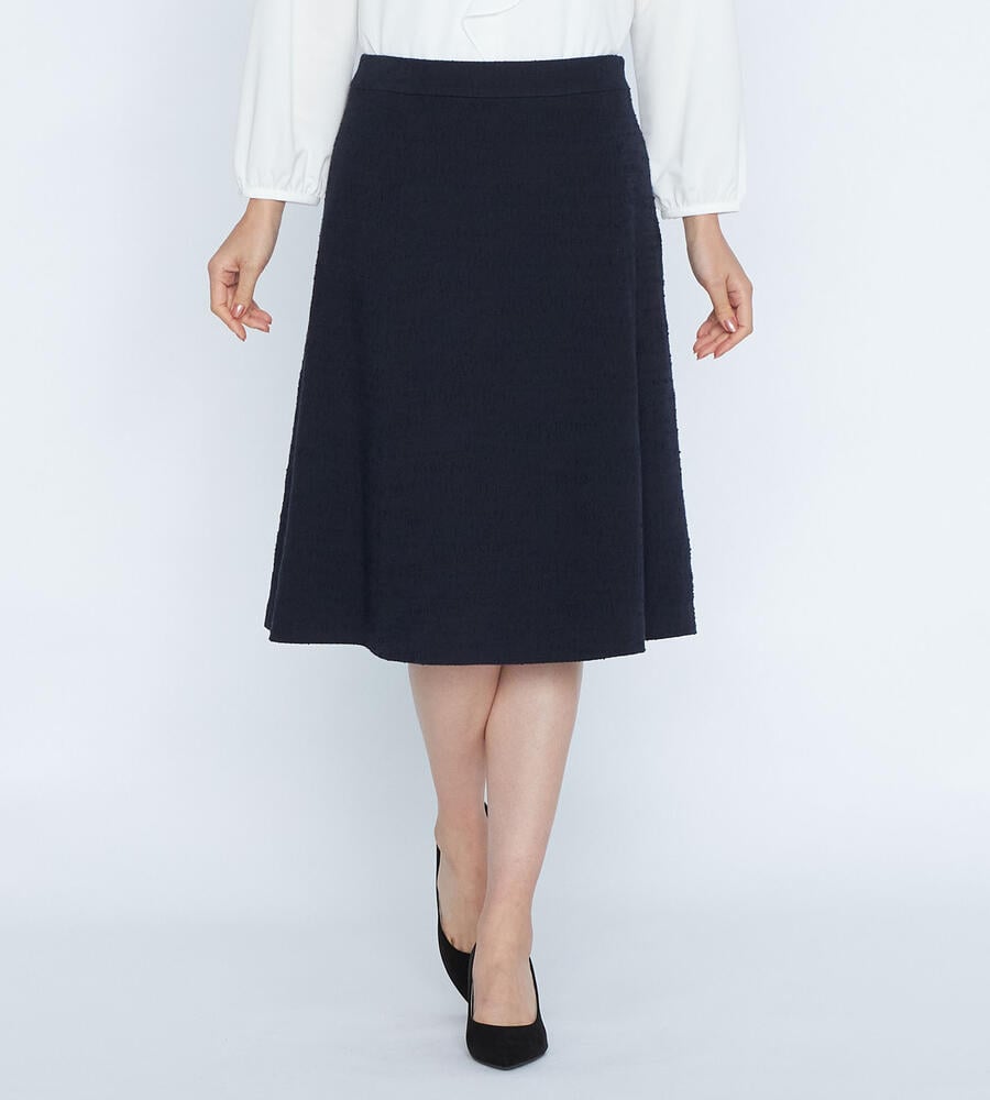 クラシックエレガントな着こなしに欠かせない、レディな雰囲気漂うツィードジャージスカート。裾に向かってふわりと広がるフレアシルエットで優美な印象に仕上げています。サイドファスナー仕様で着脱もスムーズ。セットアップで着用できるジャケットもご用意しています。