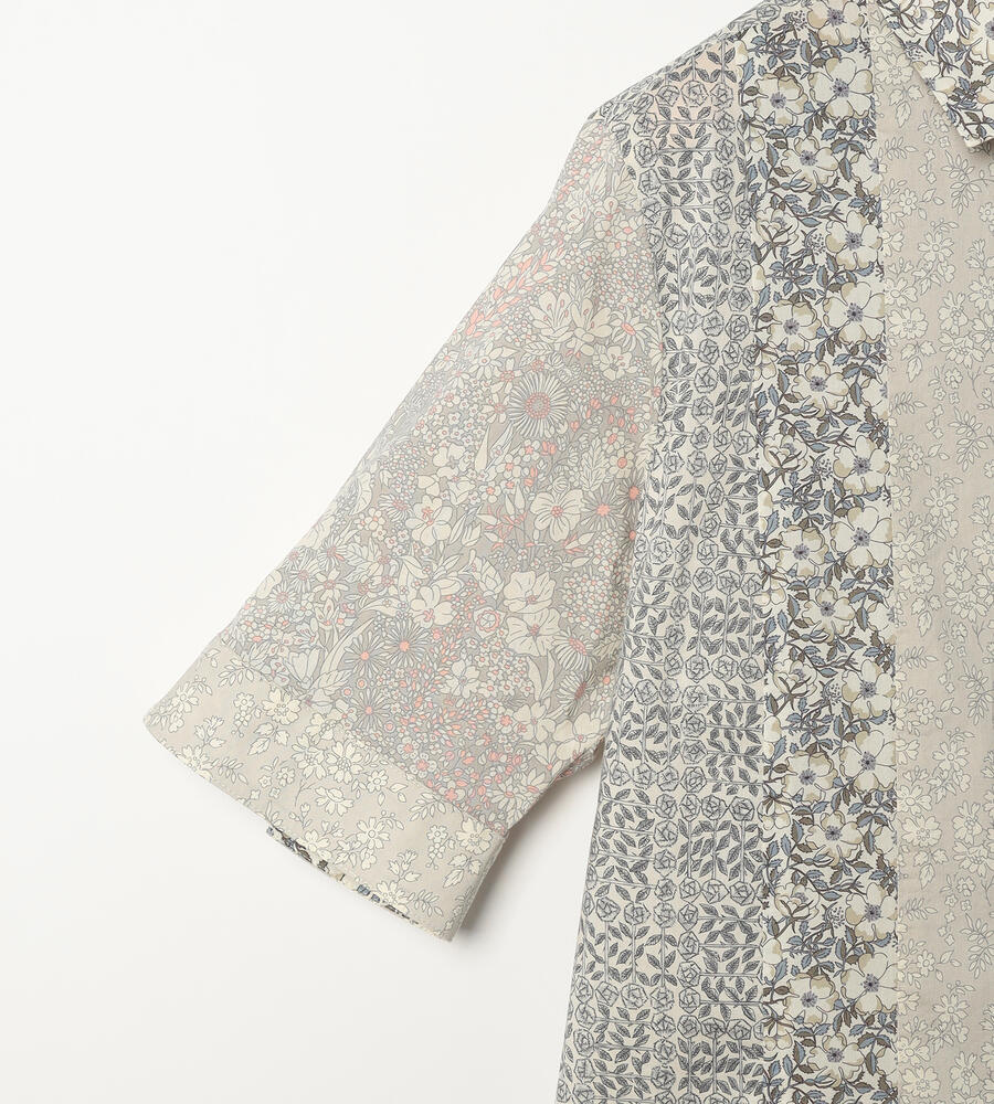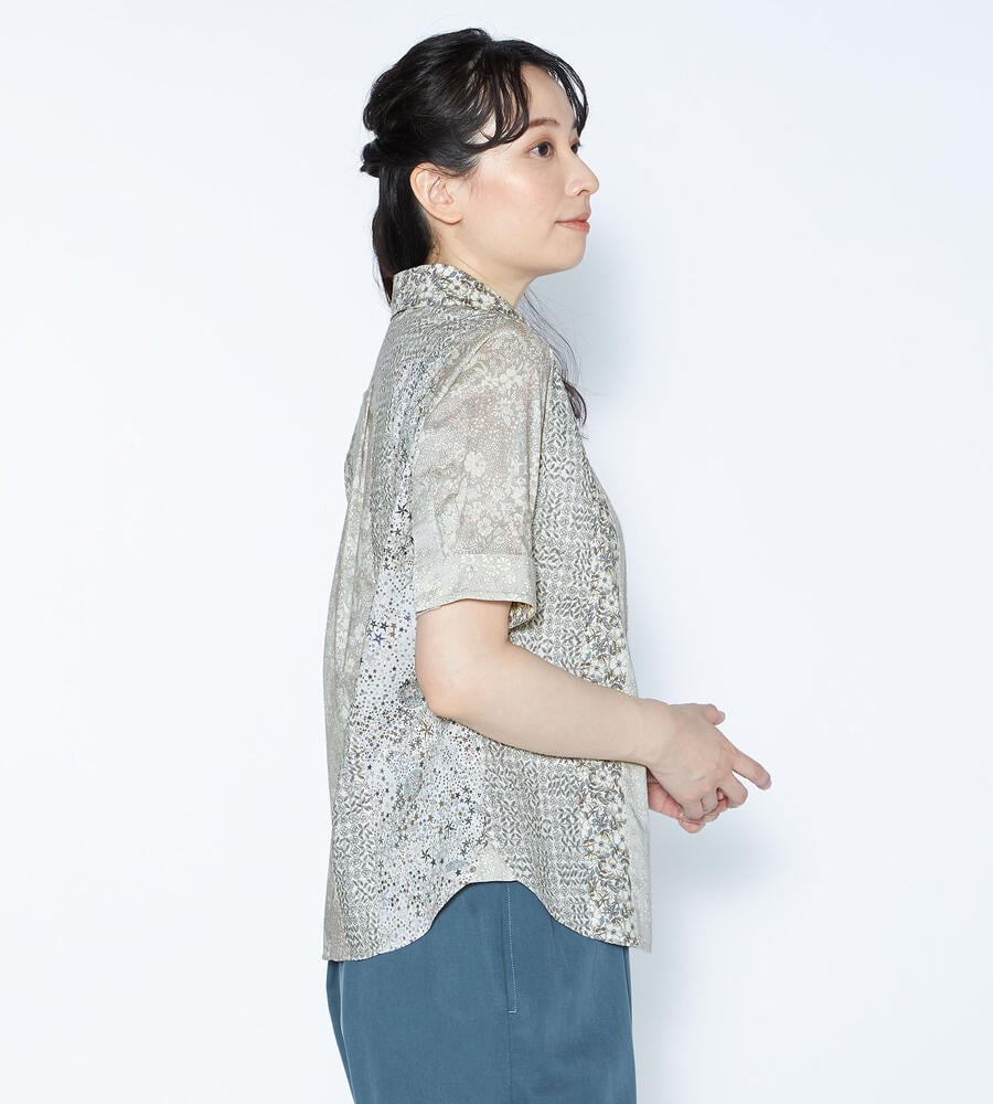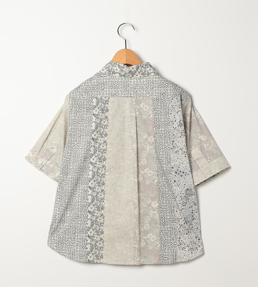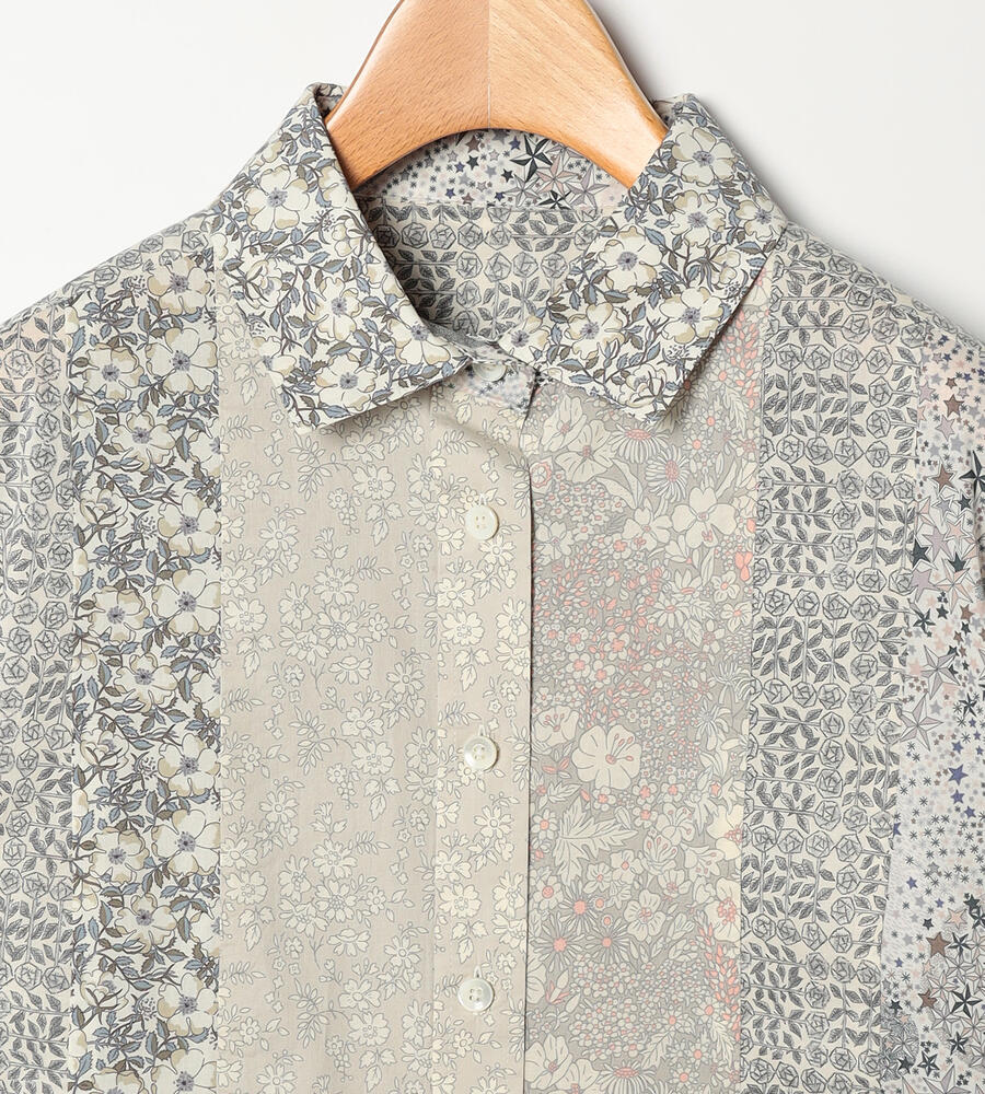 ノスタルジックな趣きのあるリバティプリントを、縦のラインを強調するようにパッチワークで繋げたブラウス。清楚でクラシカルなプリントで、着こなしに品位を加える1点です。身体に沿うすっきりとしたシルエットで、好印象を誘うスタイリングを演出。シックなボトムスを合わせると、大人らしい落着きのある装いが完成します。