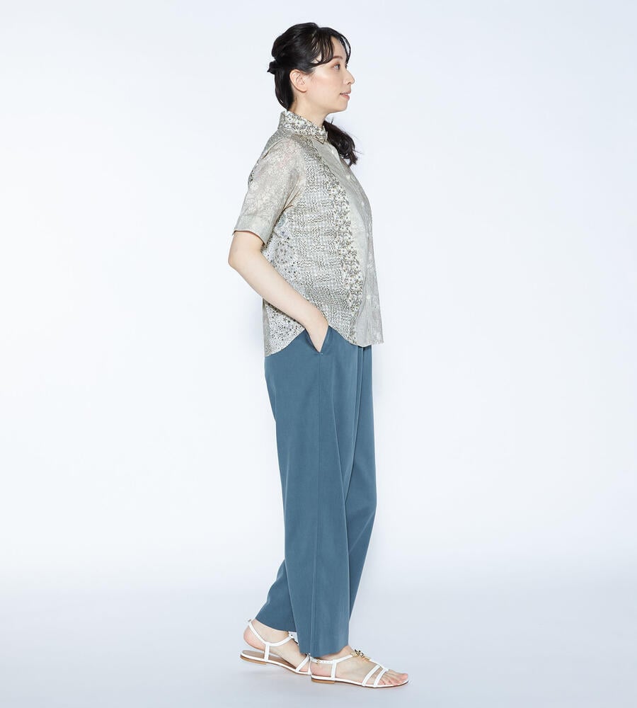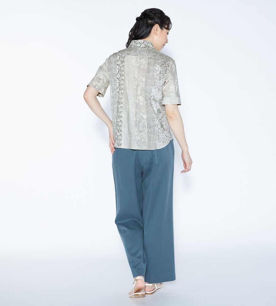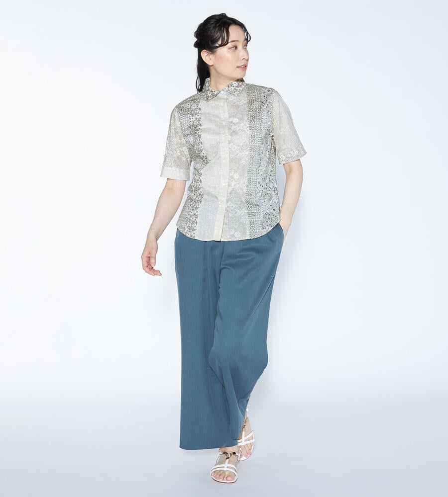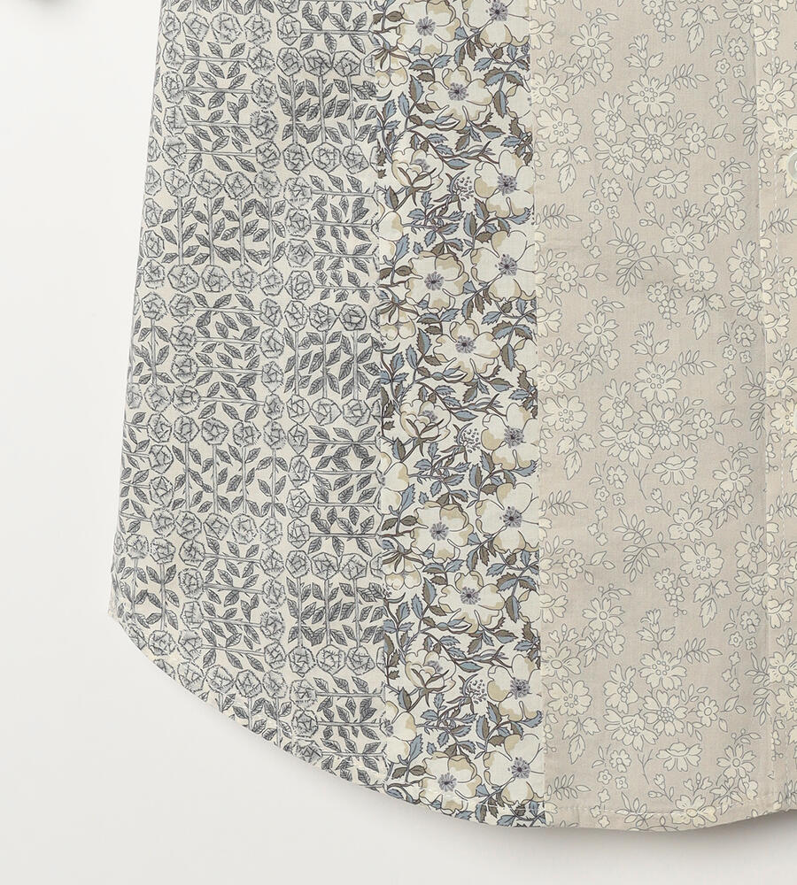 ノスタルジックな趣きのあるリバティプリントを、縦のラインを強調するようにパッチワークで繋げたブラウス。清楚でクラシカルなプリントで、着こなしに品位を加える1点です。身体に沿うすっきりとしたシルエットで、好印象を誘うスタイリングを演出。シックなボトムスを合わせると、大人らしい落着きのある装いが完成します。