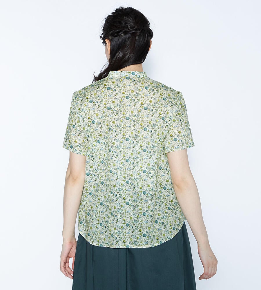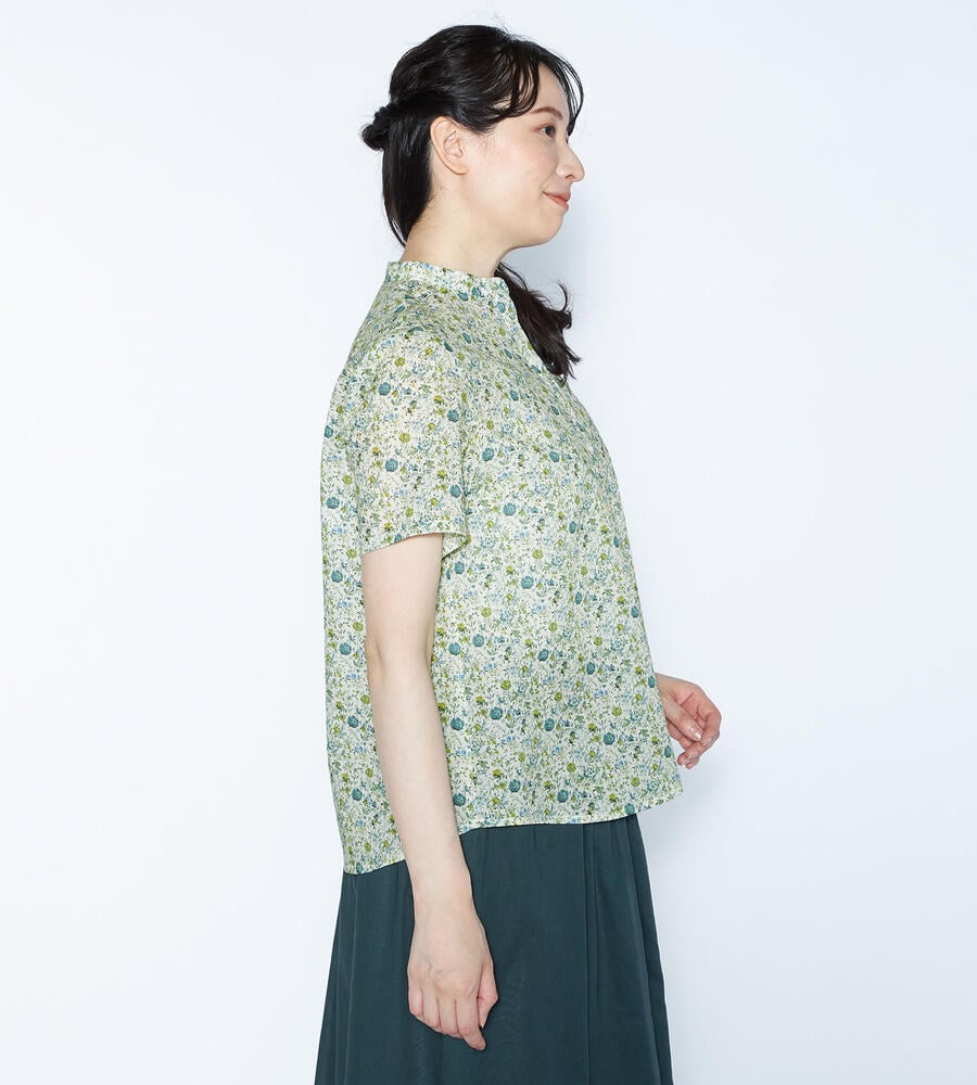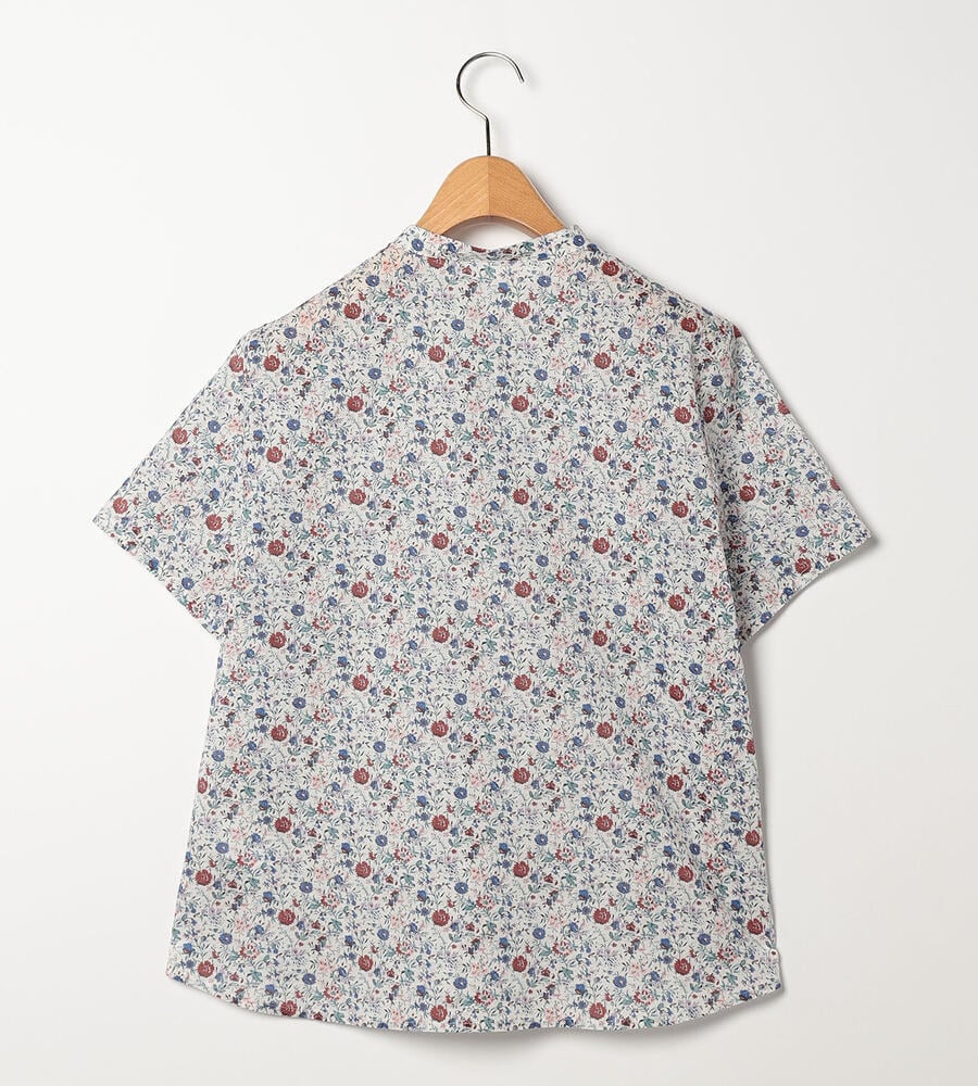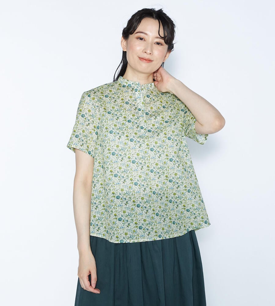 懐かしさとピースフルな印象のあるリバティプリントで仕立てたブラウス。クラシカルなスタンドカラーを採用し、清楚な印象に仕上げています。身体に程良く寄り添う、すっきりとしたシルエット。ワイドなシルエットのボトムスなどとも合わせやすく、大人らしい落ち着きのある着こなしを楽しめます。