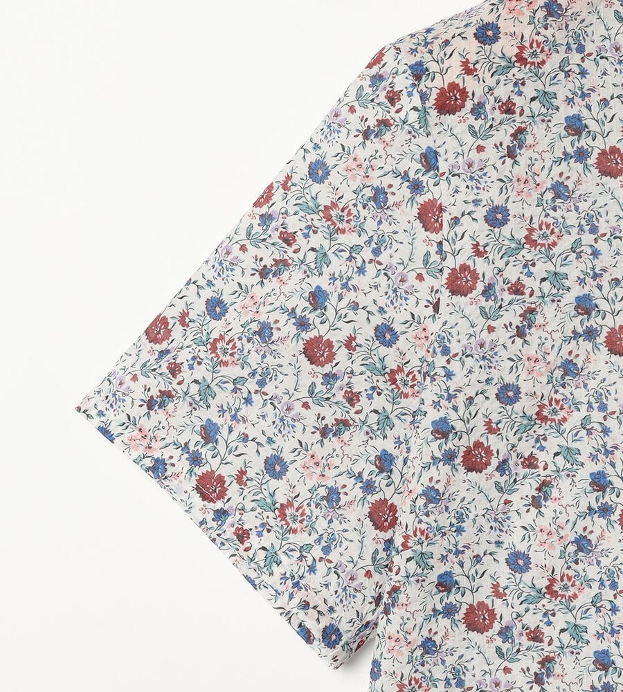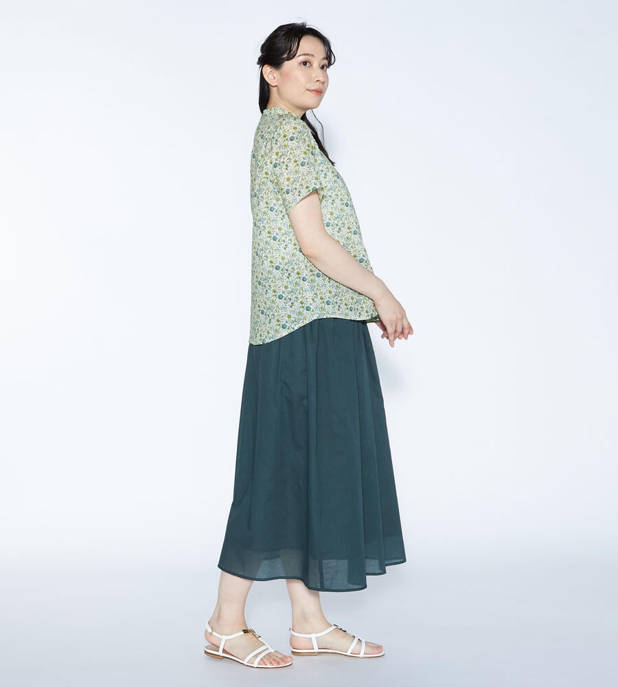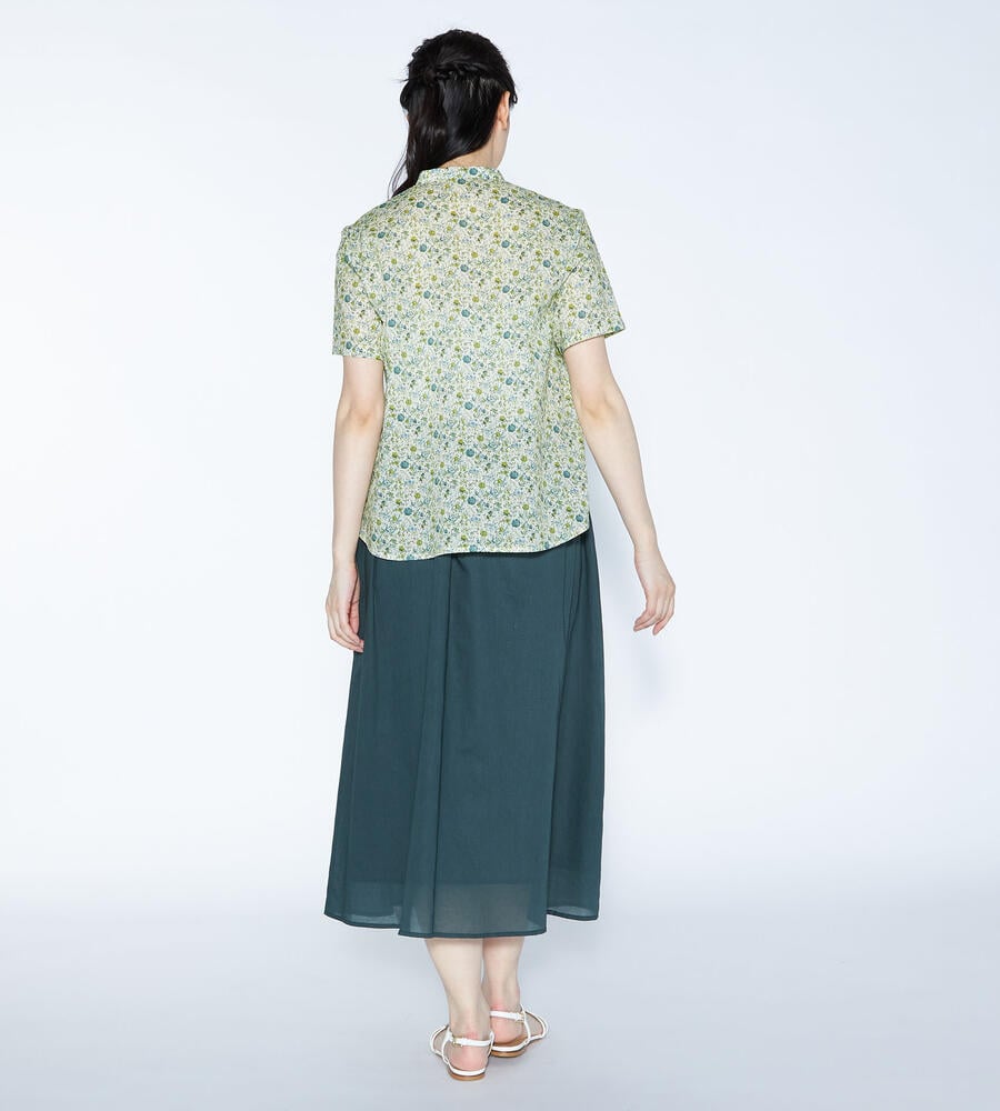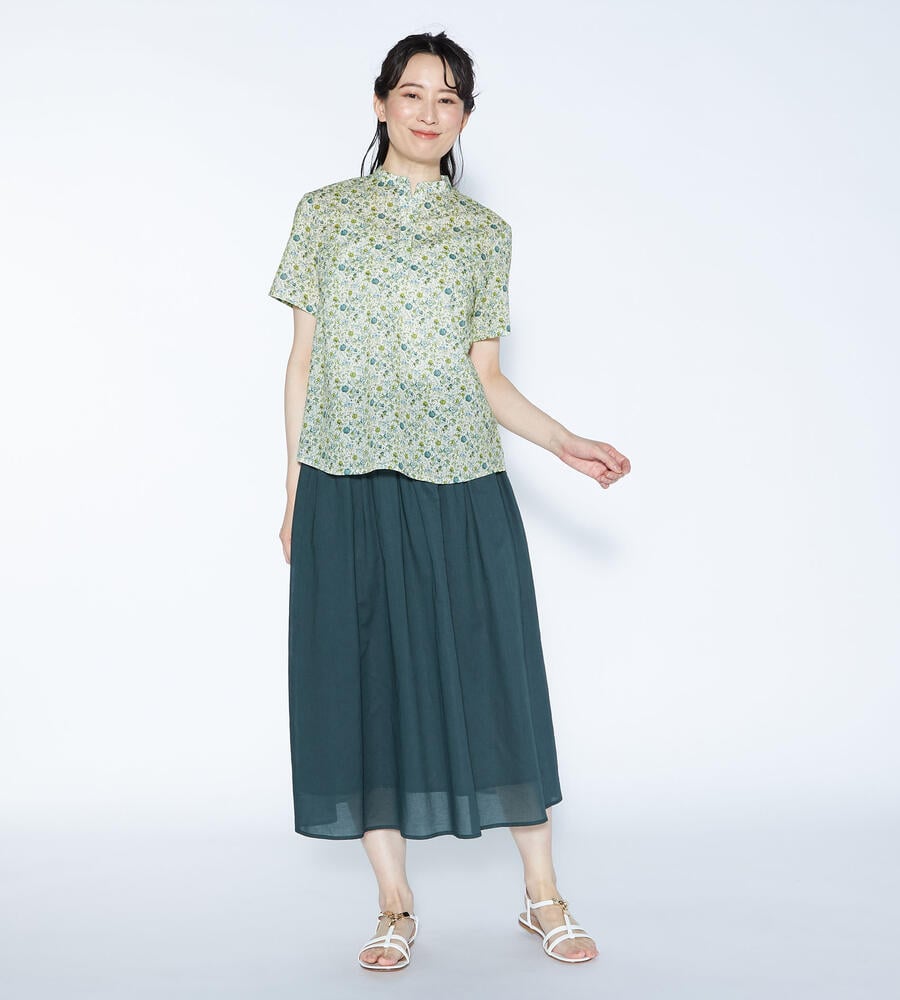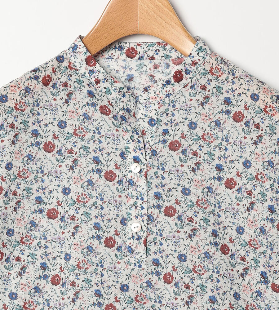 懐かしさとピースフルな印象のあるリバティプリントで仕立てたブラウス。クラシカルなスタンドカラーを採用し、清楚な印象に仕上げています。身体に程良く寄り添う、すっきりとしたシルエット。ワイドなシルエットのボトムスなどとも合わせやすく、大人らしい落ち着きのある着こなしを楽しめます。