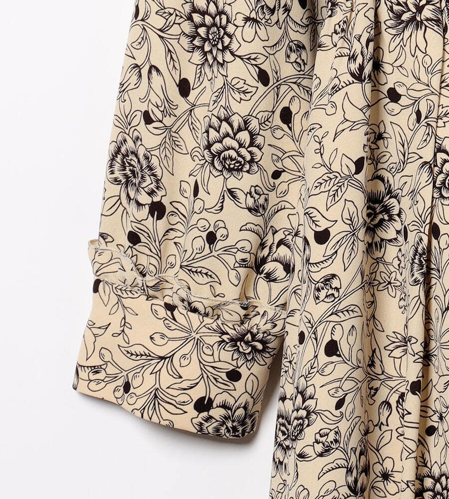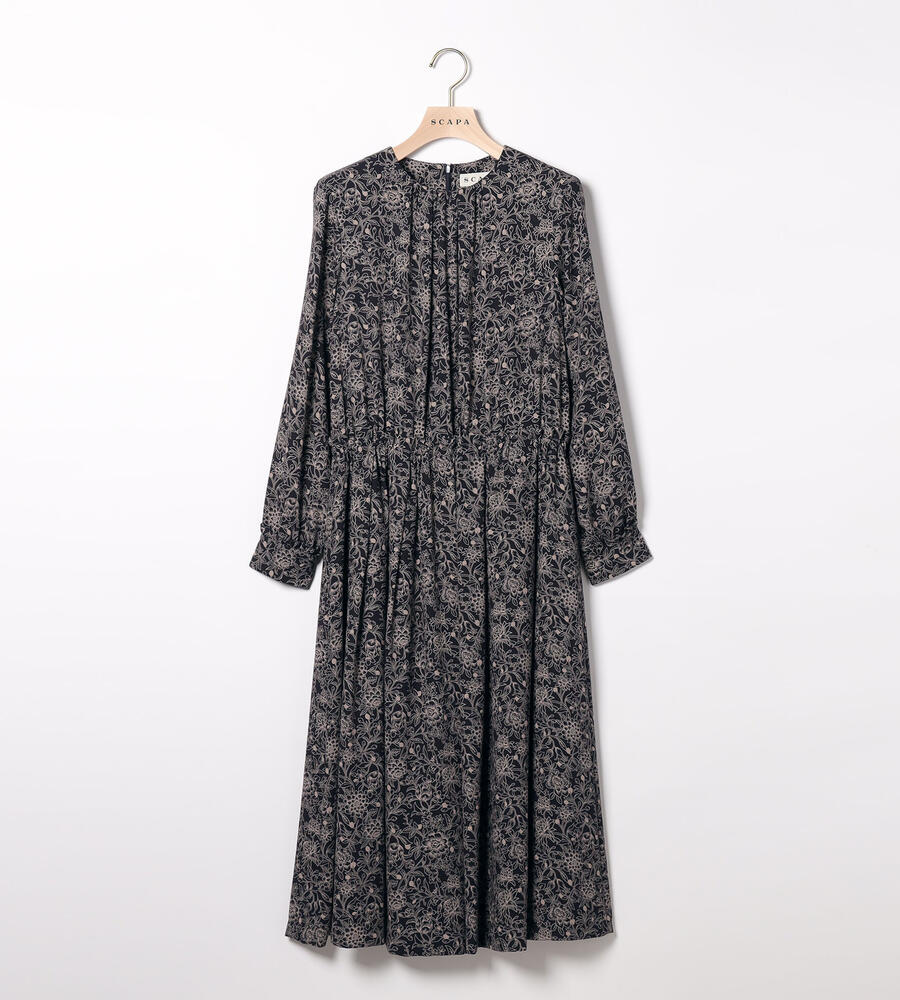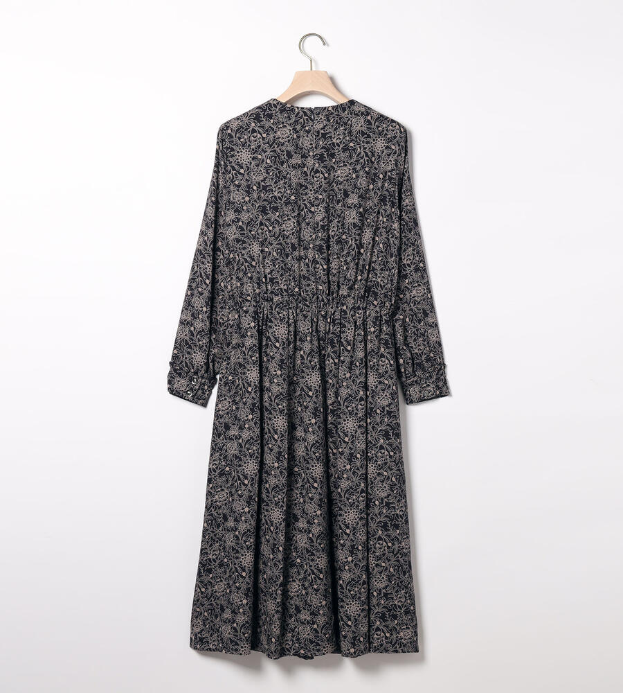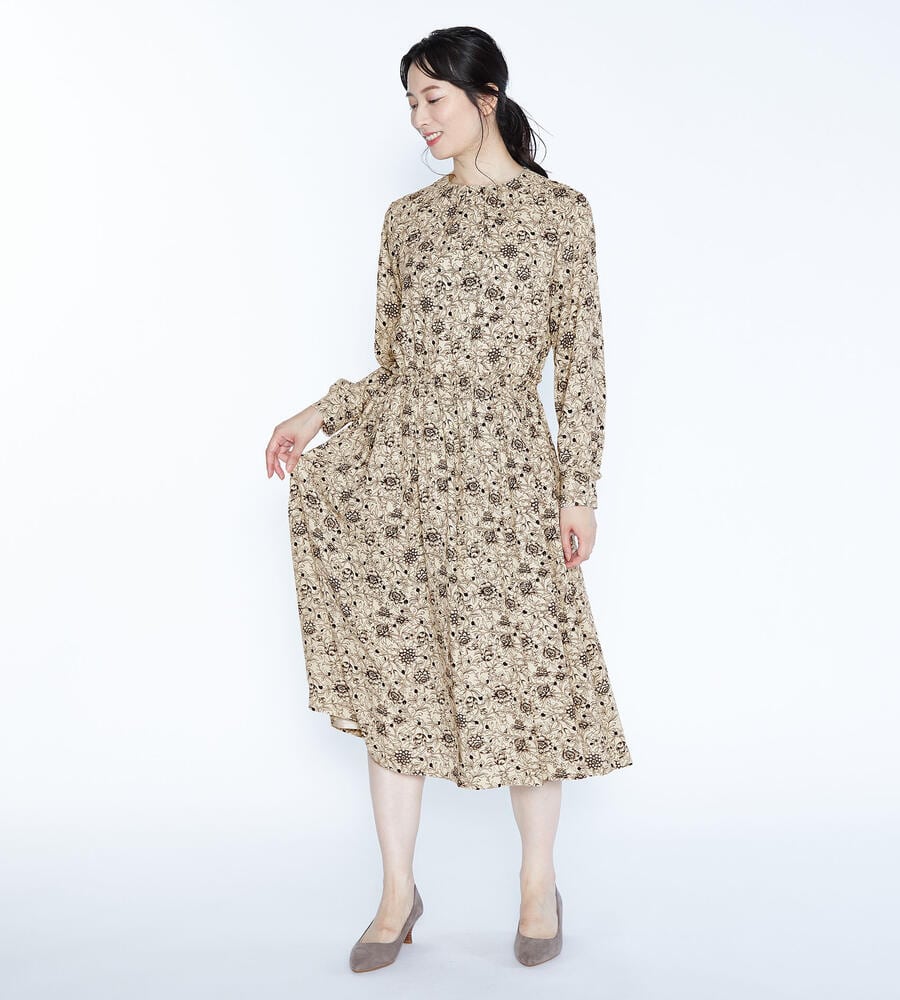 線画でデザインしたフラワープリントの長袖ワンピース。シックな配色やロング丈のデザインで大人のコーディネートに仕上がります。ウエストと袖口の切り替えにはボリューム控えめのフリルをあしらい、女性らしさをさりげなくプラス。存在感があり、1枚でコーディネートが決まるのも魅力のアイテムです。