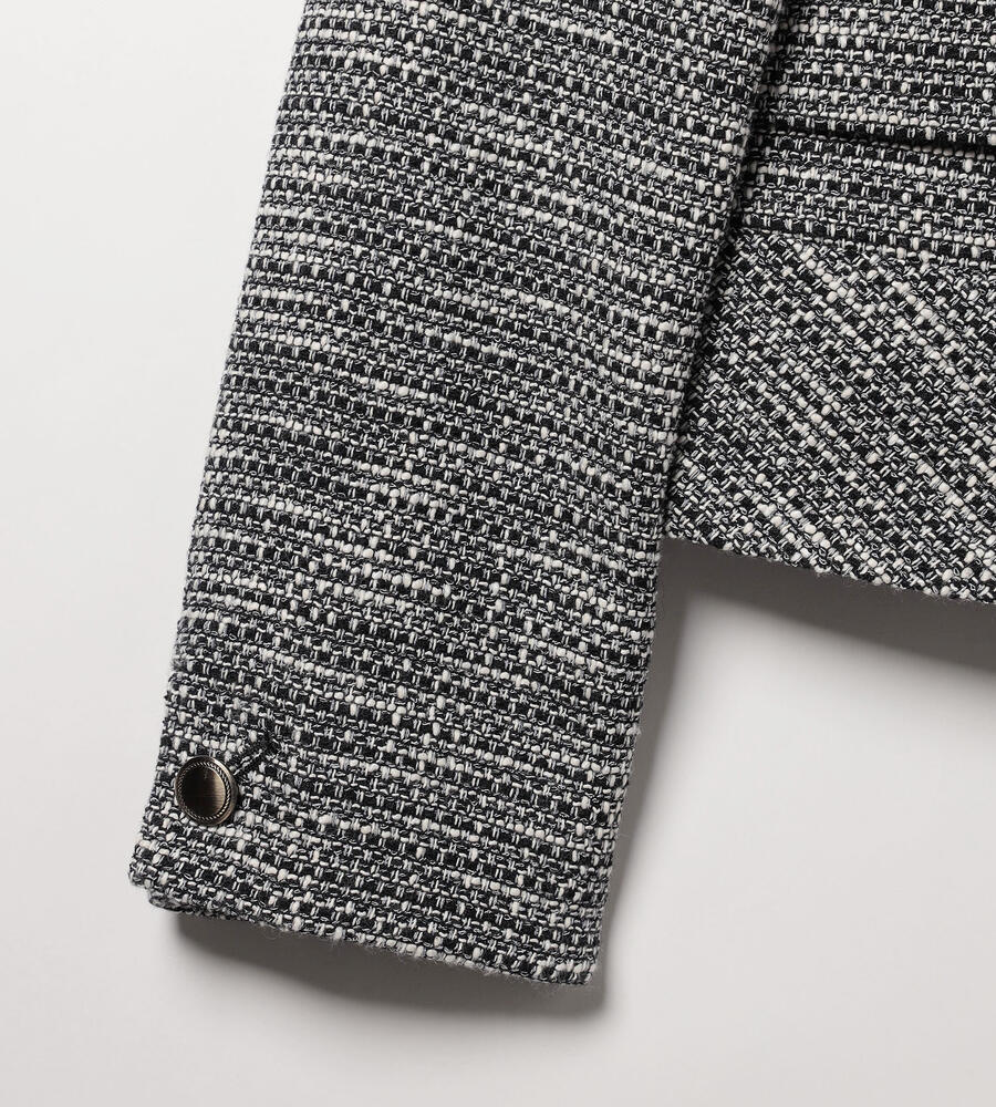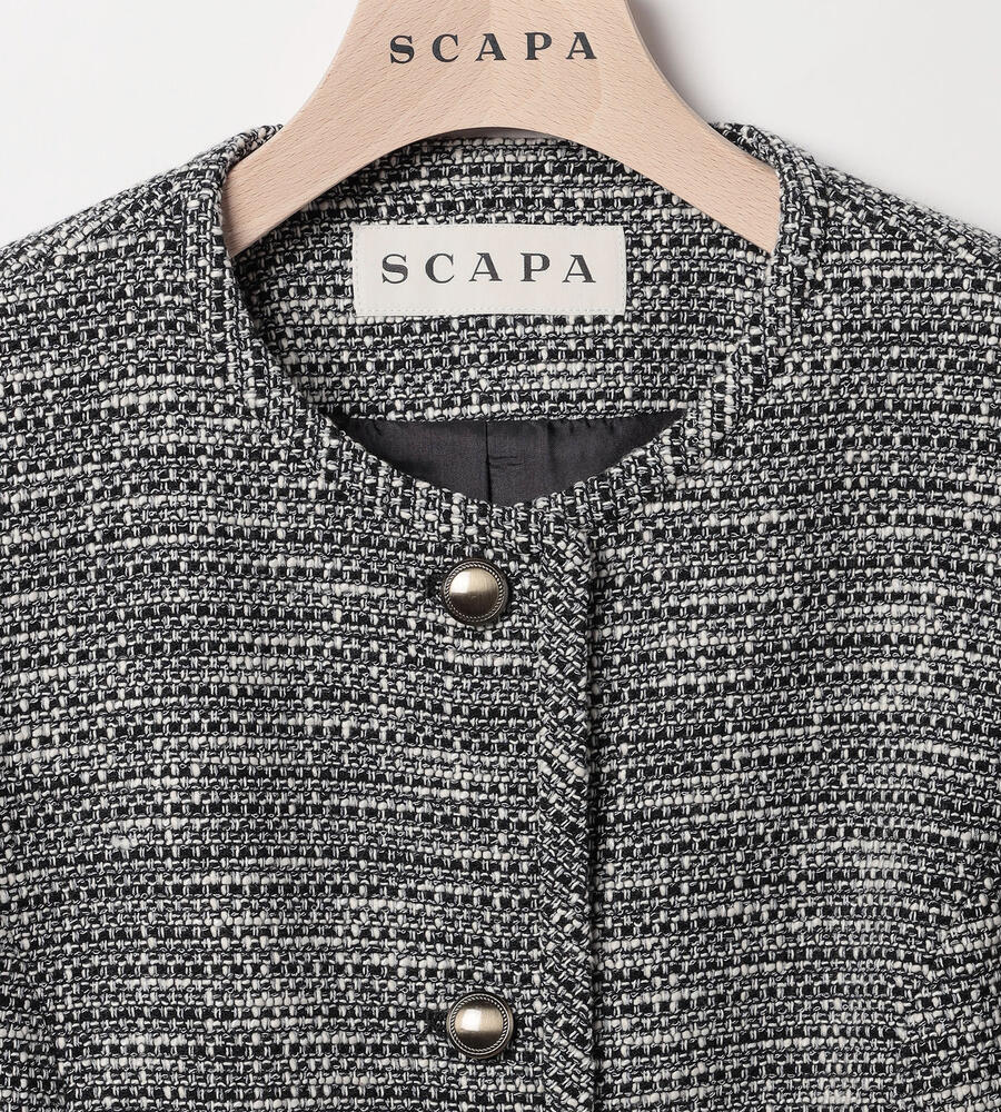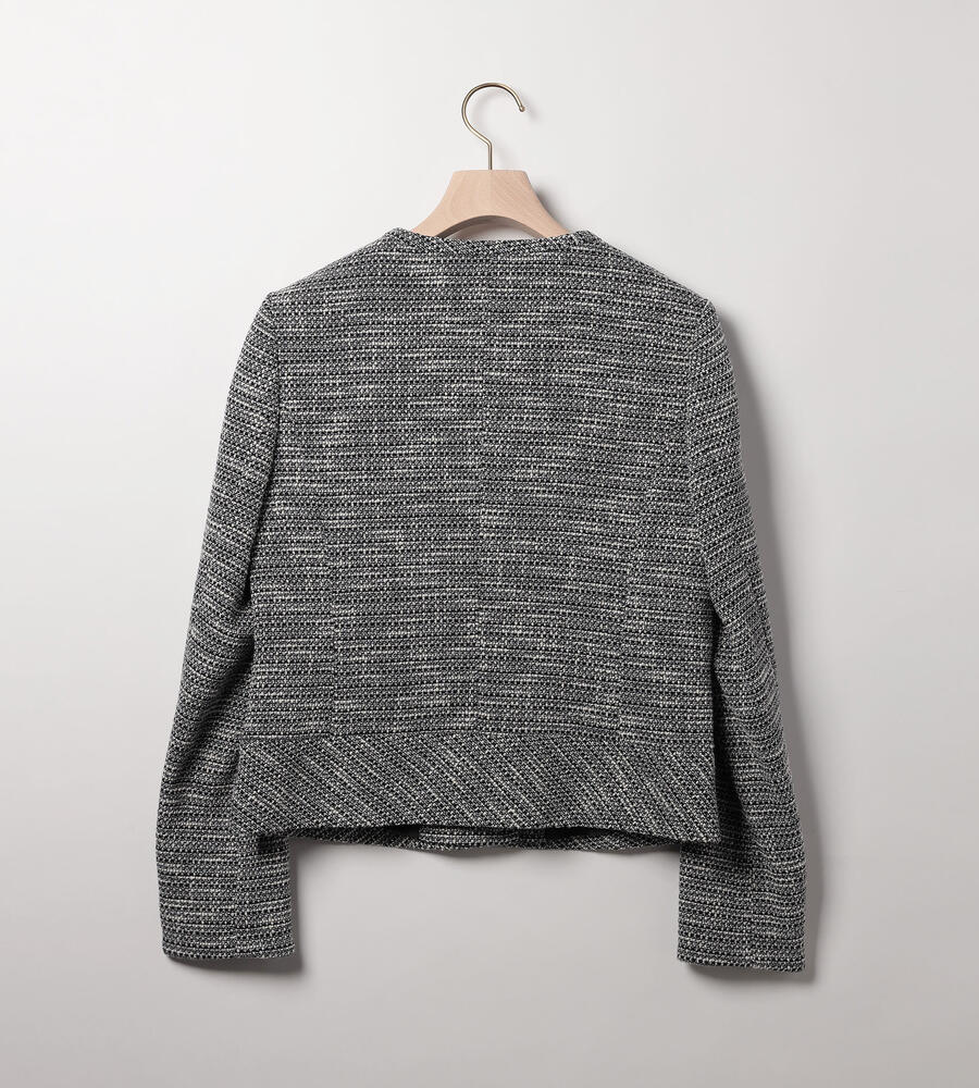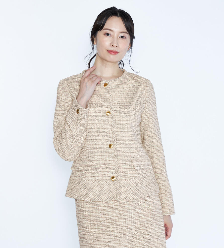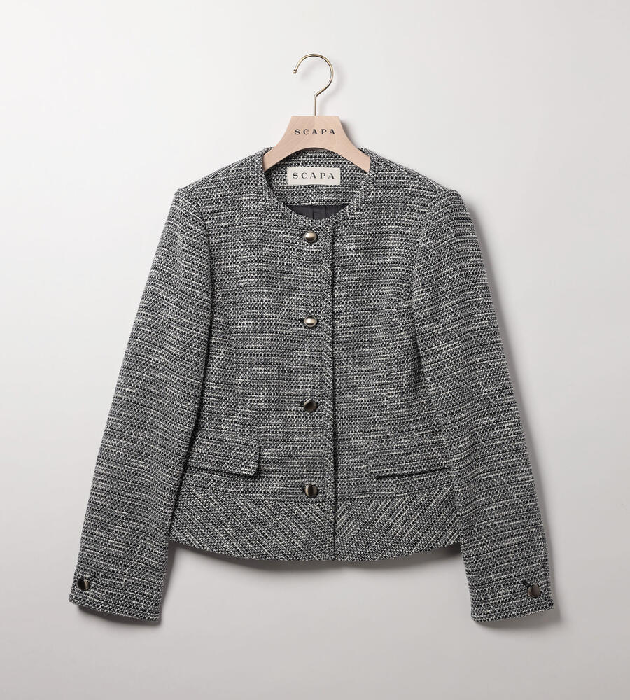 纏うだけでクラシカルな淑女の空気感を高める、ミックスツイードのジャケットです。ノーカラー仕立てにメタリックなボタンを合わせて、ノーブルな雰囲気に仕上げています。裾はわずかに広がりがあり、柔和な女性らしさもプラス。同素材のスカートを合わせると、改まったシーンにも相応しいきちんとした着こなしが完成します。