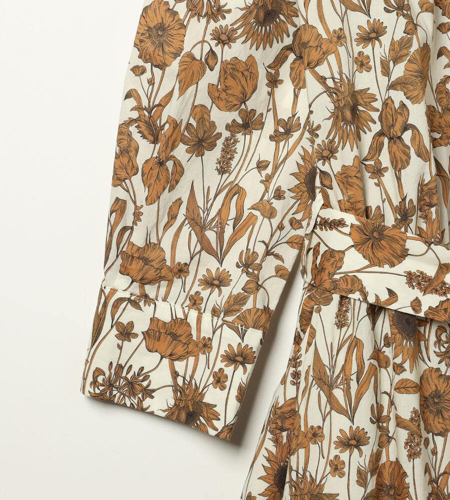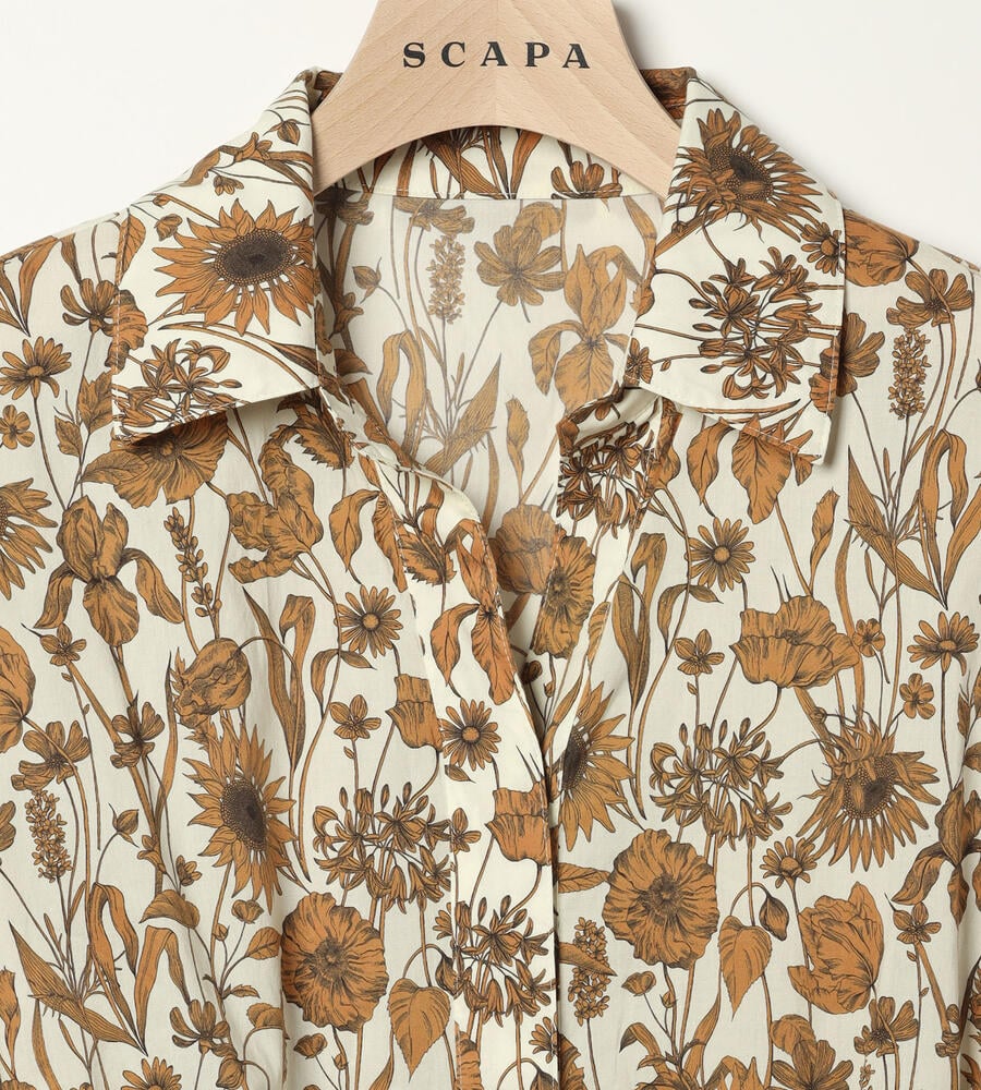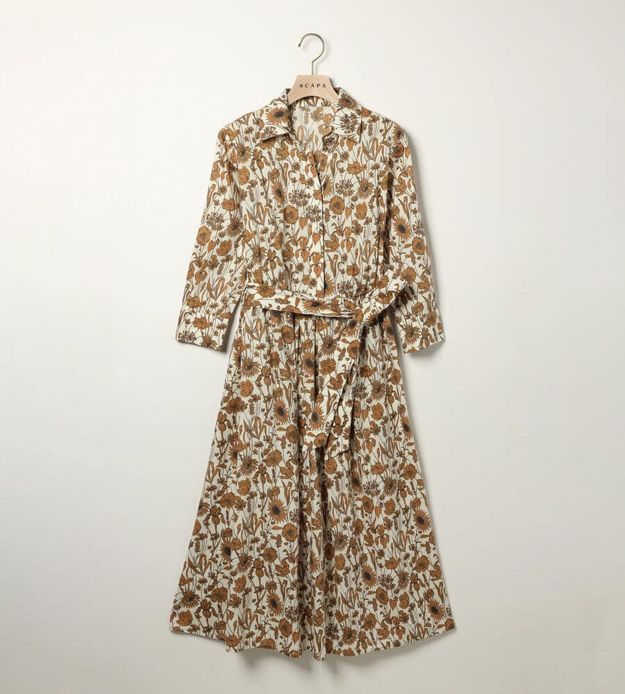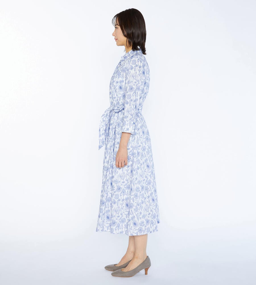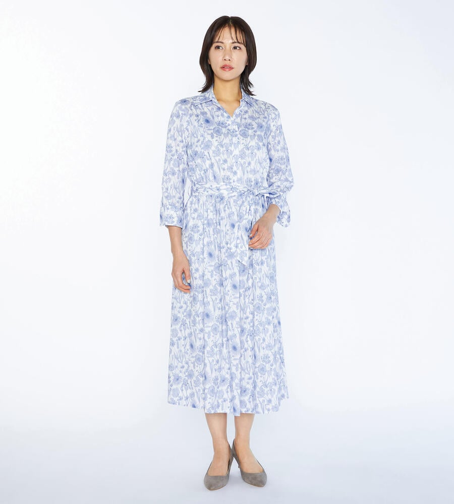 デザイン性の高いプリントで有名なロンドンのリバティ社のリバティプリントワンピース。繊細なタッチのボタニカルフラワープリントが華やかなデザイン。エレガントな膝下ミモレ丈。ウエスト位置に同布のウエストリボンのアクセントでメリハリあるシルエットで着こなせます。おしゃれなお出かけコーディネートが一枚で完成するアイテムです。