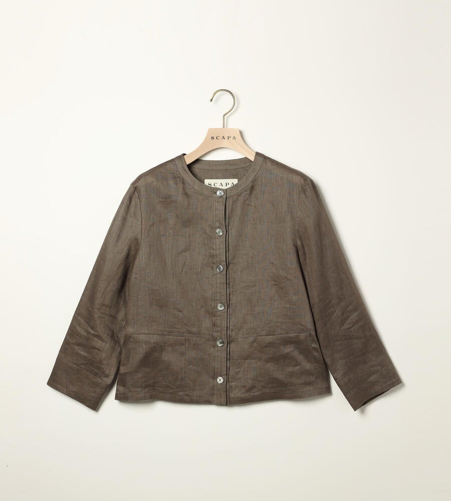 涼しげなシャリ感と上品な光沢感を持ち合わせた麻素材のノーカラージャケット。軽やかな一枚仕立て、かつコンパクトなシルエットで、さらっとシャツのように着こなせます。8分袖と袖口スリット、サイドポケットも特徴。カットソーやワンピースに羽織るほか、前ボタンを閉じてトップス感覚でも着用いただけます。