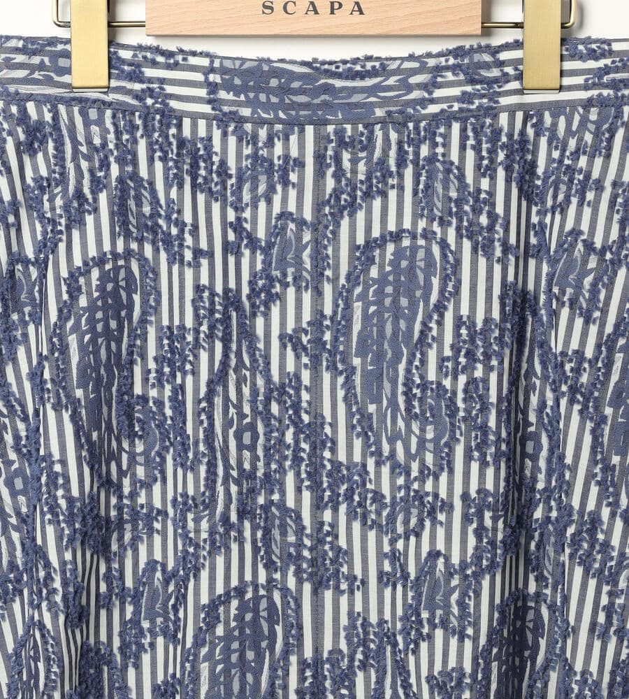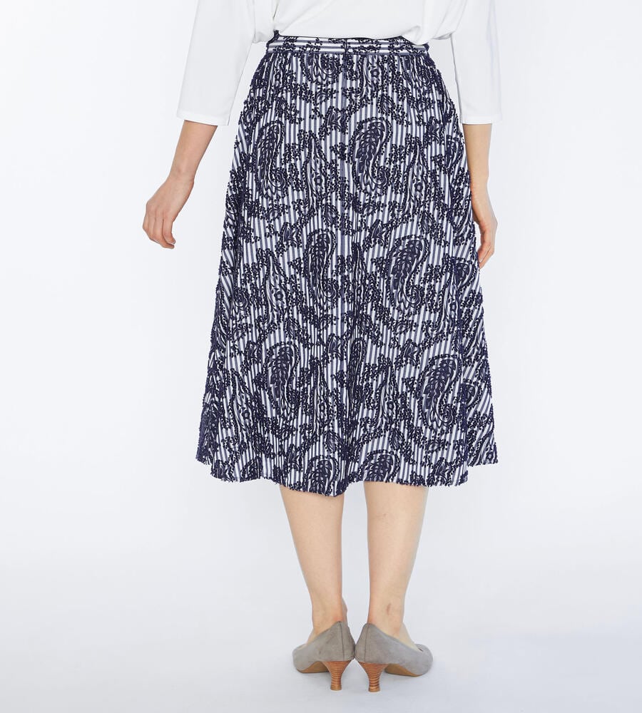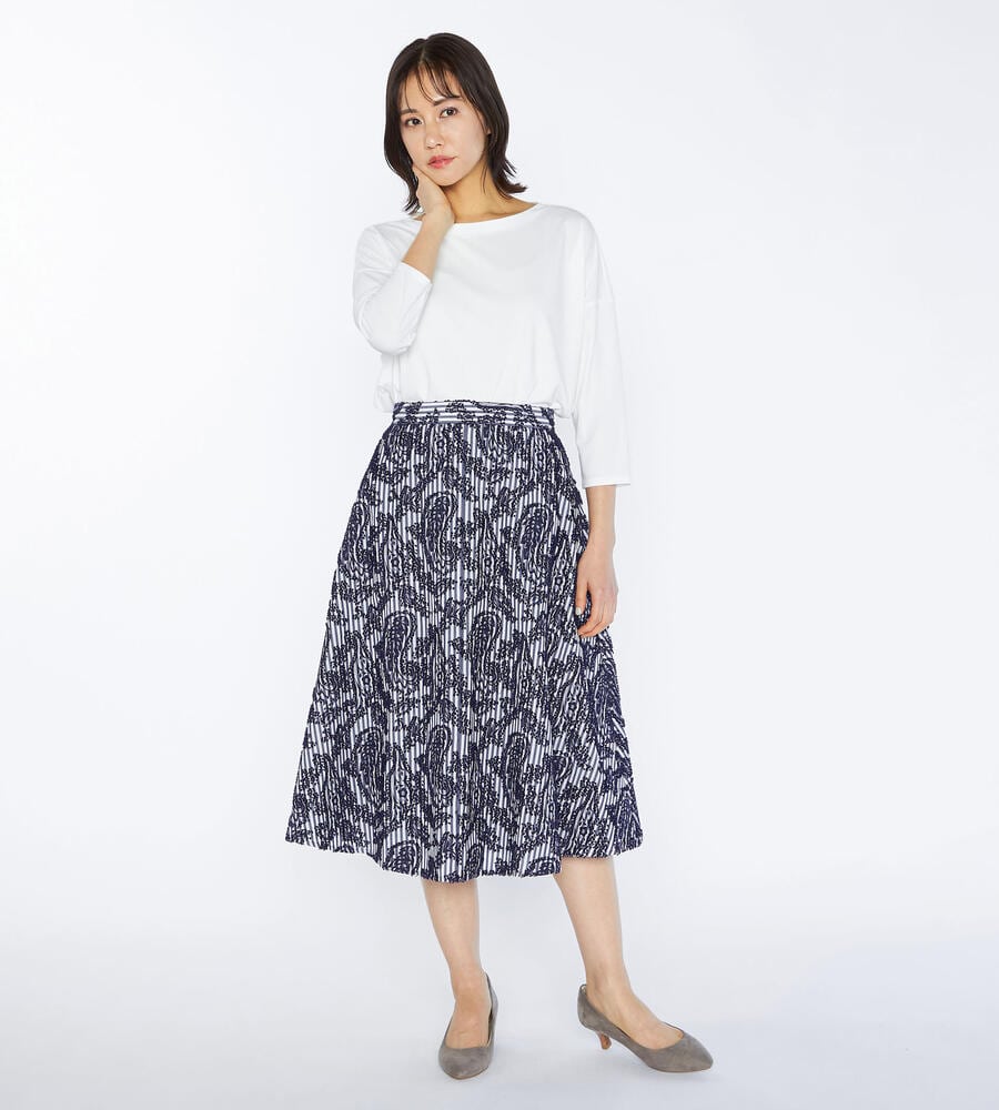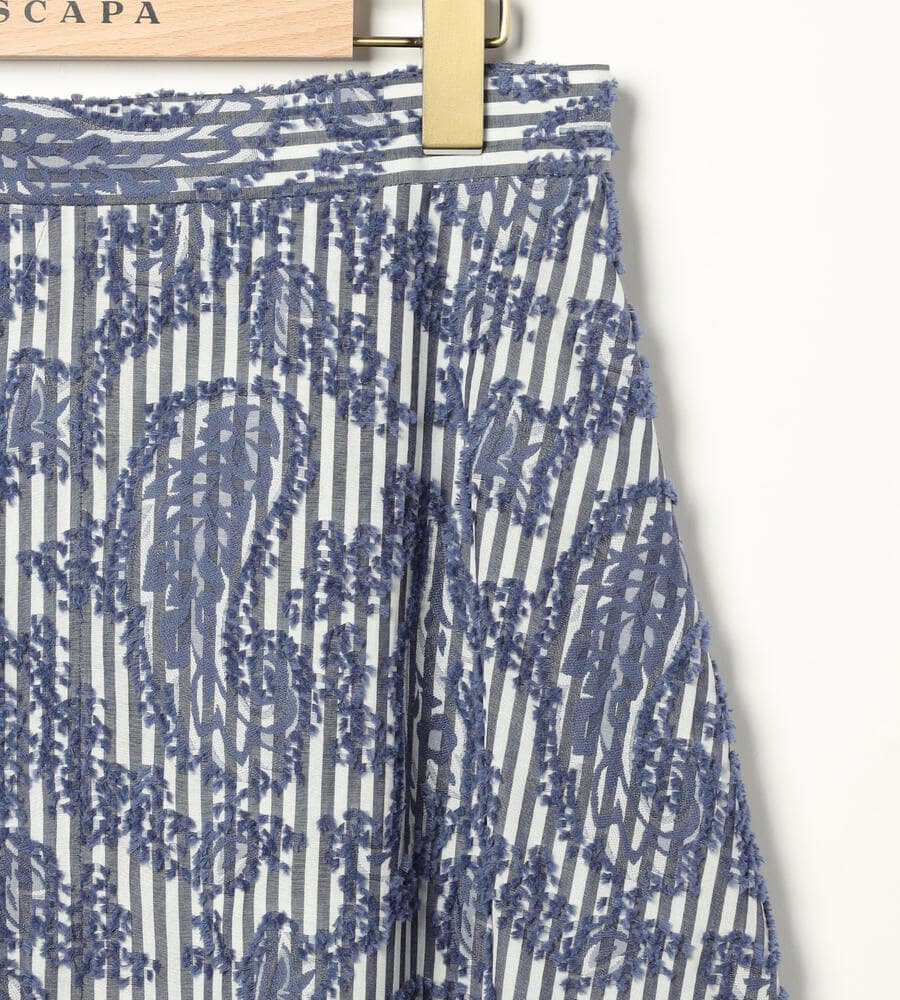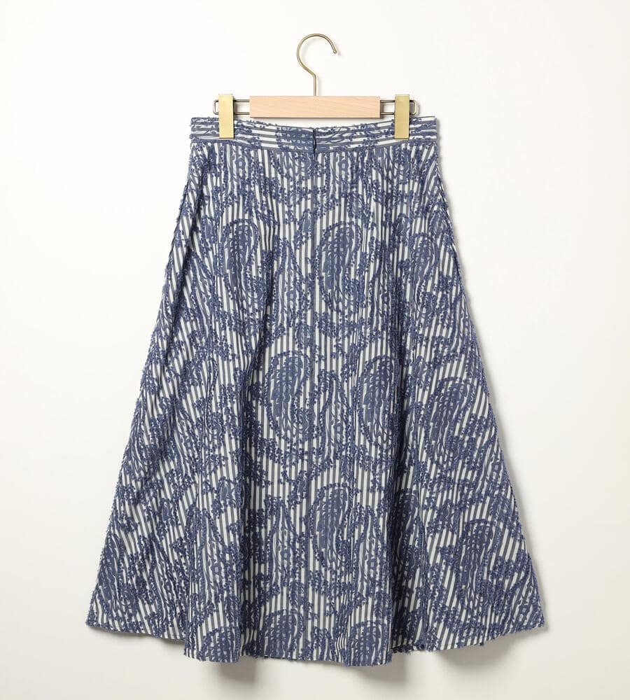 ユニークなストライプと表面感のあるジャカード生地で仕立てたスカート。裾に向かってフレアに広がるAラインのシルエットとドレープ感がフェミニンなデザインポイント。エレガントな膝下ミモレ丈。お手持ちのトップスに合わせるだけで、華やかさのあるおしゃれなお出かけコーディネートが完成するアイテムです。