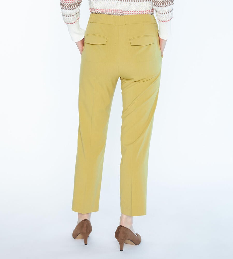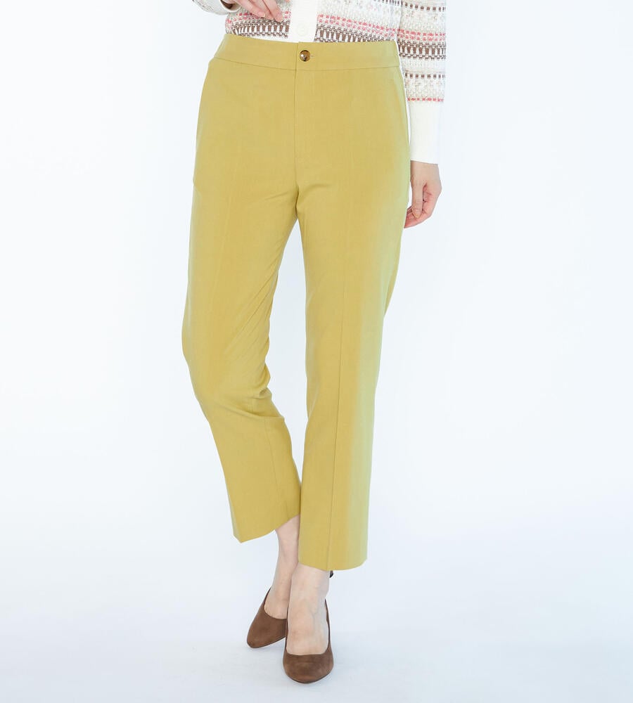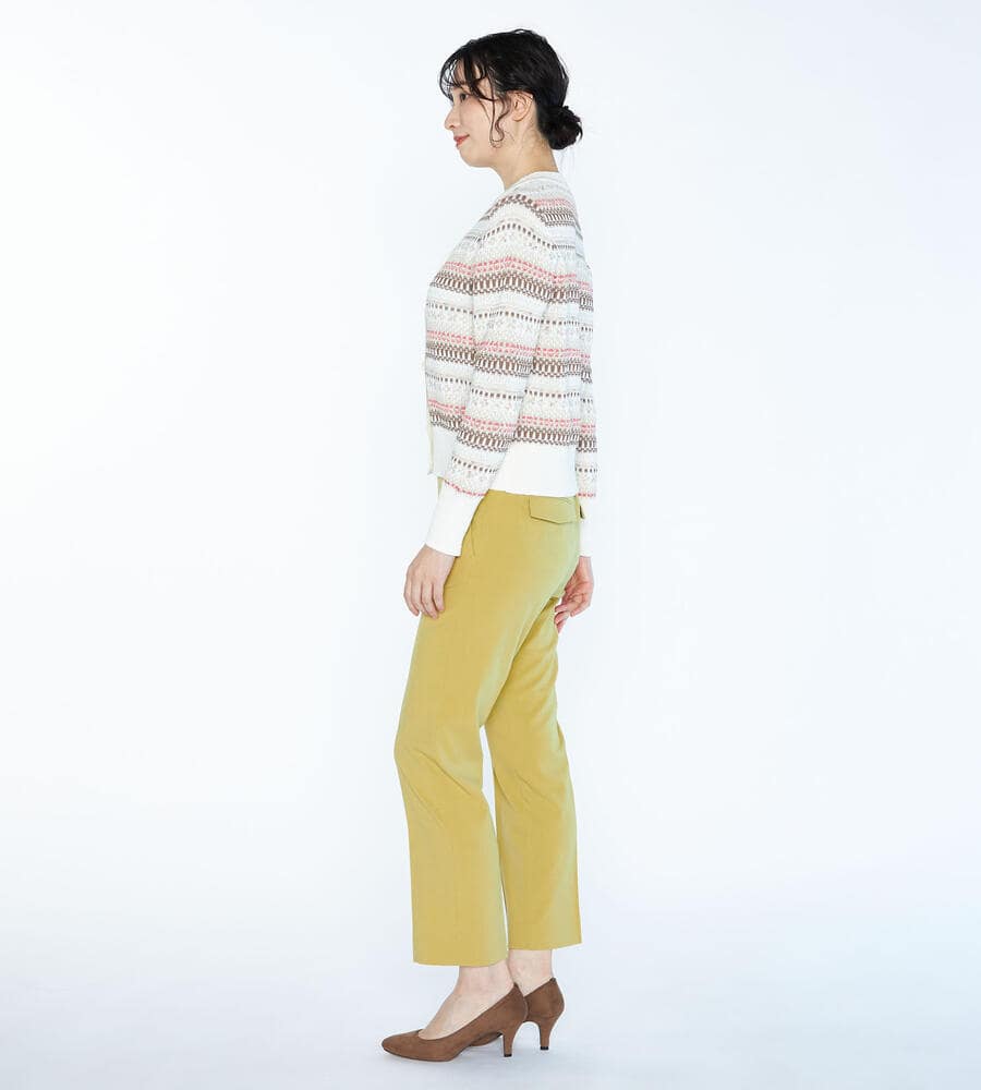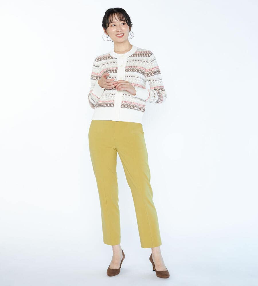 ベーシックに活躍する快適な着心地のボナストレッチパンツ。足首の見えるクロップド丈はシューズとのバランスが取りやすく、スタイリングが軽やかに仕上がるのもポイントです。バックウエストはゴム仕様になっており、トップスインスタイルもキレイに着こなせます。