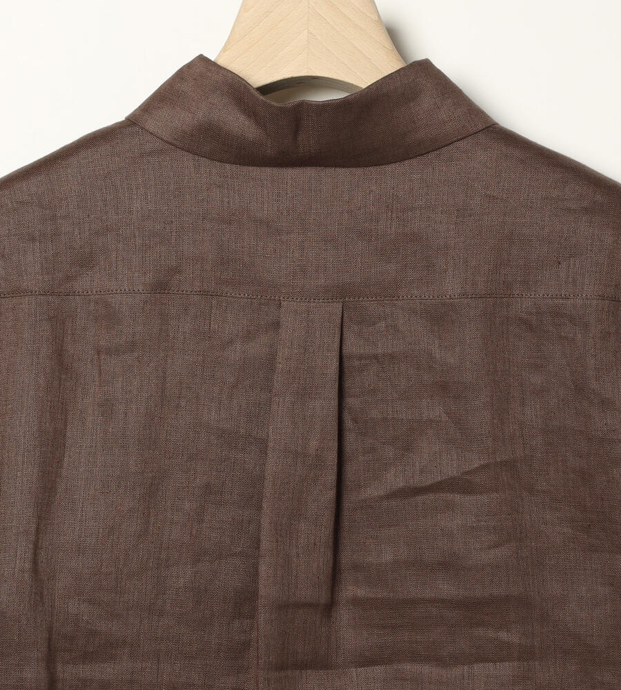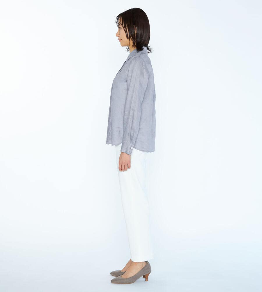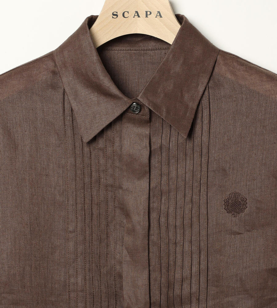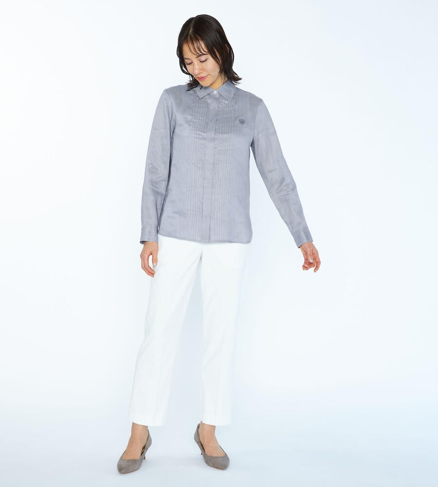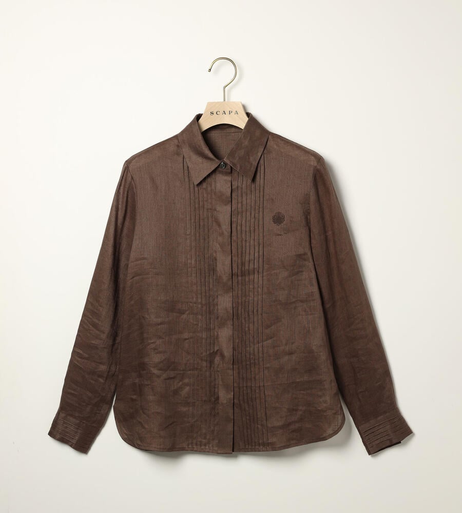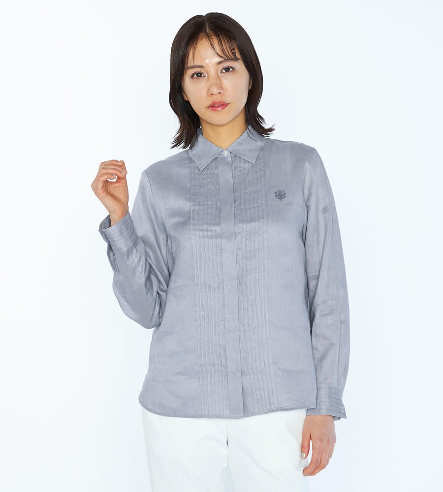 涼しげなシャリ感と上品な光沢感を持ち合わせた麻素材の長袖ブラウス。フロントとカフスのクラシカルなピンタックデザインが、装いに気品を与えてくれます。左胸のロゴ刺繍もさりげないアクセント。すっきりとしたシルエットで、一枚着はもちろん、インナー使いや軽い羽織りとしても着用いただけます。