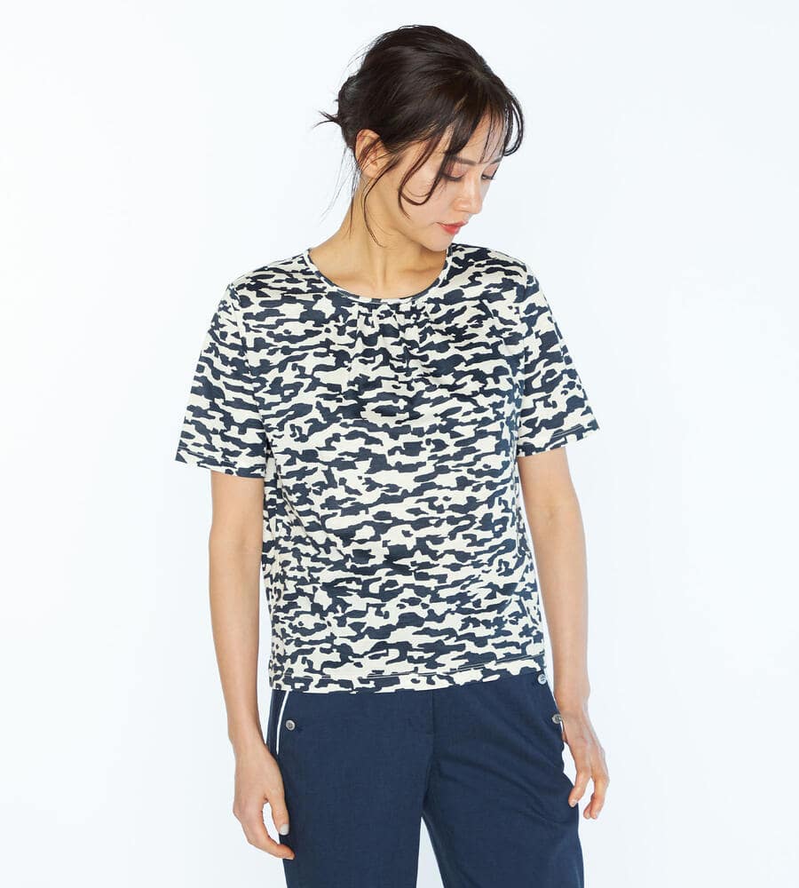 スタイリングのワンポイントに取り入れたい、レオパードプリントの半袖カットソー。フロントネックのギャザーが程よいゆとりを確保しながら、フェミニンなエッセンスも添えています。インナーとしても活躍してくれるアイテムです。