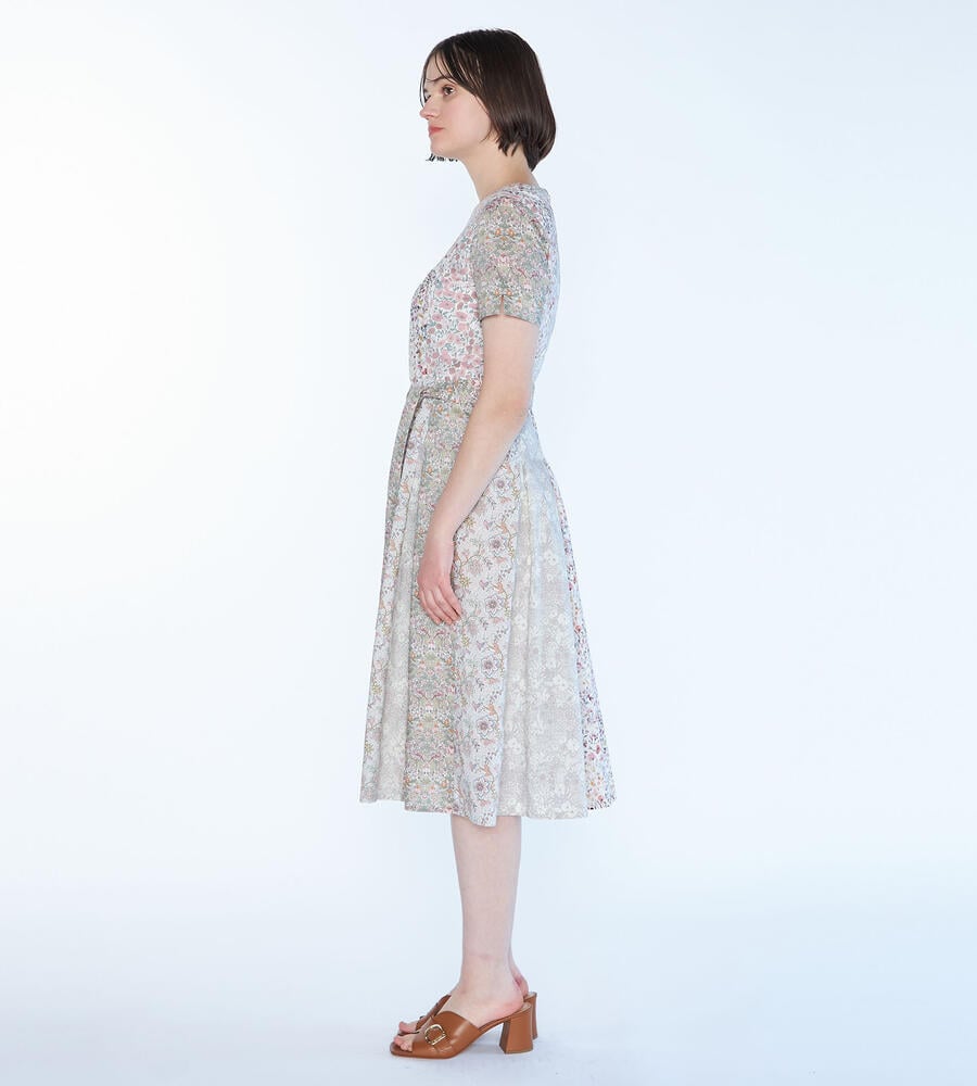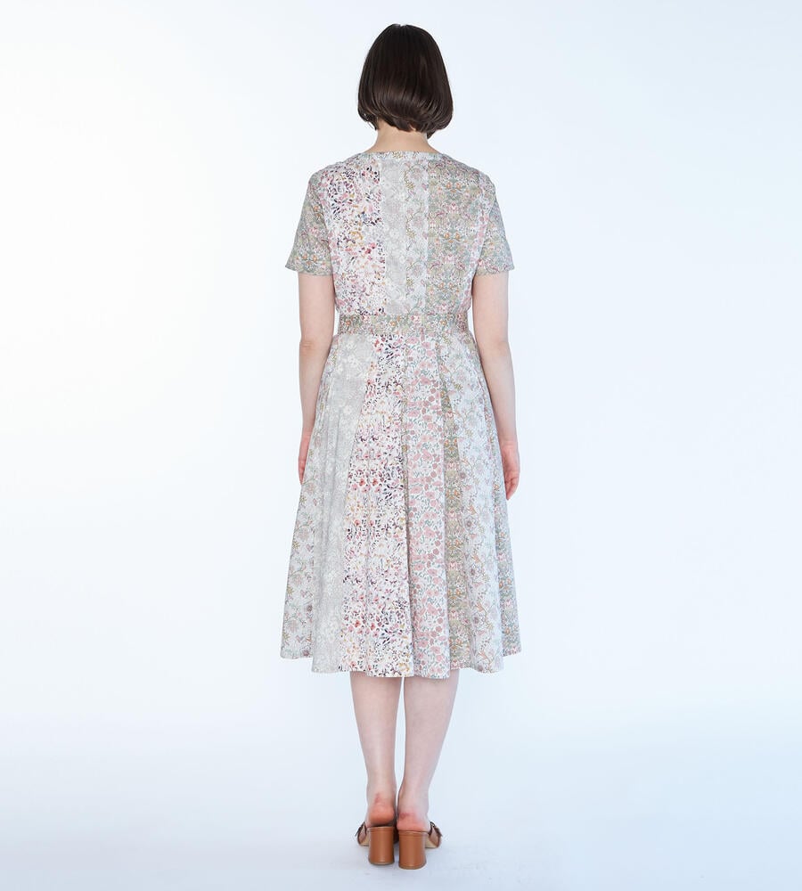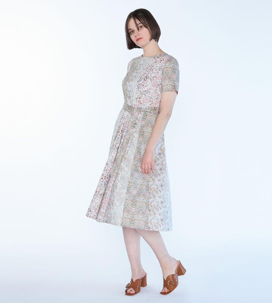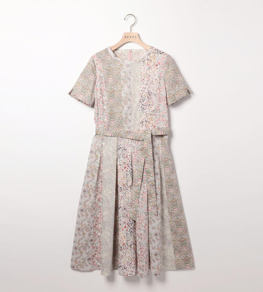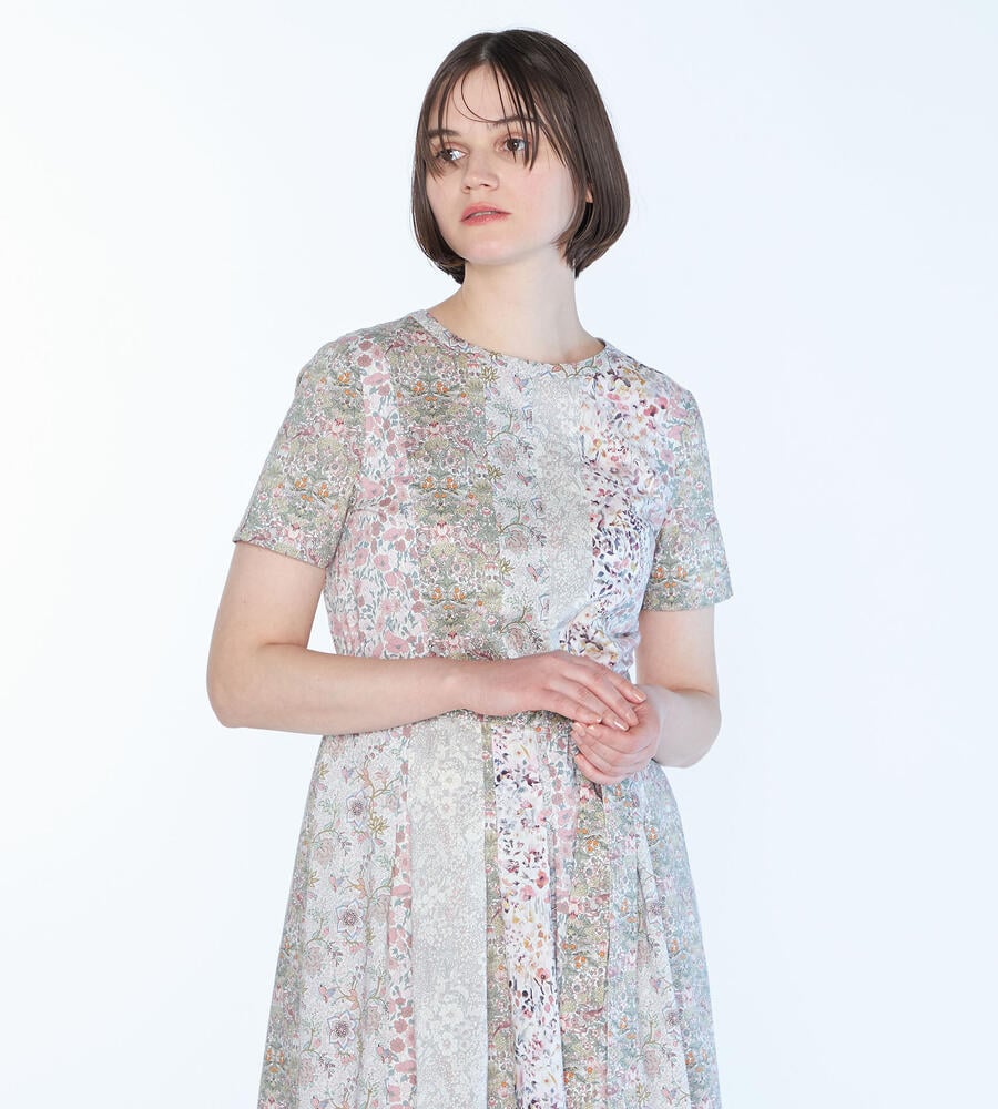伝統あるイギリスのリバティ社のリバティ柄プリントが華やかなデザインの半袖ワンピース。異なるパターンのフラワープリントをパッチワークした華やかなデザインの一枚。プリーツによりフレアに広がるスカートがフェミニンなシルエット。おしゃれでエレガントなお出かけコーディネートが完成するアイテムです。