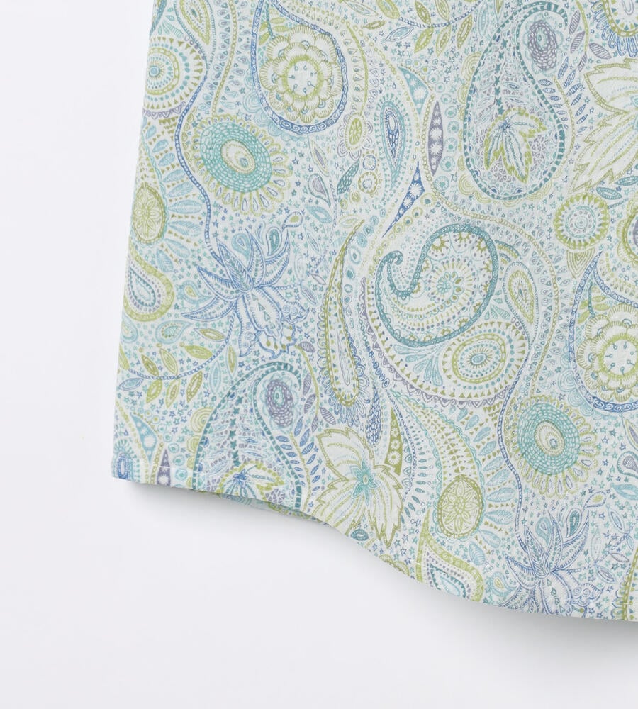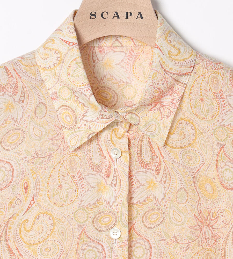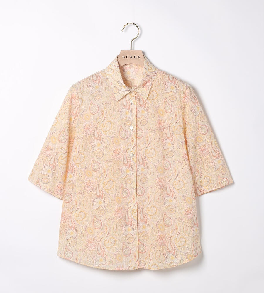 ペイズリー柄を明るく爽やかな印象の配色で描いたブラウス。衿付きのデザインがシャープさをプラスして、幅広いシーンで活用できます。すっきりと着こなせる丈感でパンツともスカートとも好相性のアイテムです。ガウチョパンツと合わせるのもおすすめのコーディネート。シンプルなジレを重ねても素敵です。