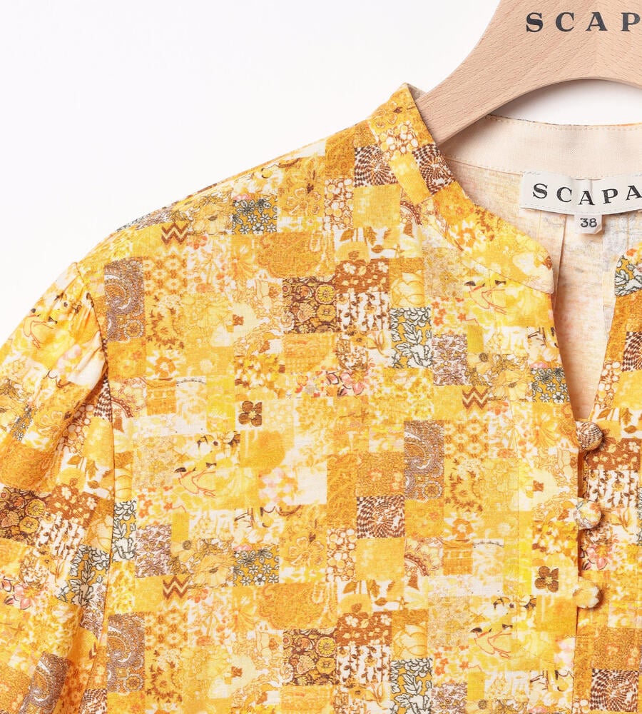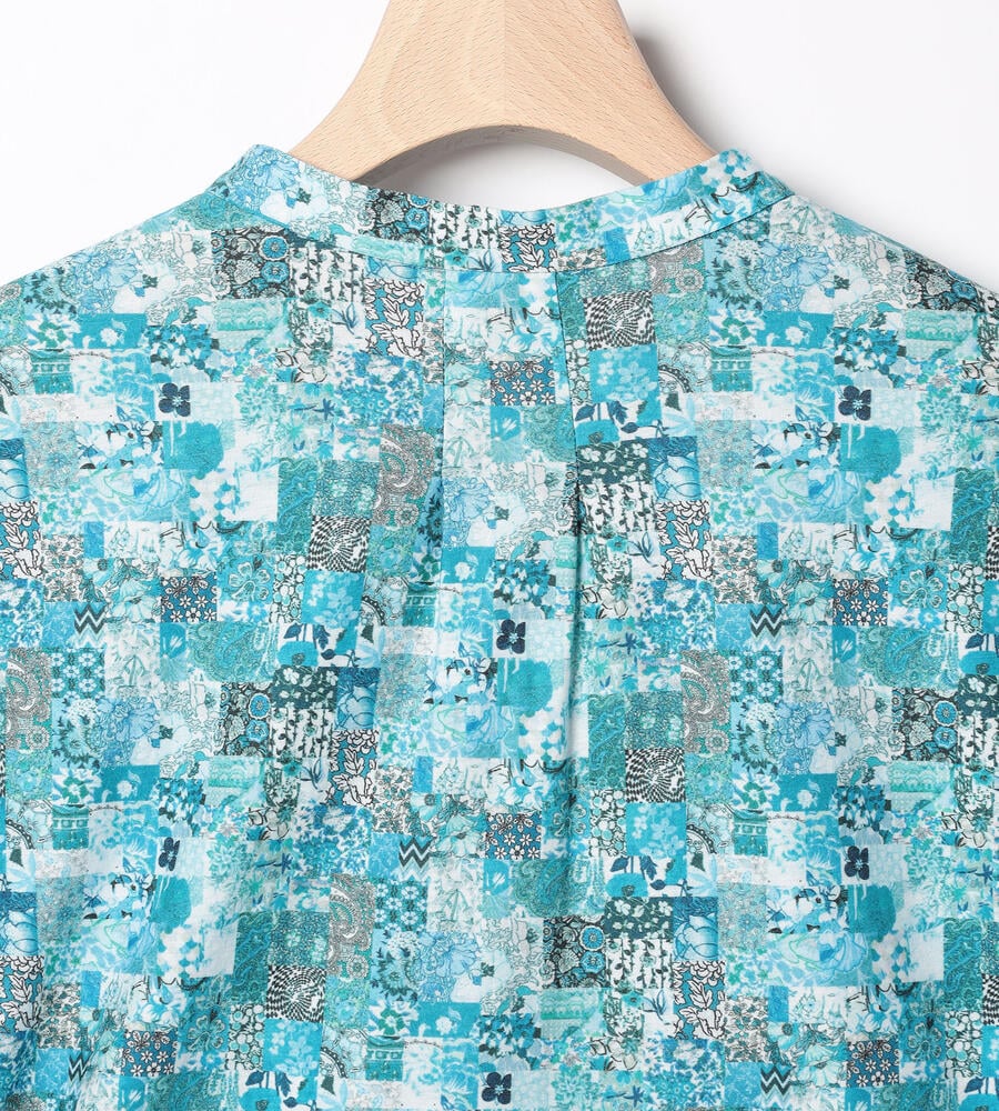 さまざまな柄を組み合わせた、パッチワークを思わせるデザインのカットソー。配色も明るく目を引き、コーディネートのポイントとして活躍します。ネックのカッティングは顔回りをすっきりと演出。くるみボタンを取り入れて、細部にまでこだわって仕上げています。シンプルなカーディガンのインナーとしても便利です。