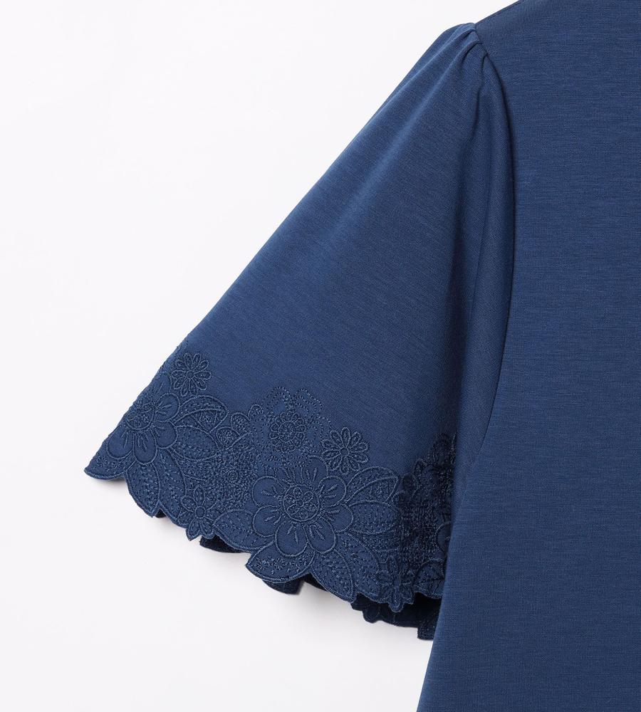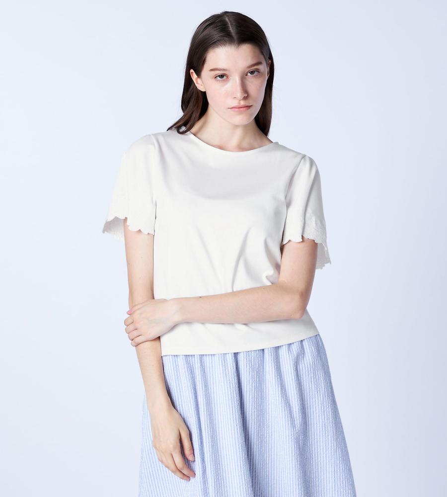 袖口にフラワー刺繍をあしらったエレガントなカットソーです。ほんのりツヤ感のあるクリアな風合い、フレアスリーブ、すっきりしたシルエットなどもポイント。カジュアルになりがちなカットソーながら、品よく着こなしていただけるアイテムです。一枚着はもちろん、カーディガンやシャツのインナーにもおすすめです。