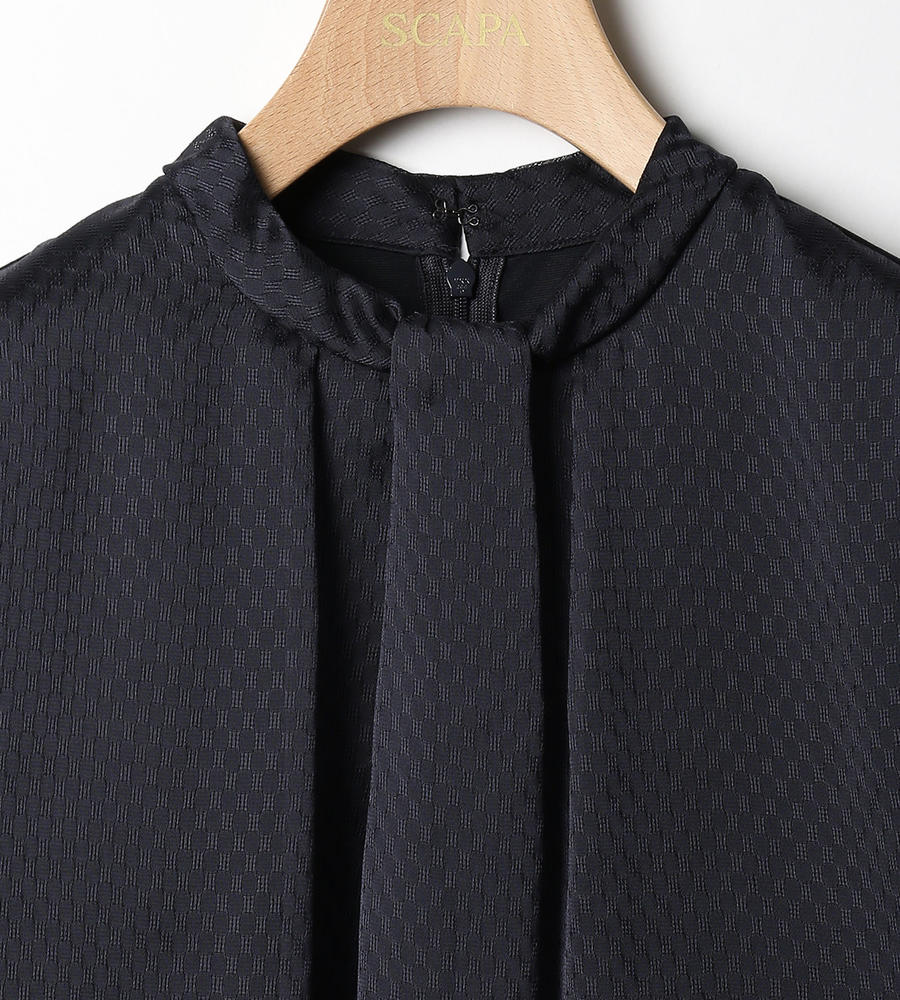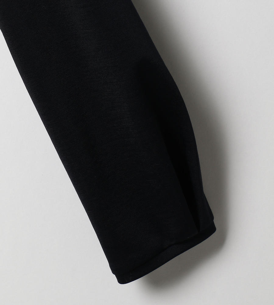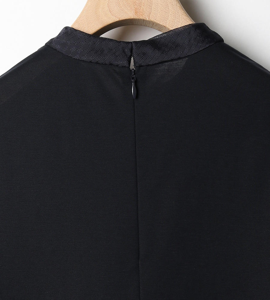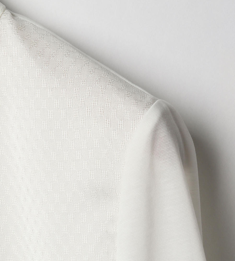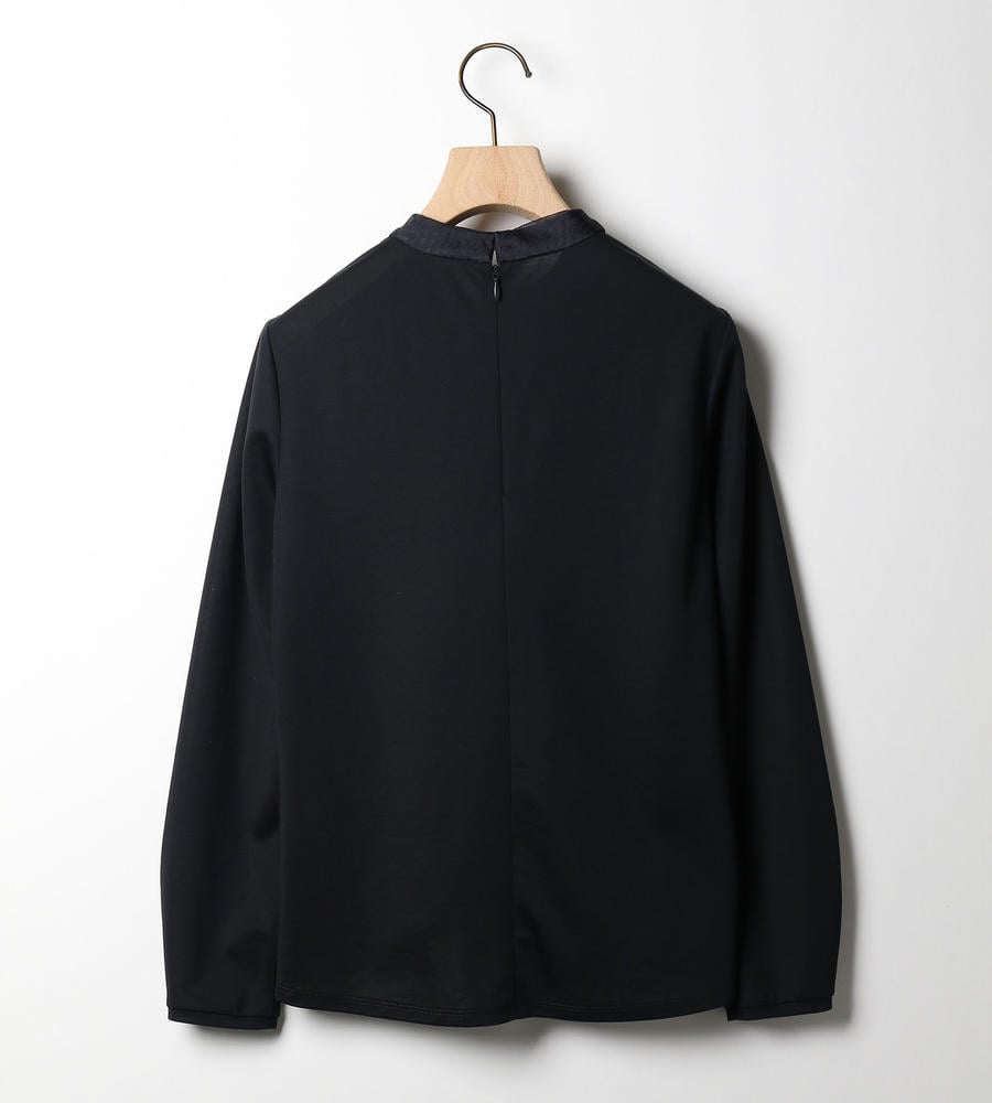 ポリエステルコットンの繊細なジャージーを用いた長袖カットソーです。ネックラインから前身頃にかけて、メッシュ地の布帛で切り替えたブラウスライクなデザイン。タックによるボウタイ風デザインと、フロントのブラウジングが特徴です。袖口は切り替えを入れて立体感を演出しています。上品さ漂う一枚は、通勤スタイルにもフィットします。