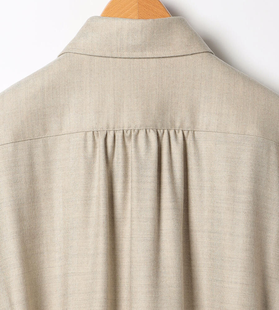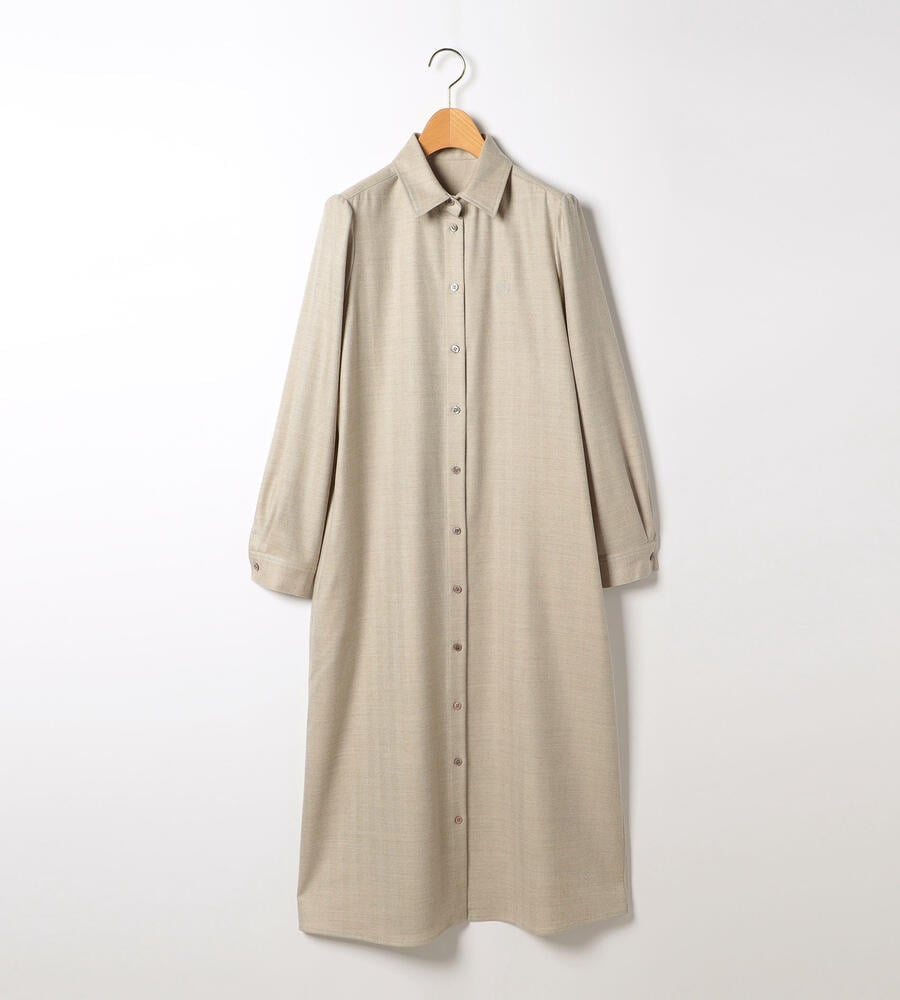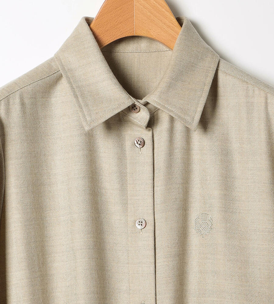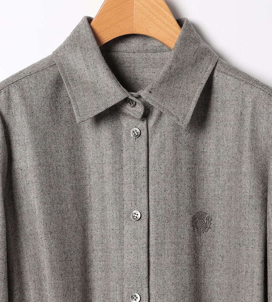 毛混のヘリンボーン生地を用いた秋冬仕様のシャツワンピース。左胸にワンポイント刺繍を添えたシンプルなデザインです。シルエットは控えめなフレアラインに、動きのあるバックギャザーでニュアンス感をプラス。リボンベルトの着脱やスタイリング次第で、モードにもエレガントなスタイルも楽しめます。