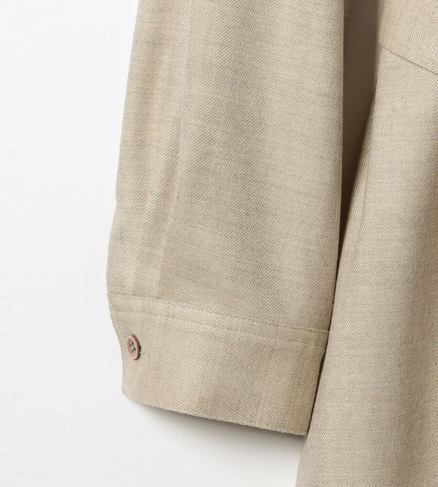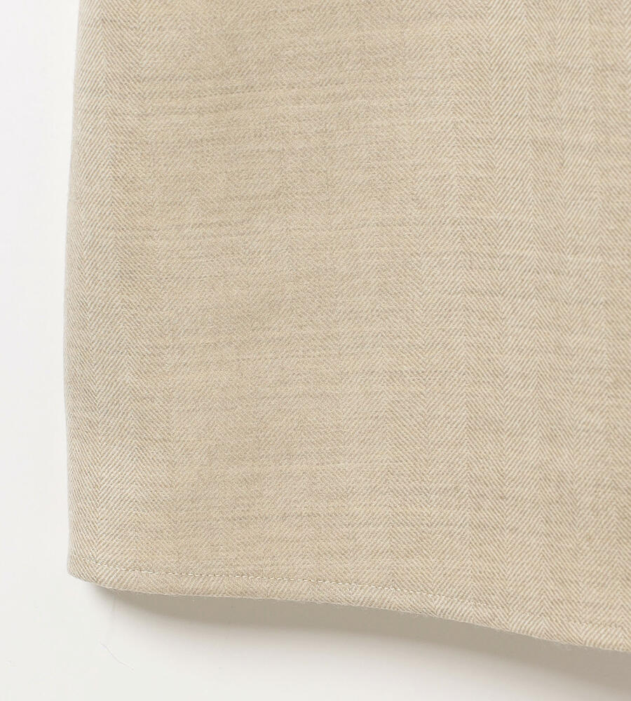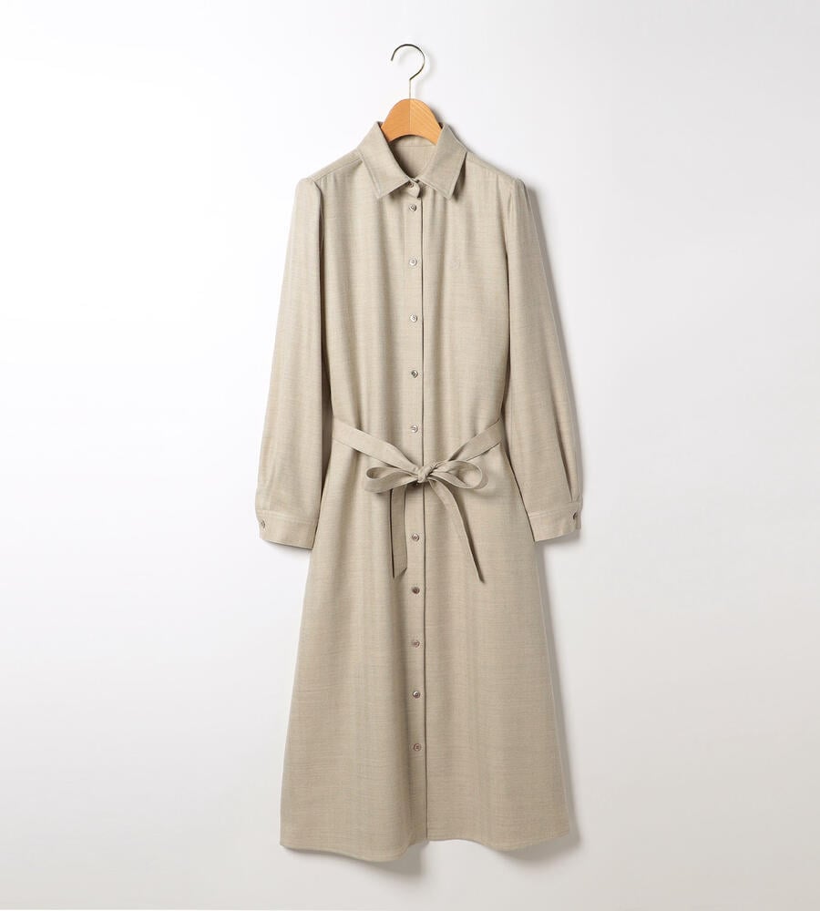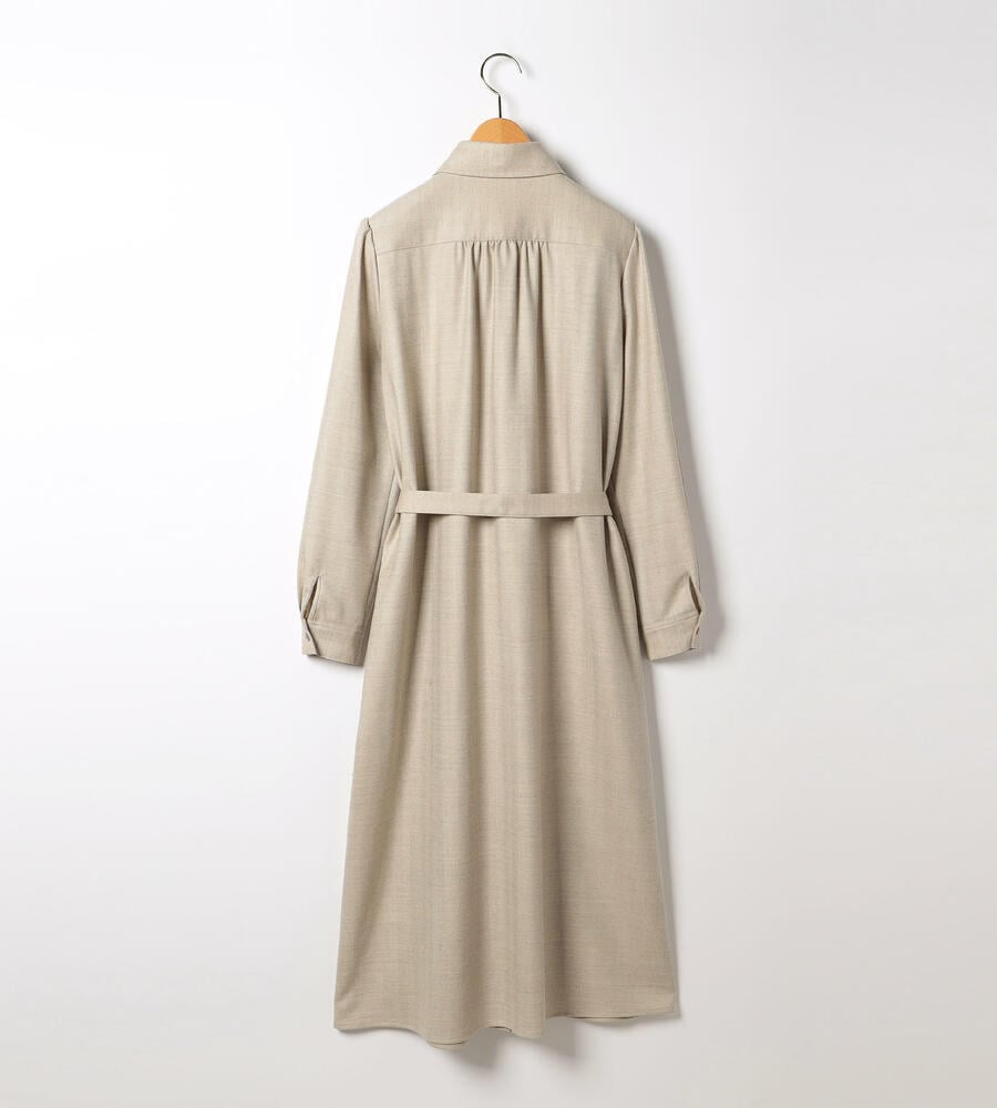 毛混のヘリンボーン生地を用いた秋冬仕様のシャツワンピース。左胸にワンポイント刺繍を添えたシンプルなデザインです。シルエットは控えめなフレアラインに、動きのあるバックギャザーでニュアンス感をプラス。リボンベルトの着脱やスタイリング次第で、モードにもエレガントなスタイルも楽しめます。