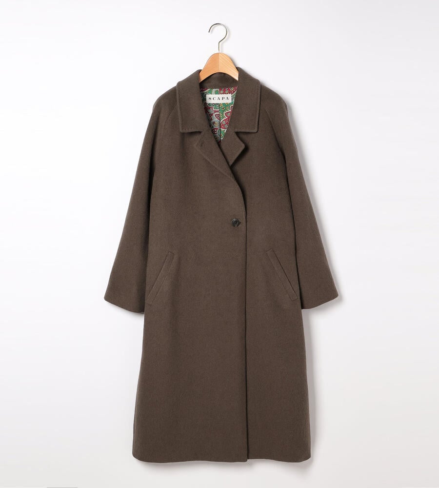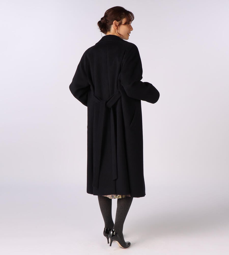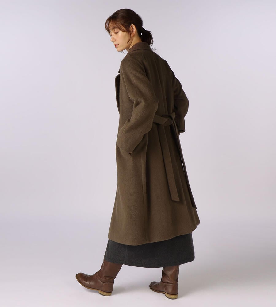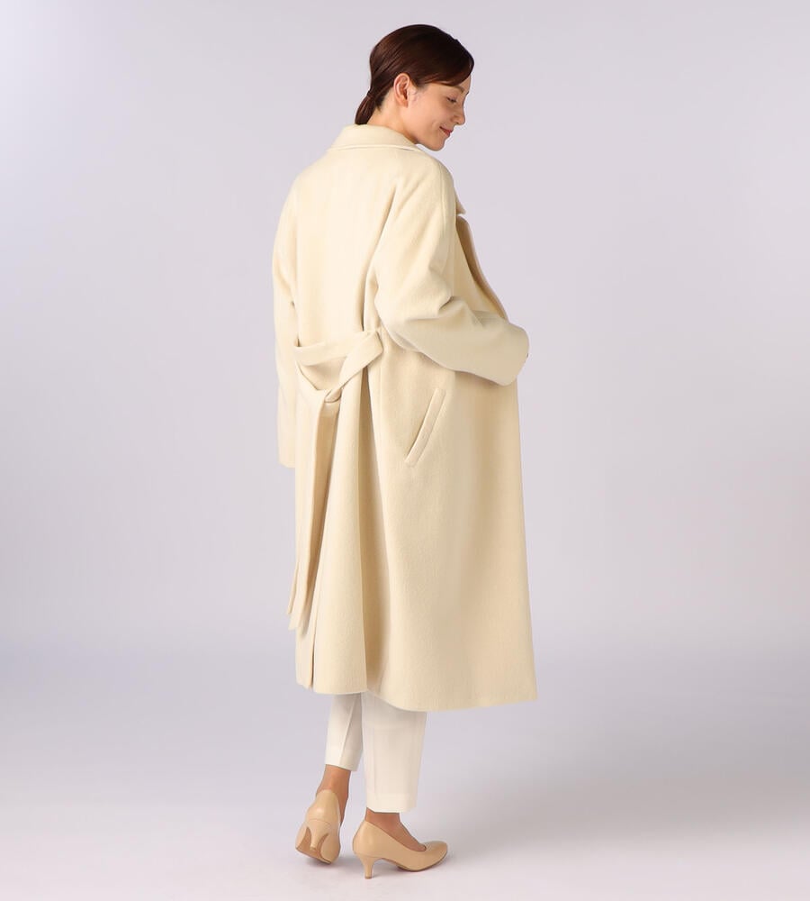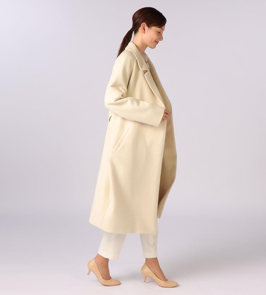 滑らかで気品が漂うアンゴラシャギー素材がウィンタースタイルを格上げするチェスターコート。膝までのロング丈で、防寒性に優れています。ウエストには共布のベルトが付属。普段のパンツスタイルやワンピースの上に羽織るだけで、女性らしく暖かなコーディネートが完成します。両サイドにポケット付き。