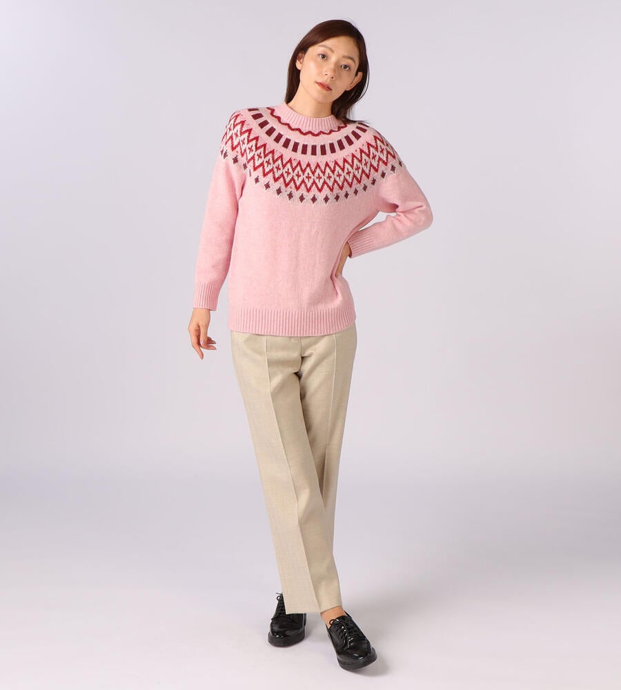 英国の伝統的なフェアアイル柄をあしらった、長袖クルーネックニットです。明るいカラーリングにより、重くなりがちな秋冬シーズンの着こなしにアクセントをプラスしてくれるアイテム。シンプルな無地のボトムとはもちろん、チェック柄とも好相性。上質なウール素材で暖かく、長くご愛用いただきたいニットです。