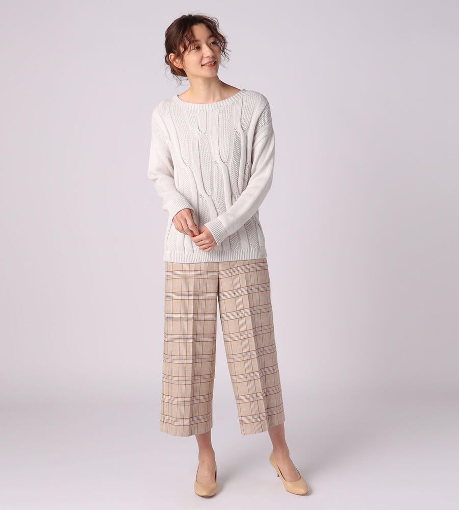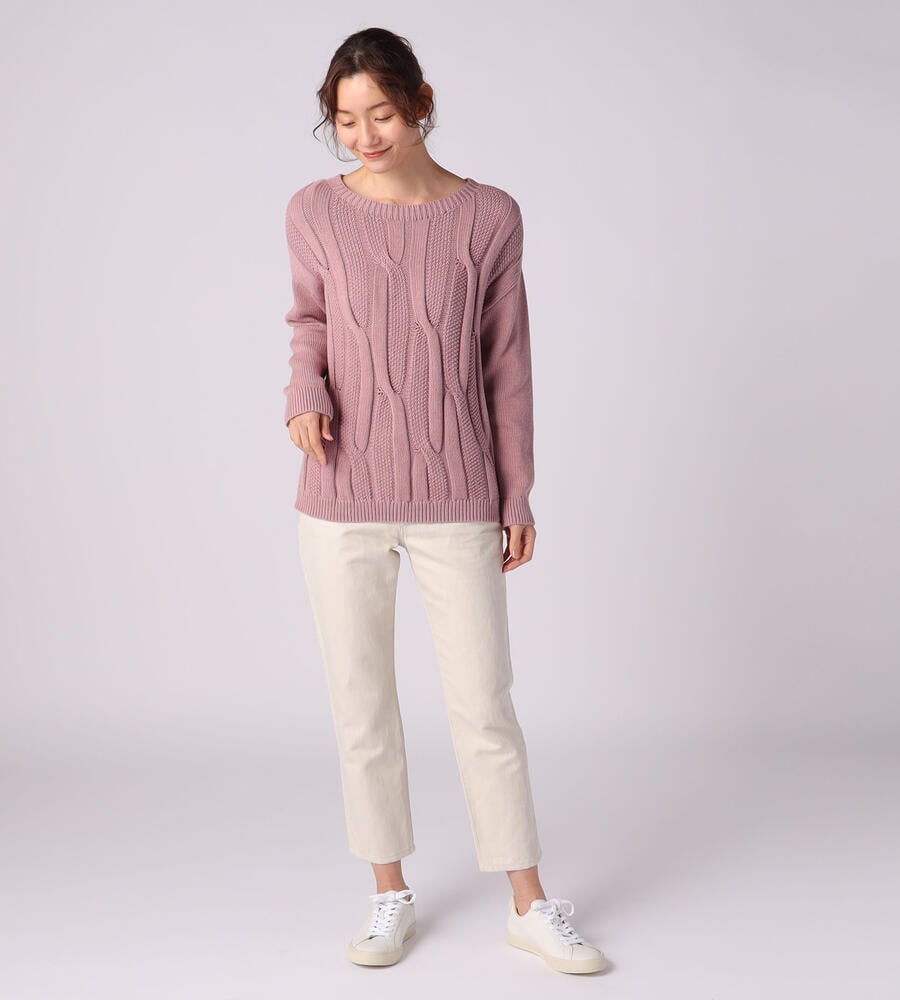 立体感のある編み柄で豊かな表情を出したプルオーバー。バックと袖は柄を控えたことでメリハリも加わっています。単色糸を編み立てており、着こなしやすさも魅力のアイテムです。シルエットは適度なゆとりでトレンドライクな印象。着丈は長すぎず短すぎず、さまざまなボトムスとのコーディネートを楽しめます。