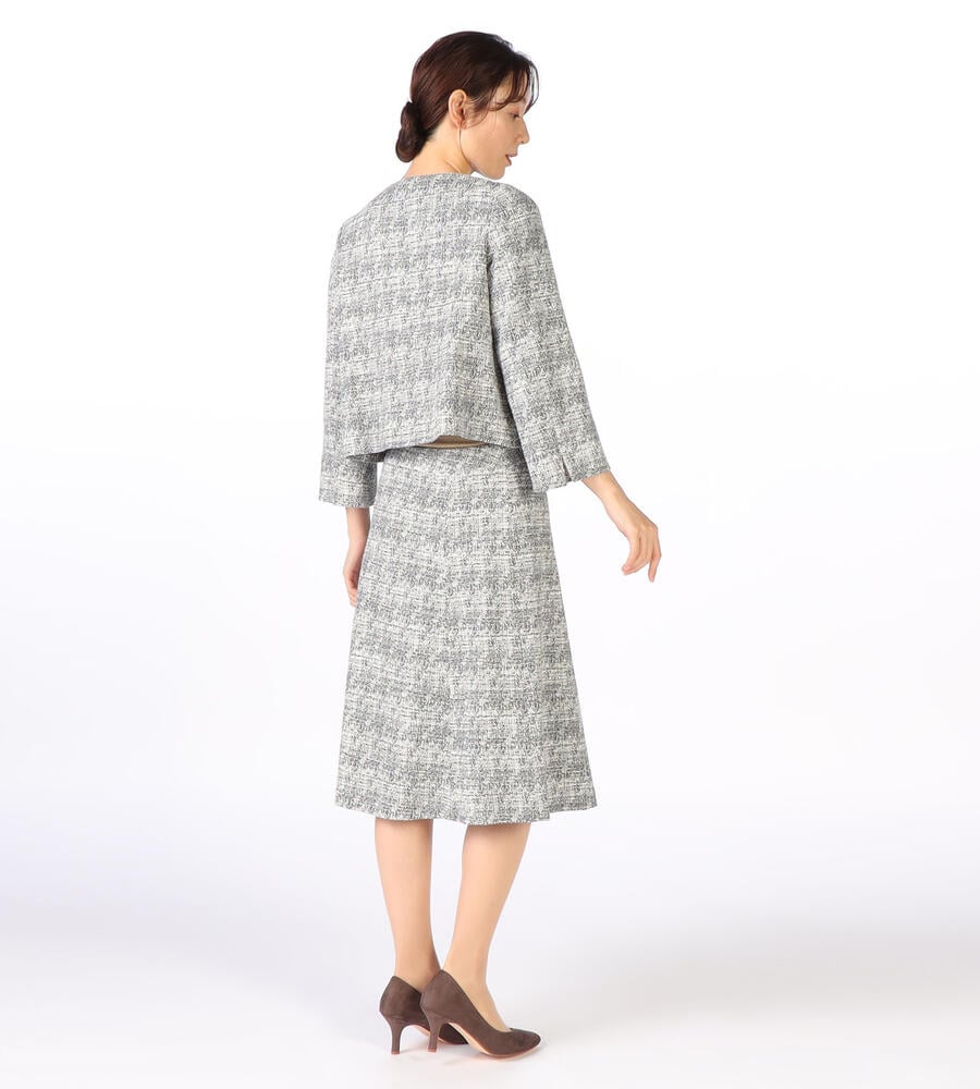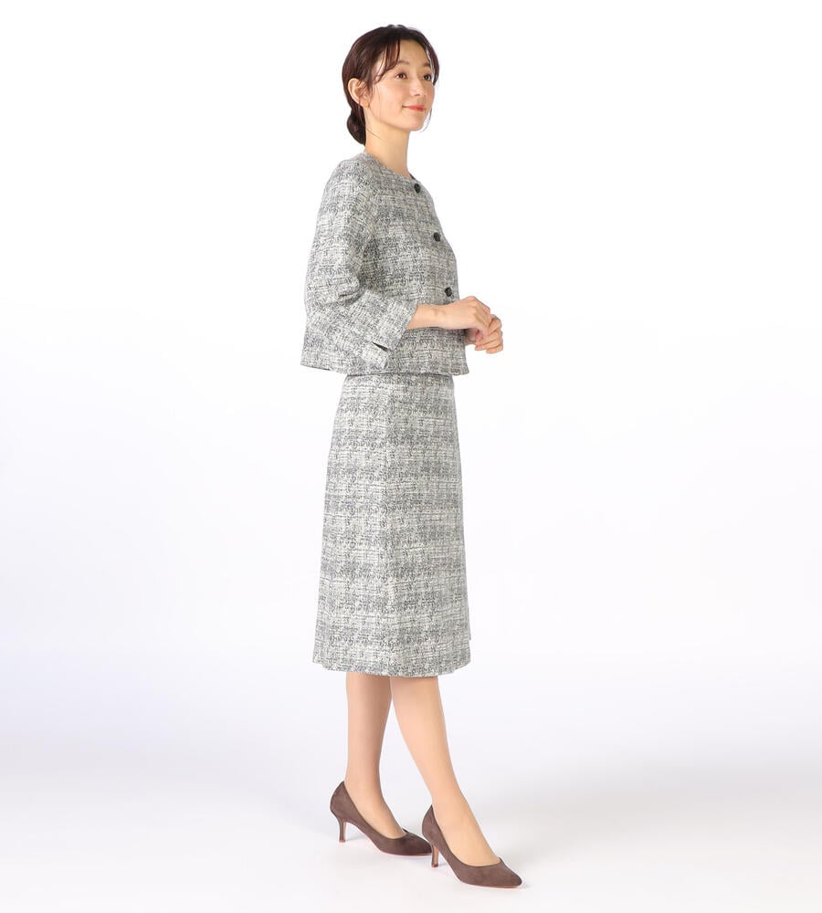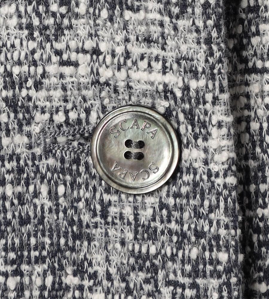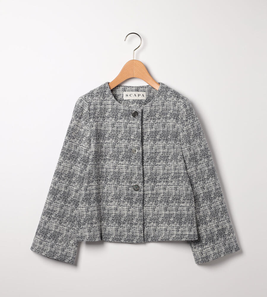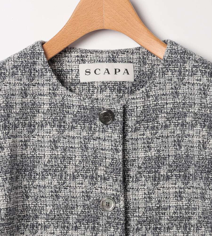 ツイード風ジャージーニットで仕立てたノーカラージャケットです。ツイードならではの上品さと、ジャージーならではの着心地の良さを両立。フロントのシェルボタンには、SCAPAのロゴがデザインされています。総裏仕立てで袖通ししやすく、きちんと感をしっかり備えた一着です。同シリーズのスカートに合わせてエレガントなセットアップスタイルを楽しめます。