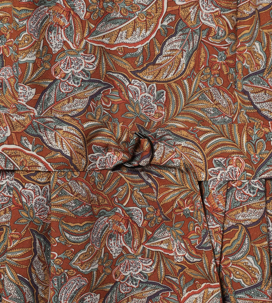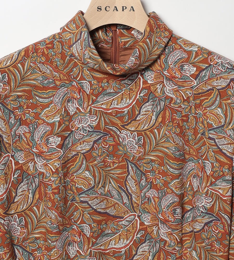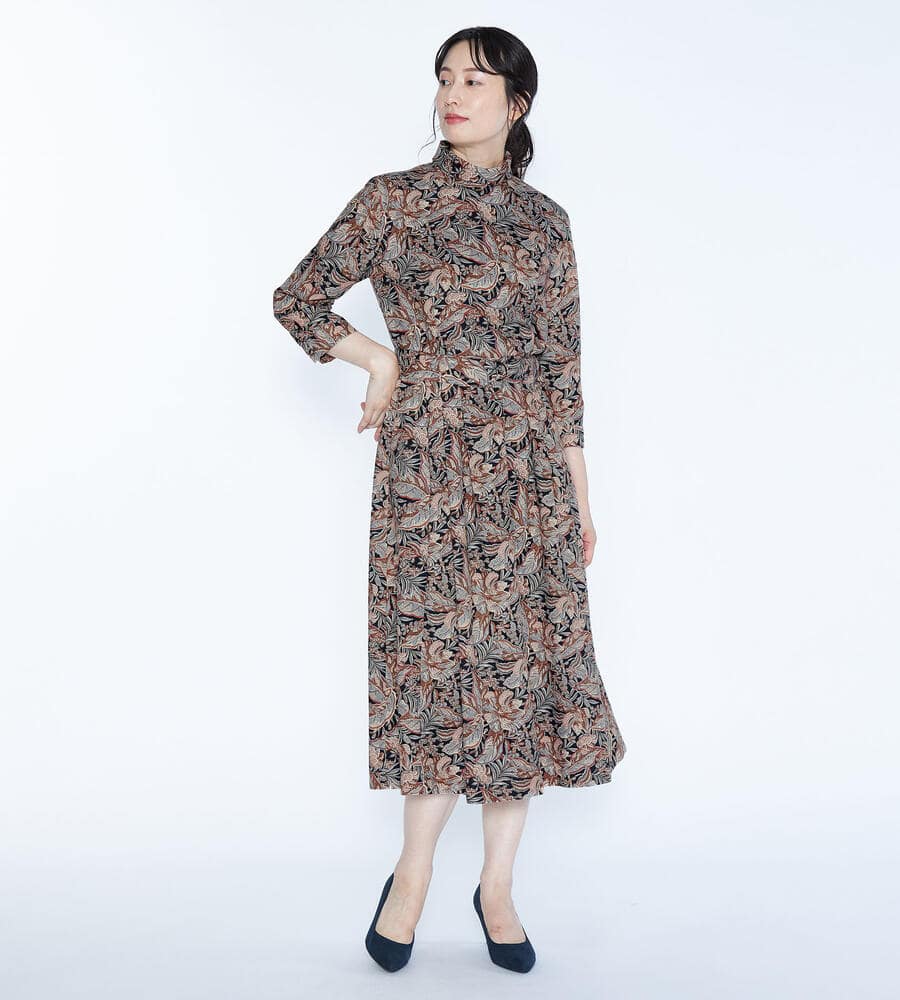 ポリエステルにウールを織り交ぜた、ソフトであたたかみのある素材を用いたワンピース。折り返したスタンドカラーや、ウエストを巻くするベルトが、エレガントな着こなしを後押しします。落ち着きのあるリバティプリントのペーズリー柄で、オリエンタルなエッセンスもプラス。裾に掛けて緩やかに広がるシルエットで立ち姿を美しく引き立てます。