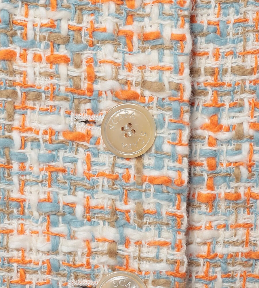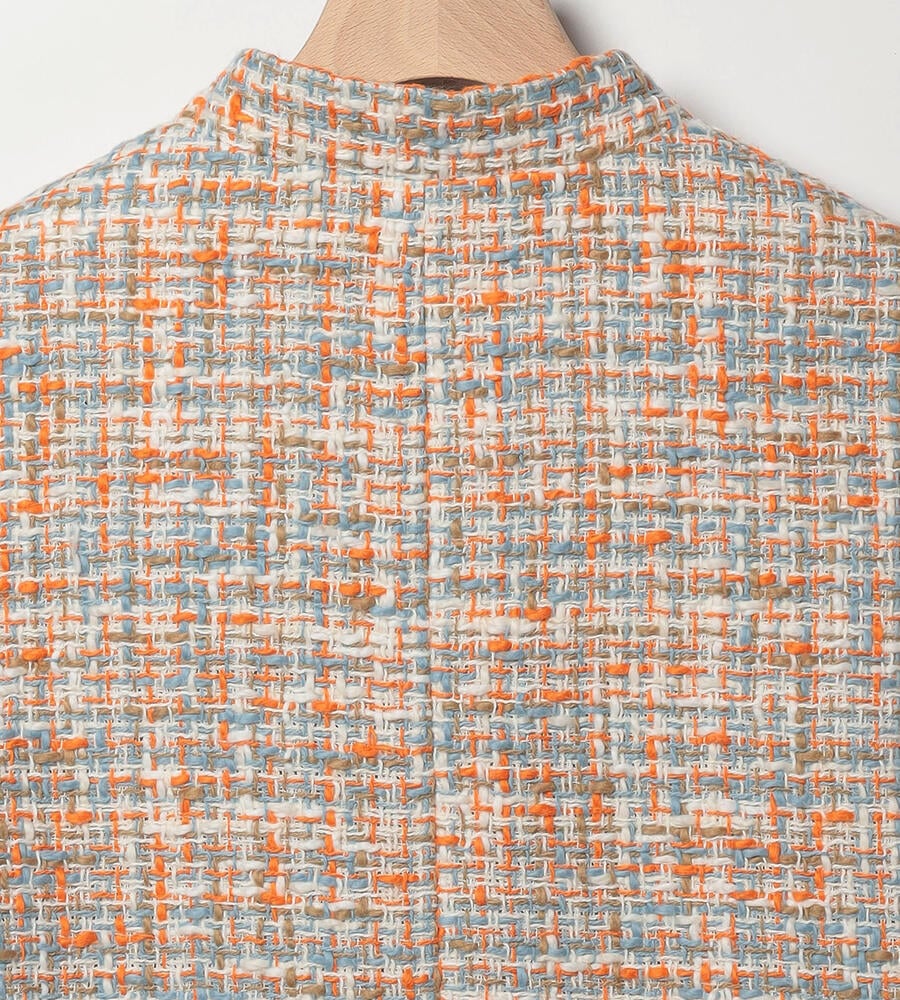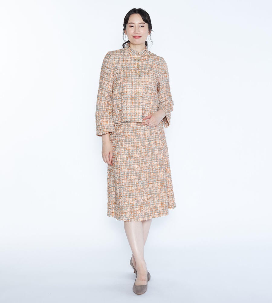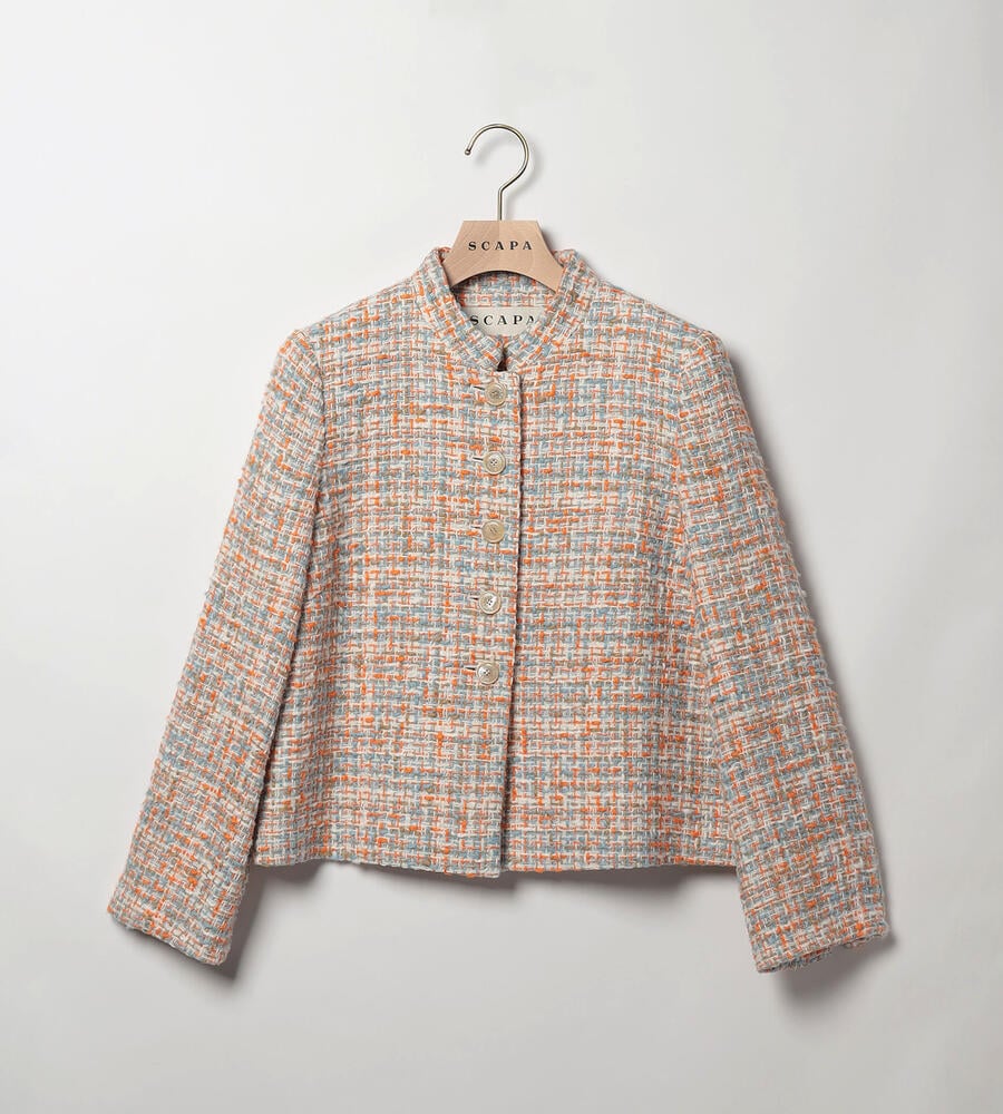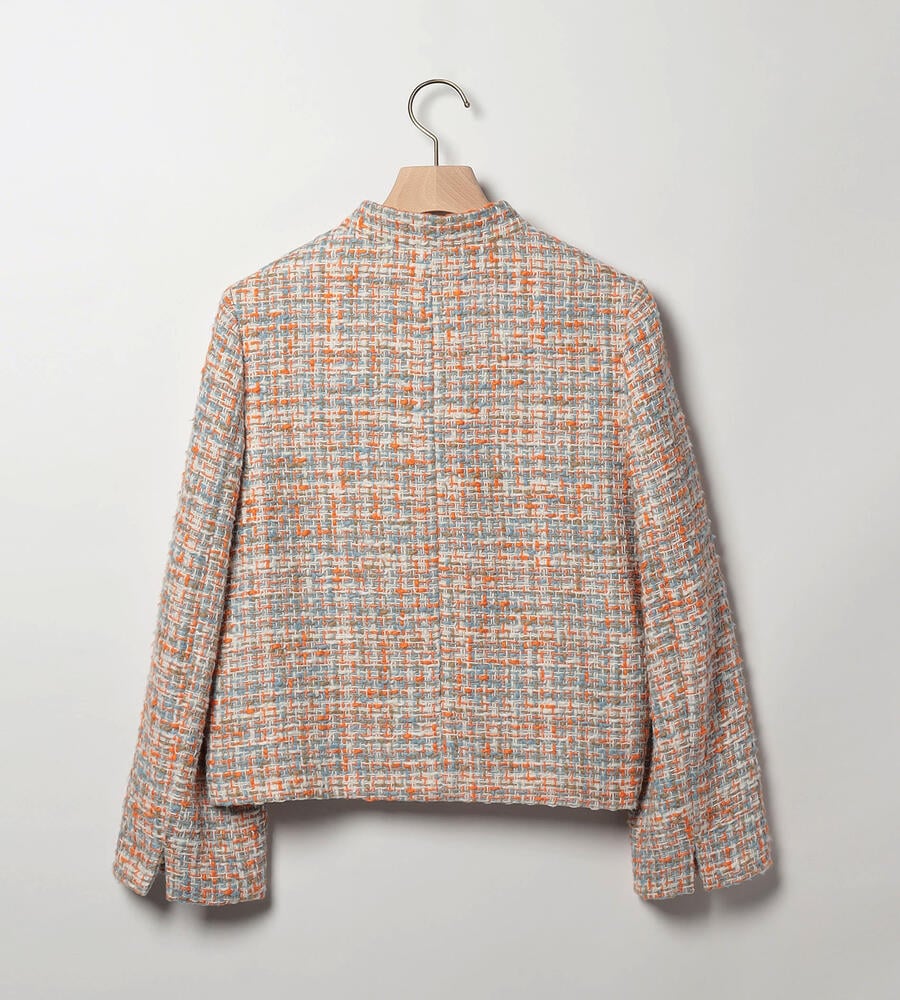 ポップな色彩でありながら、ツイード素材で淑女の気品を備えたジャケット。スタンドカラーを採用し、きちんとした印象に仕上げています。着丈は短めのため、量感のあるボトムスなどとも好相性。ざっくりとしたツイードの質感で、秋冬らしい温もりのある着こなしを楽しめます。同素材のスカートとのセットアップもお楽しみいただけます。
