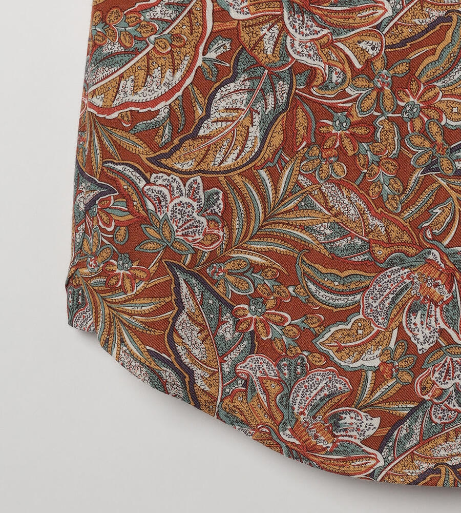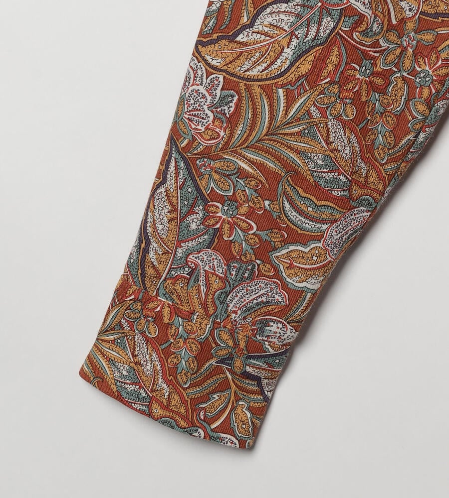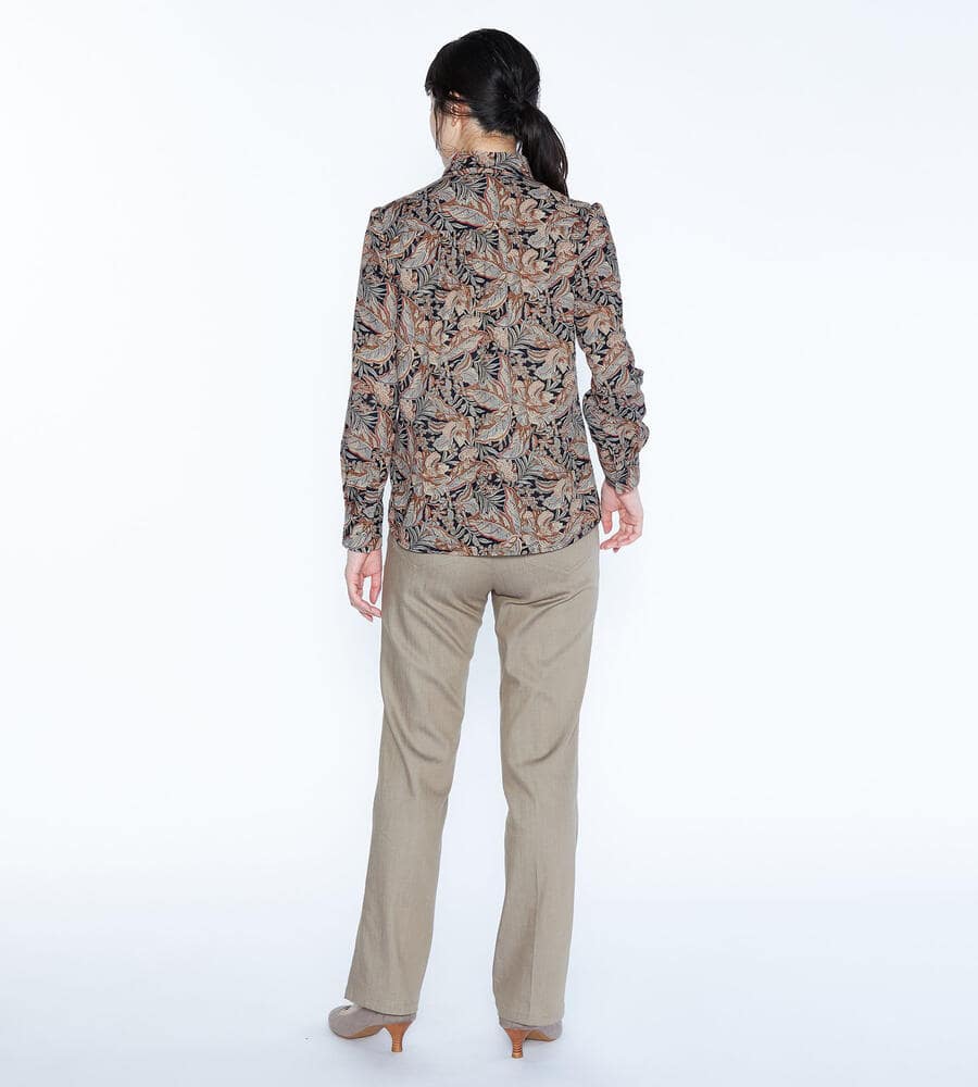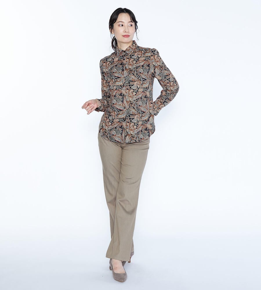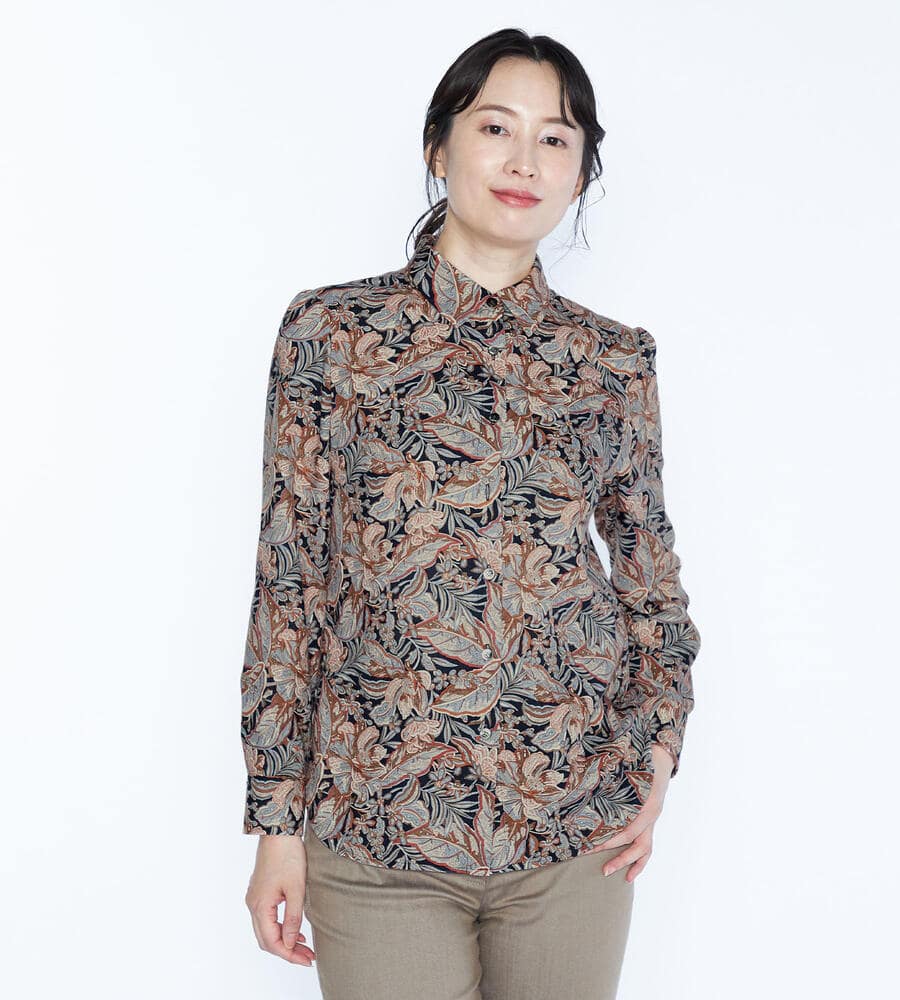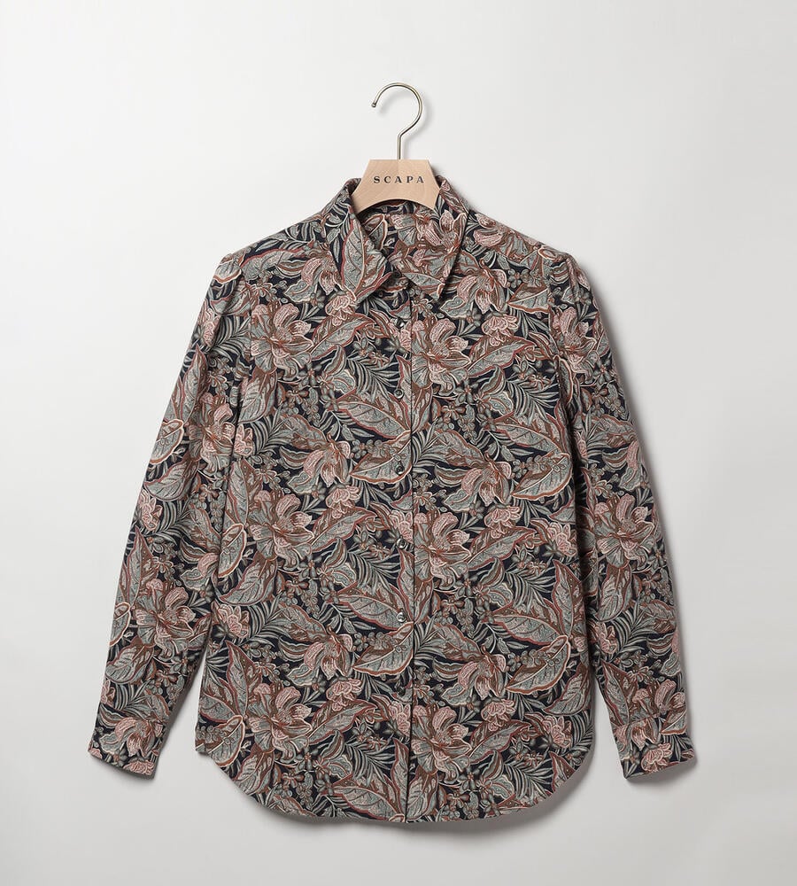 オリエンタルな趣きを感じさせる、ペーズリー柄のリバティプリントを用いたシャツ。シンプルながらもクラシカルな仕立てで、淑女の気品を備えた1点です。身体に付かず離れずのシルエットは、ジャケットなどのインナーとしても最適。ポリエステルベースのウール混素材で、季節感のある着こなしを楽しめます。