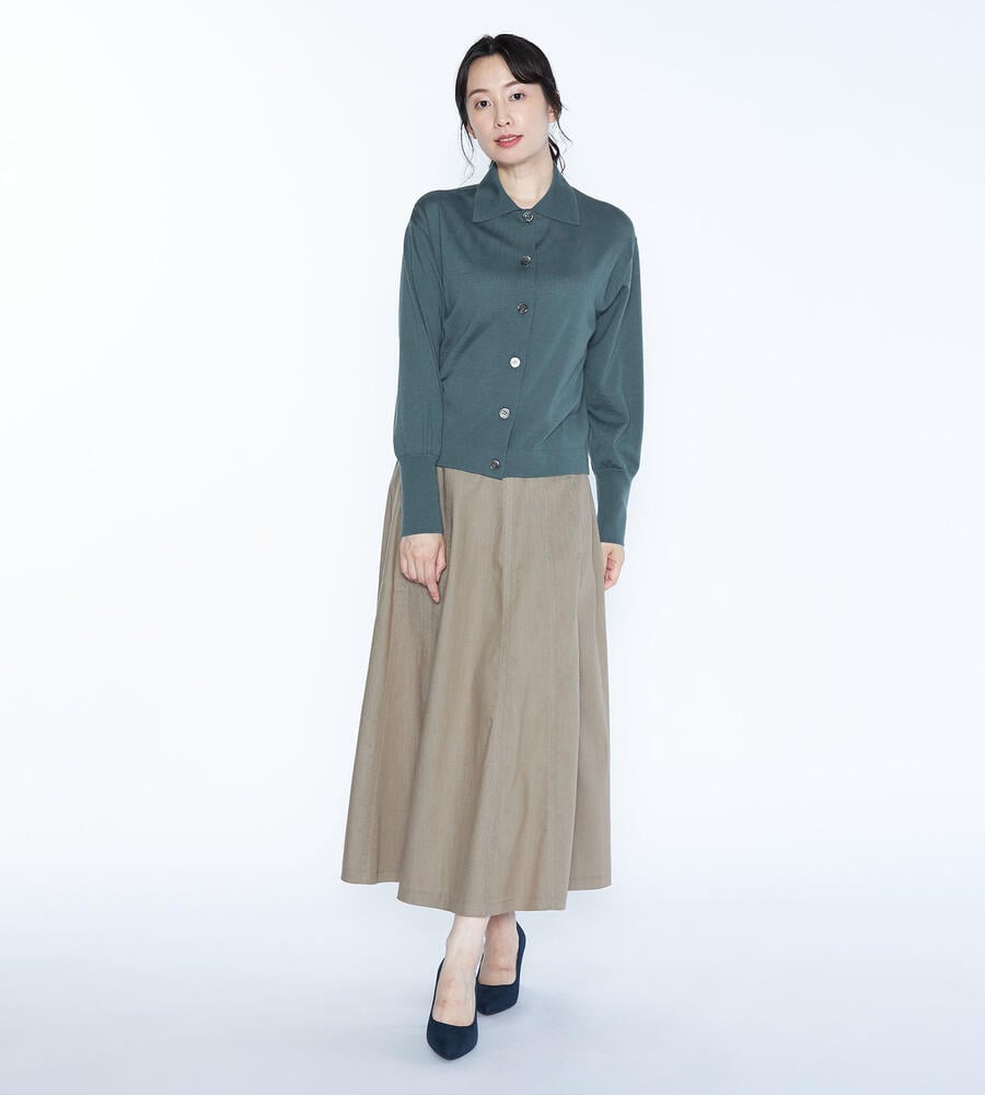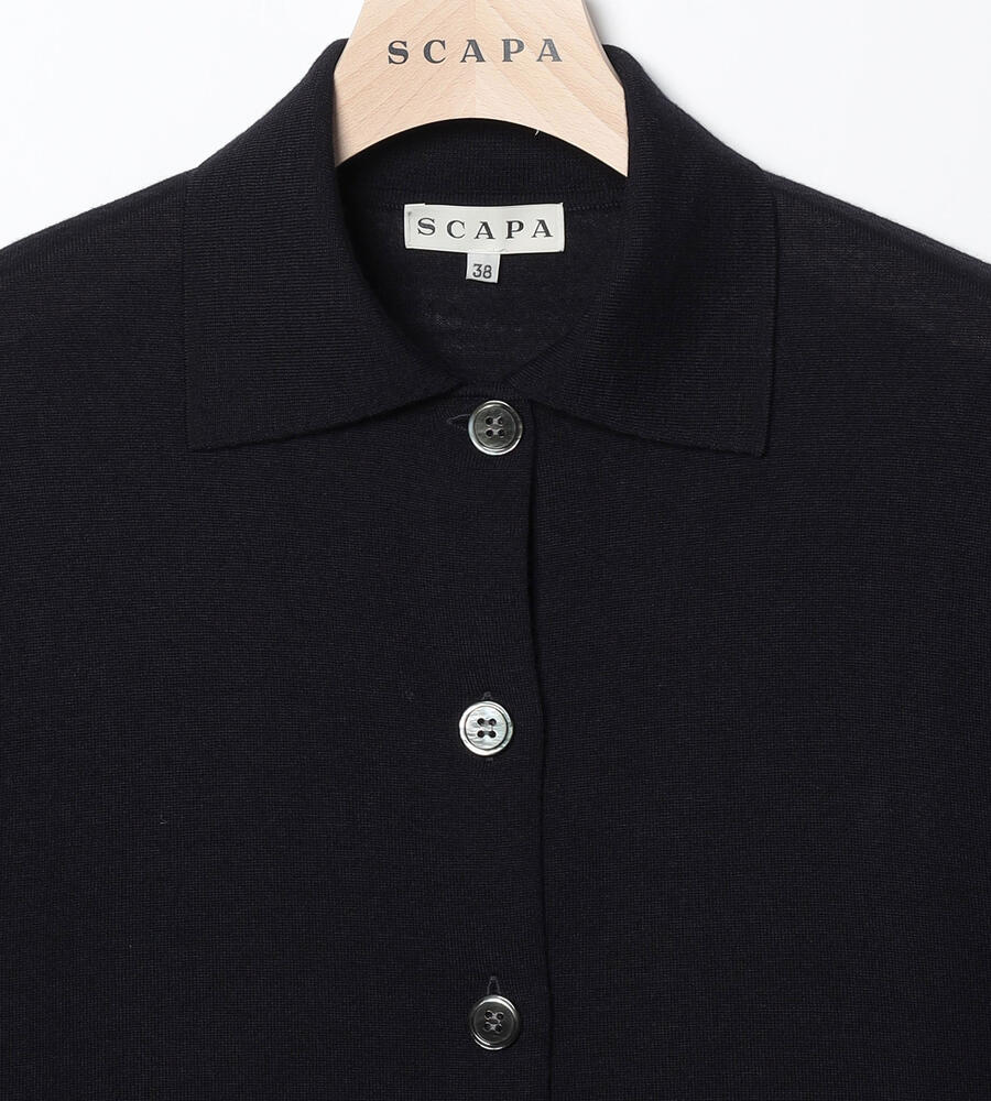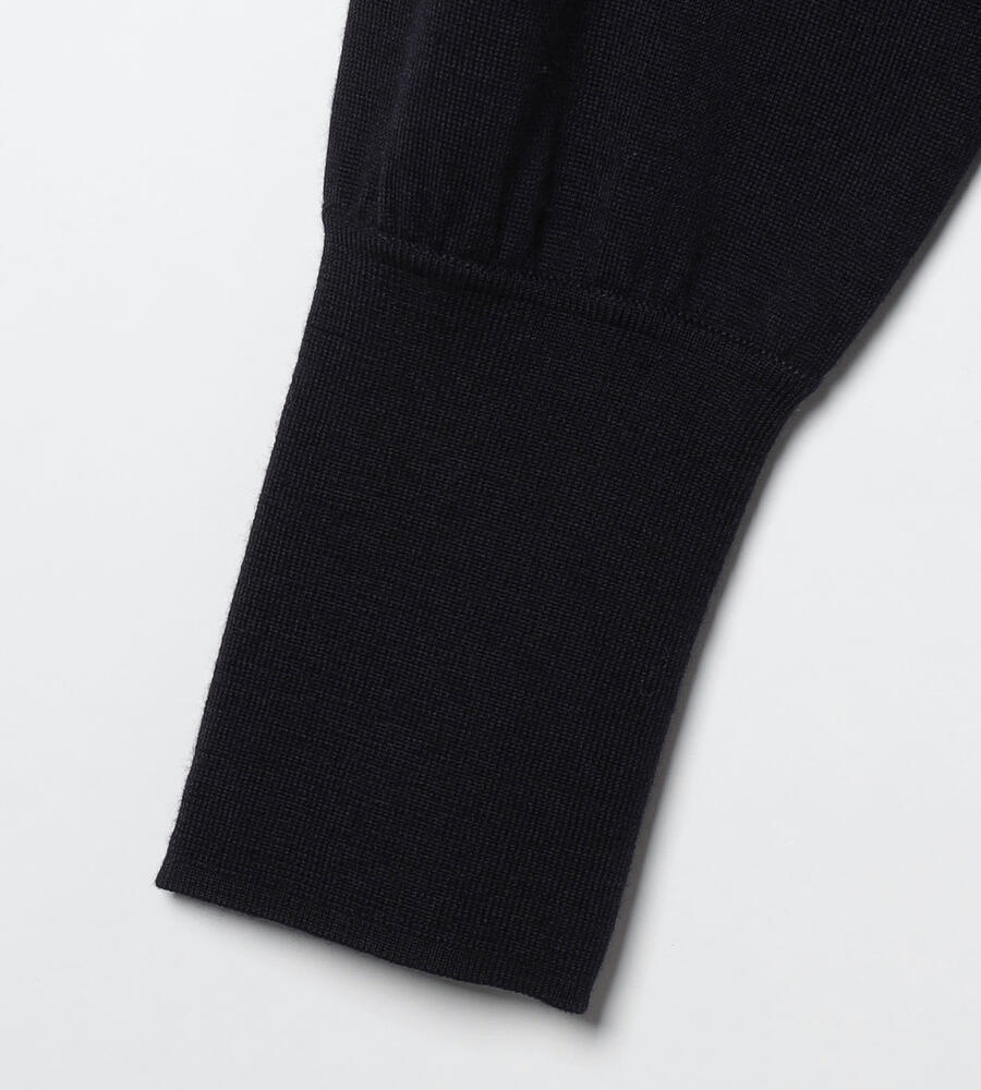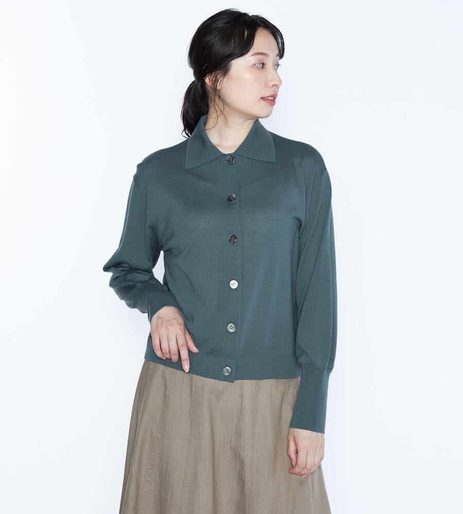 衿付きのデザインで今季らしい表情に仕上げた、エレガントなハイゲージニットカーディガン。肌触りの良い毛100%素材を採用。腕まわりにゆとりのあるドロップショルダー。艶のあるエレガントなフロントボタン、袖先のロングリブ切り替えもポイントです。