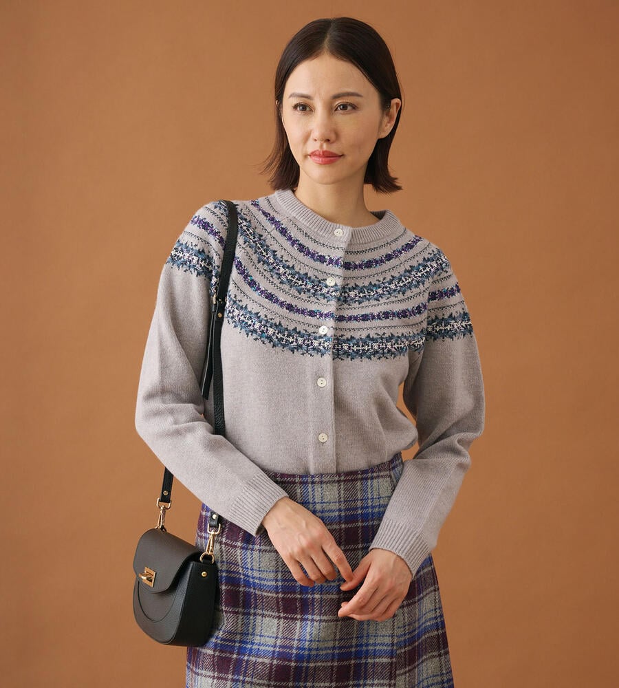 モダンな雰囲気を取り入れたフェアアイル柄がシーズンムードを演出してくれるニットカーディガン。部分的に柄をあしらうことで、メリハリのある表情に。デニムカジュアルからきれいめスタイルまで、合わせるボトムス次第でコーディネートの幅が広がるアイテムです。